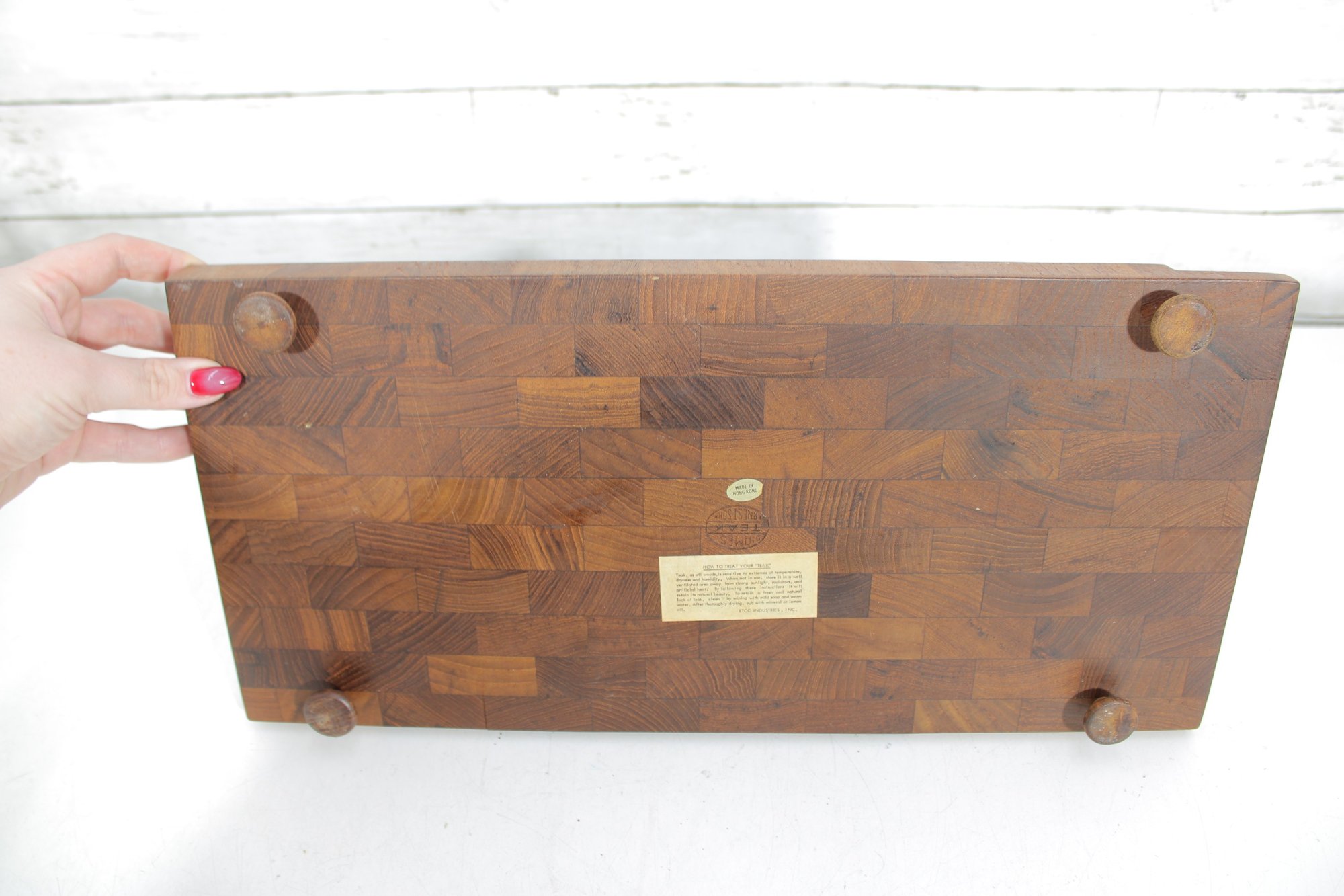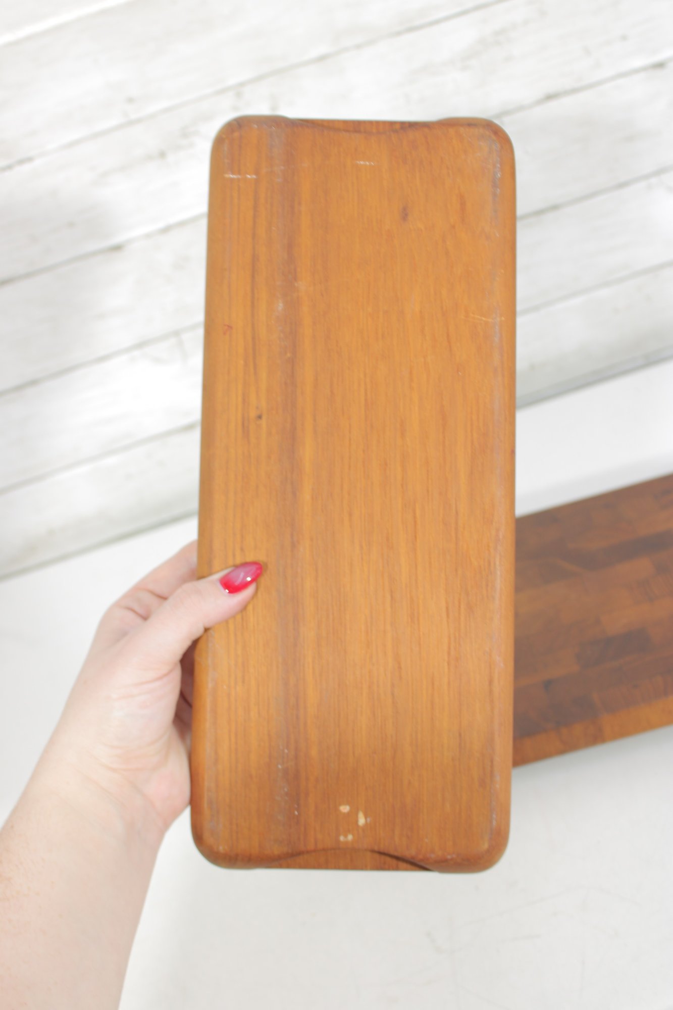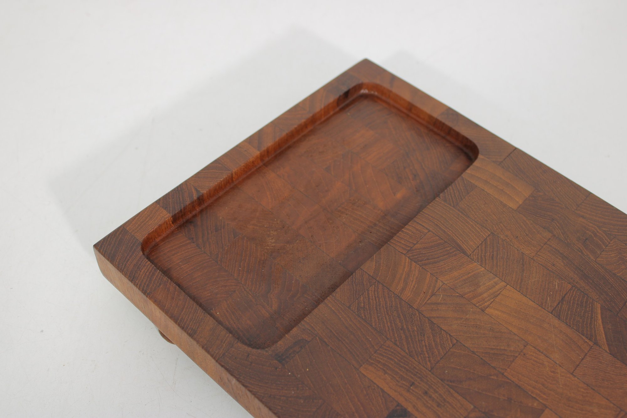 Crafted from quality teak wood, both trays display a rich grain pattern and timeless appeal. The underside retains original markings/labels indicating Dansk origin.
