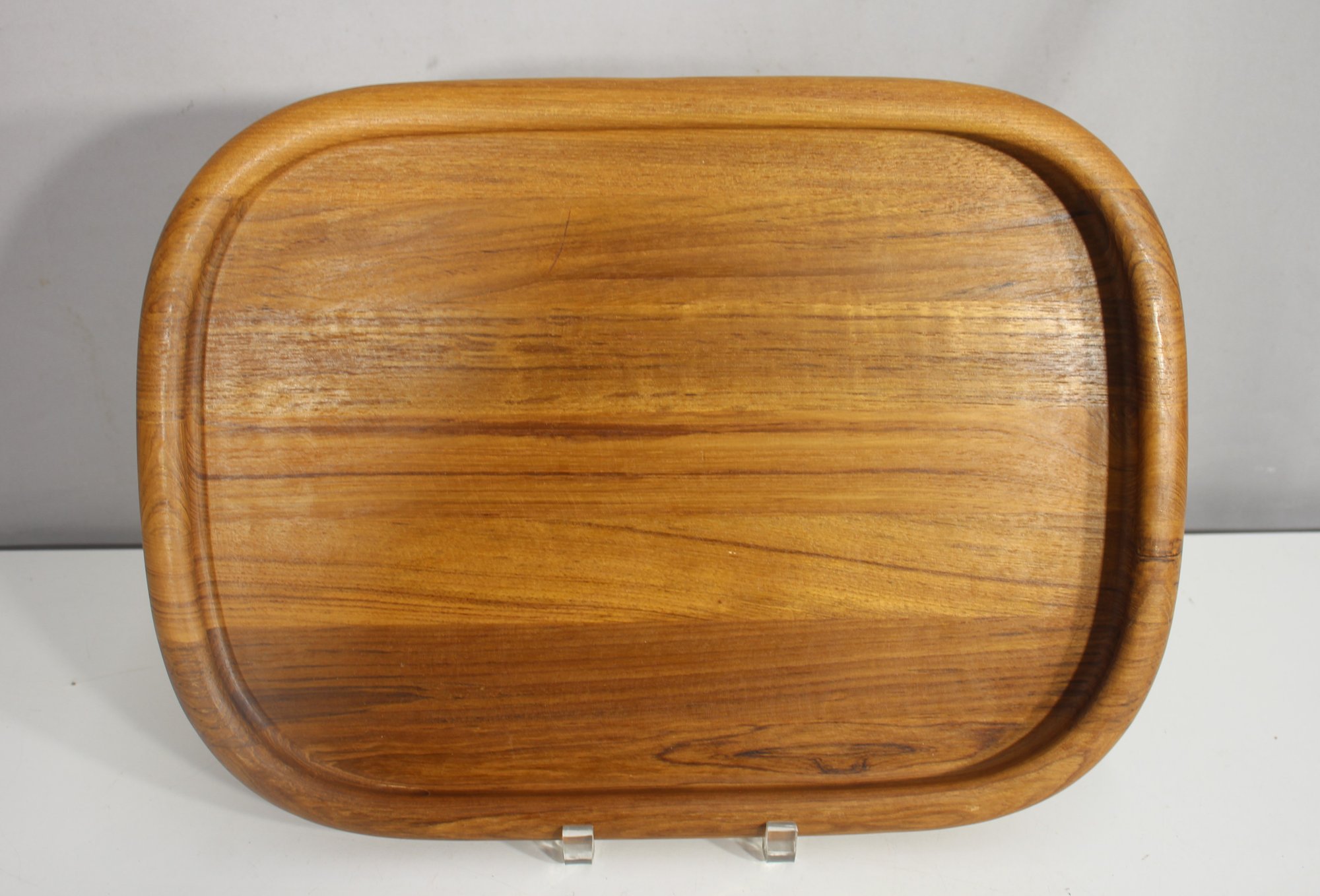 Elevate your serveware collection with this stunning vintage Dansk teak wood serving tray. Measuring 17 inches by 12.5 inches, this tray features a smooth, curved edge and a beautifully grained teak wood surface. Designed for both function and style, it's perfect for serving drinks, appetizers, or as a decorative piece in a mid-century modern setting.