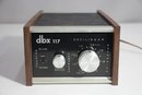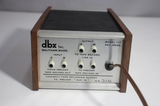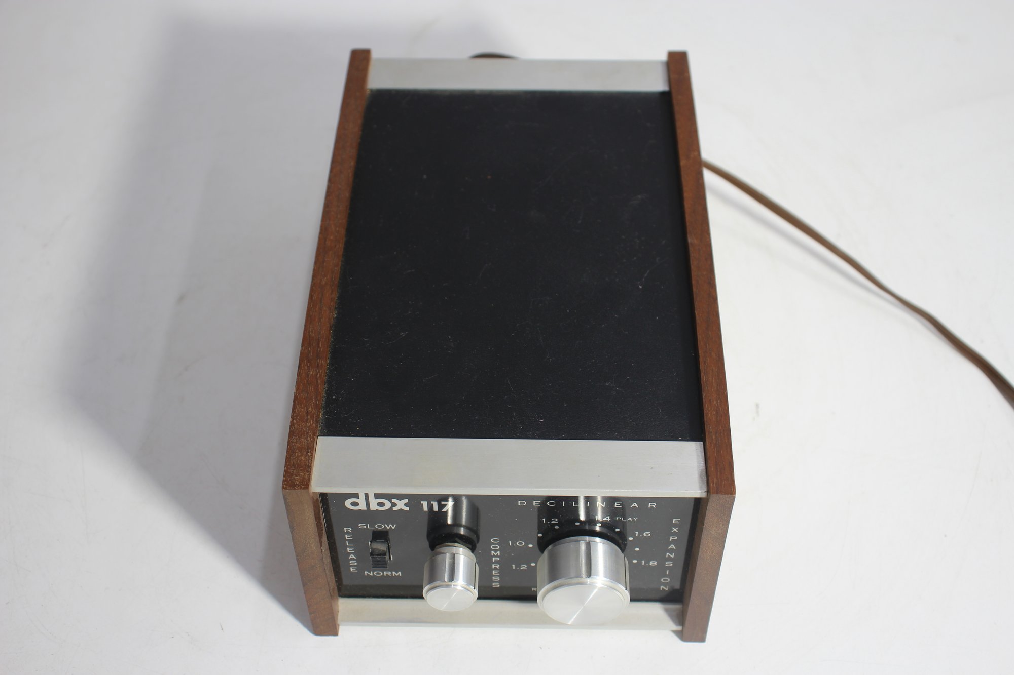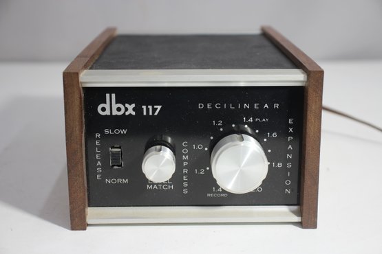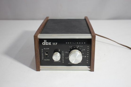 a vintage DBX 117 Decilinear audio compressor/expander. This classic piece of audio equipment from DBX Inc., Waltham, Mass., is designed for enhancing sound quality by dynamically compressing or expanding the audio signal. The unit features a solid metal and wood housing, standard RCA inputs/outputs, and adjustable compression and expansion controls.