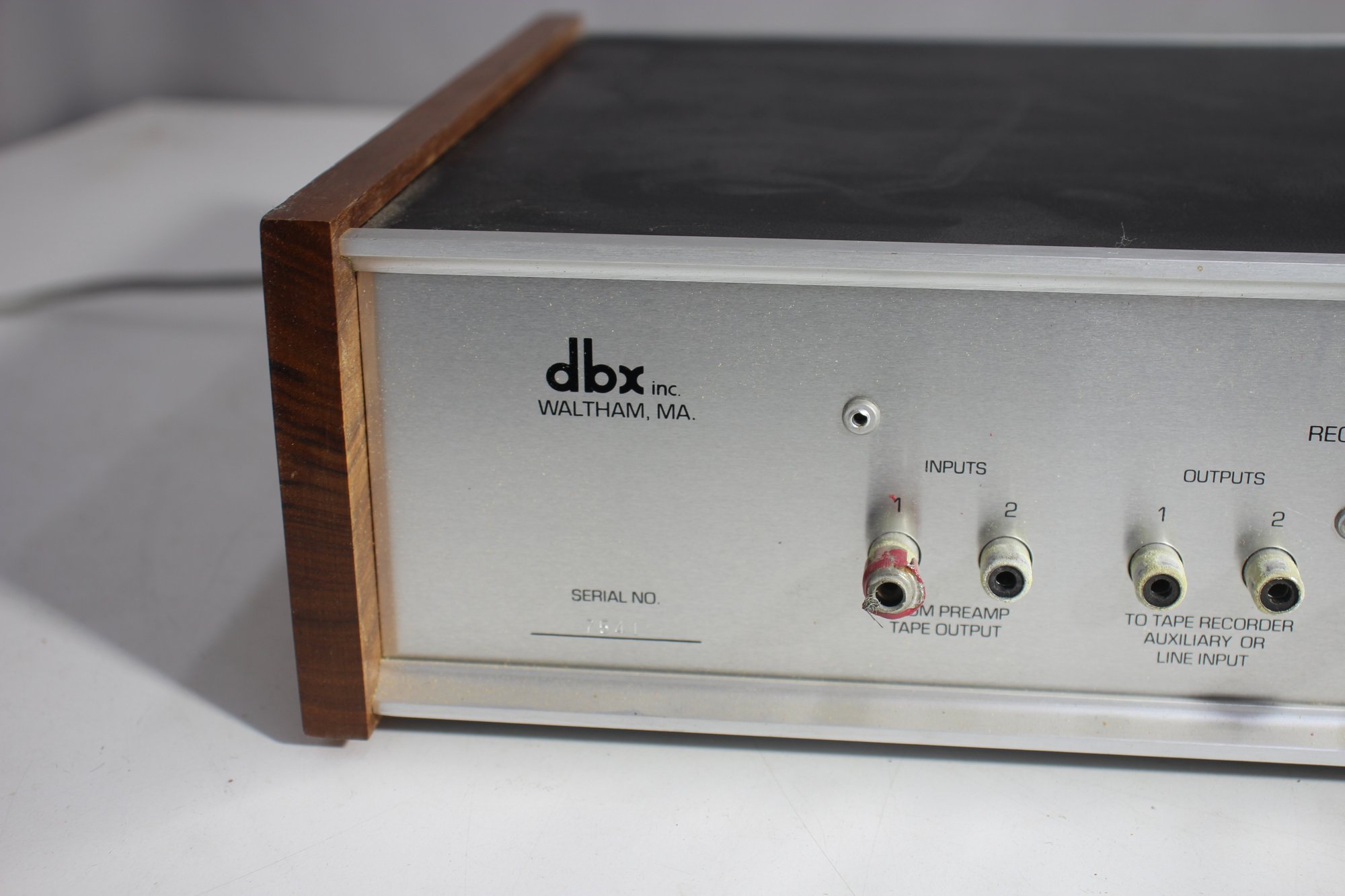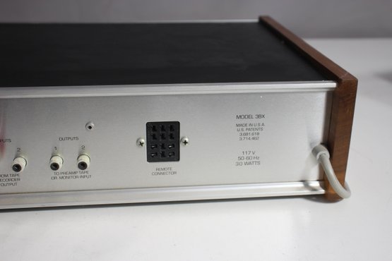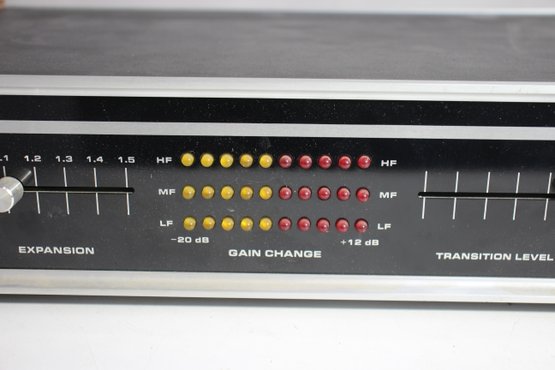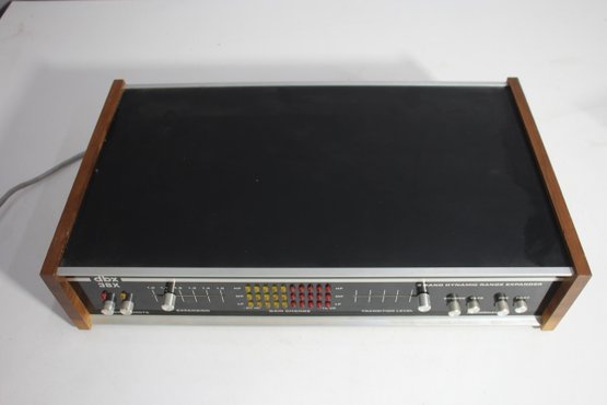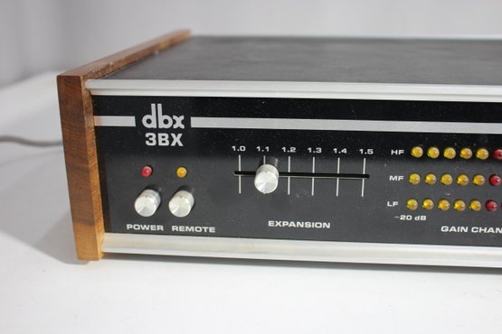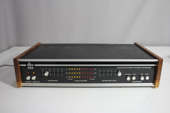 a classic DBX 3BX 3-Band Dynamic Range Expander, an iconic piece of vintage audio equipment. This unit features an aluminum faceplate with retro wood panel sides, combining aesthetic appeal with high-quality performance. Designed to enhance audio playback by expanding the dynamic range, it offers controls for expansion, gain change, and transition level. The rear panel includes multiple RCA input/output options, making it compatible with a variety of audio setups.