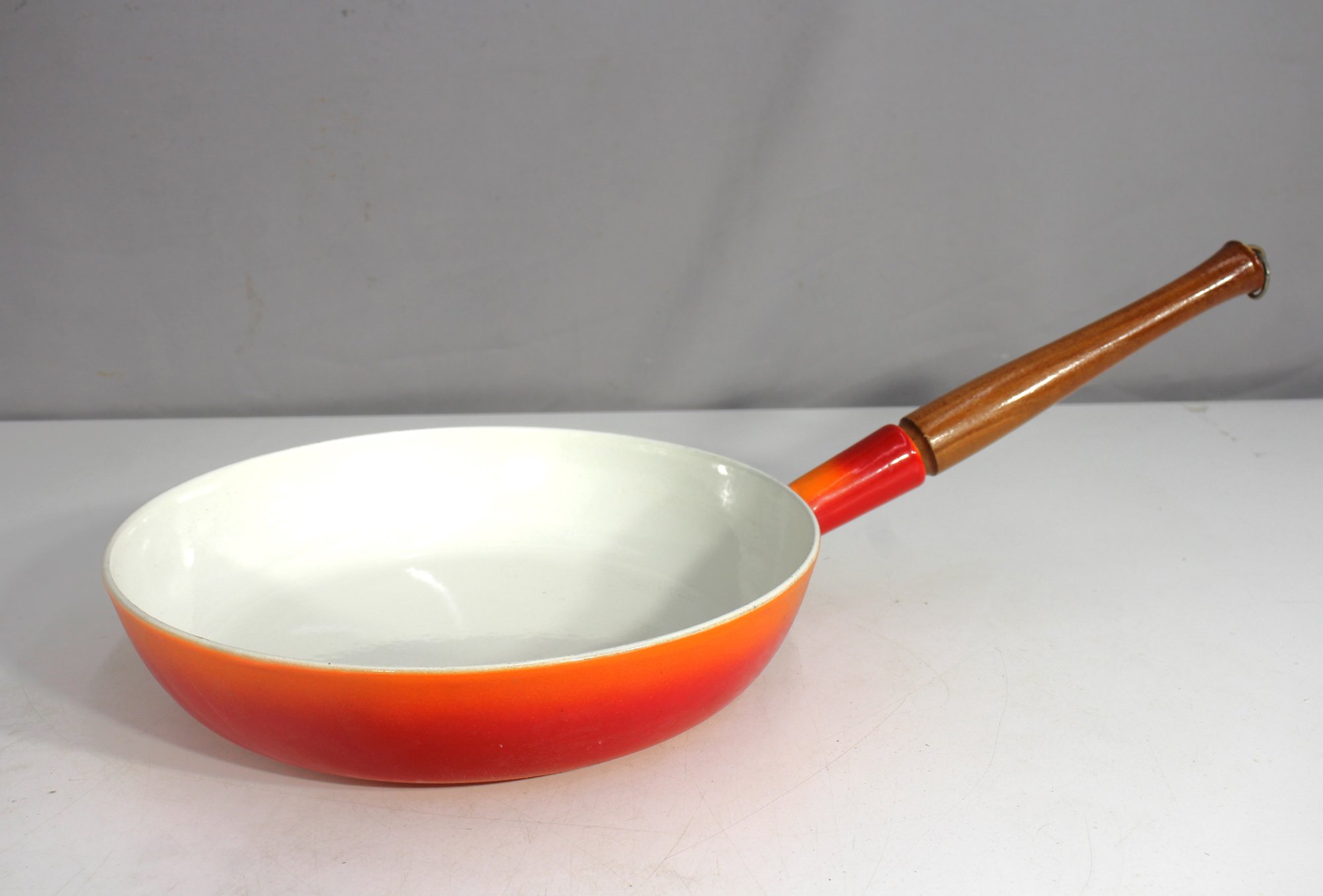 a vintage 11-inch round Descoware Belgium enamel cast iron skillet in a stunning flame orange gradient finish. This high-quality, Made in Belgium piece is a collectible mid-century cookware item, popularized by Julia Child for its durability and even heat distribution.