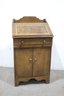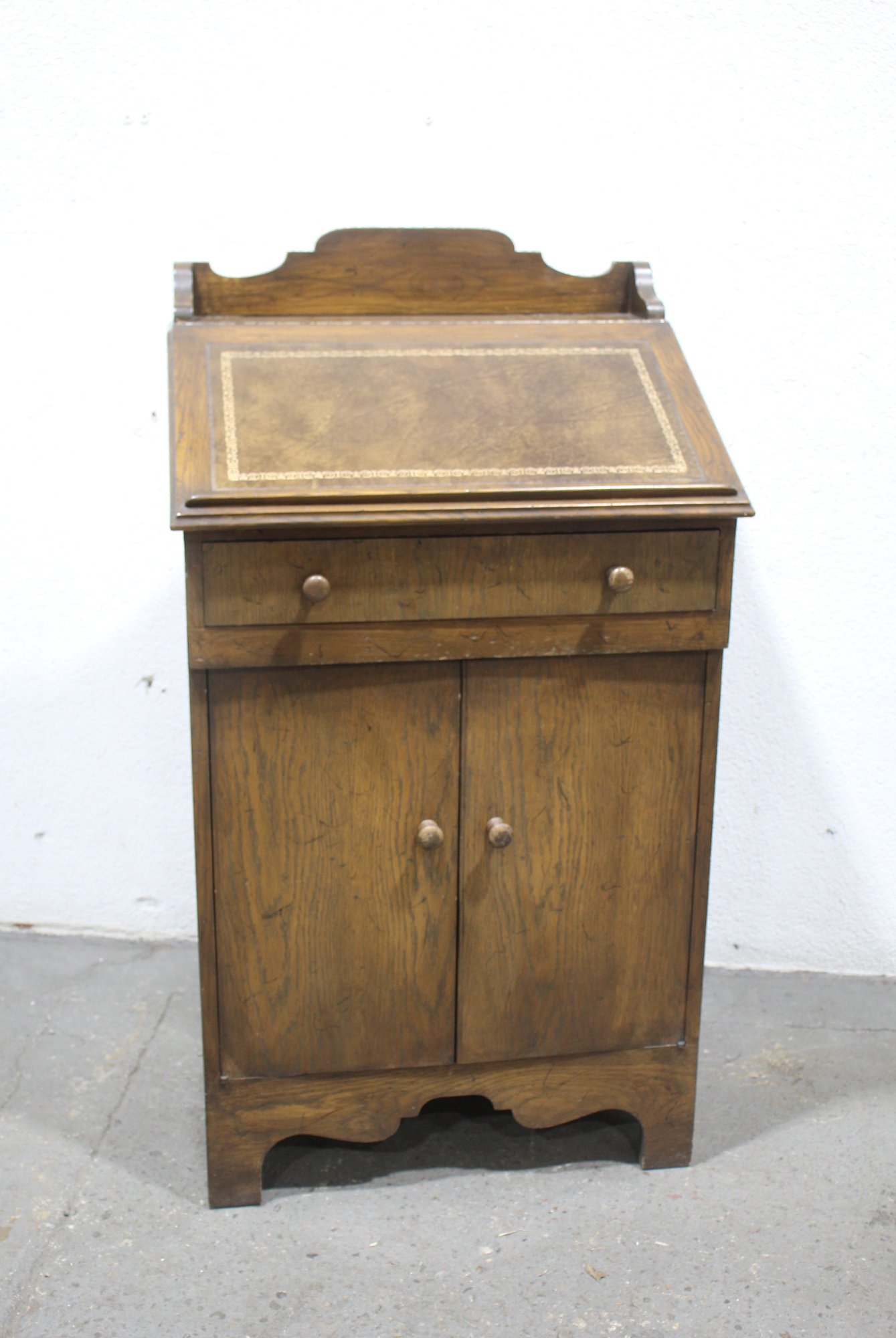 it features a convenient writing table with a leather inset, perfect for correspondence or as a quaint workspace.with a single drawer and shelves for storage