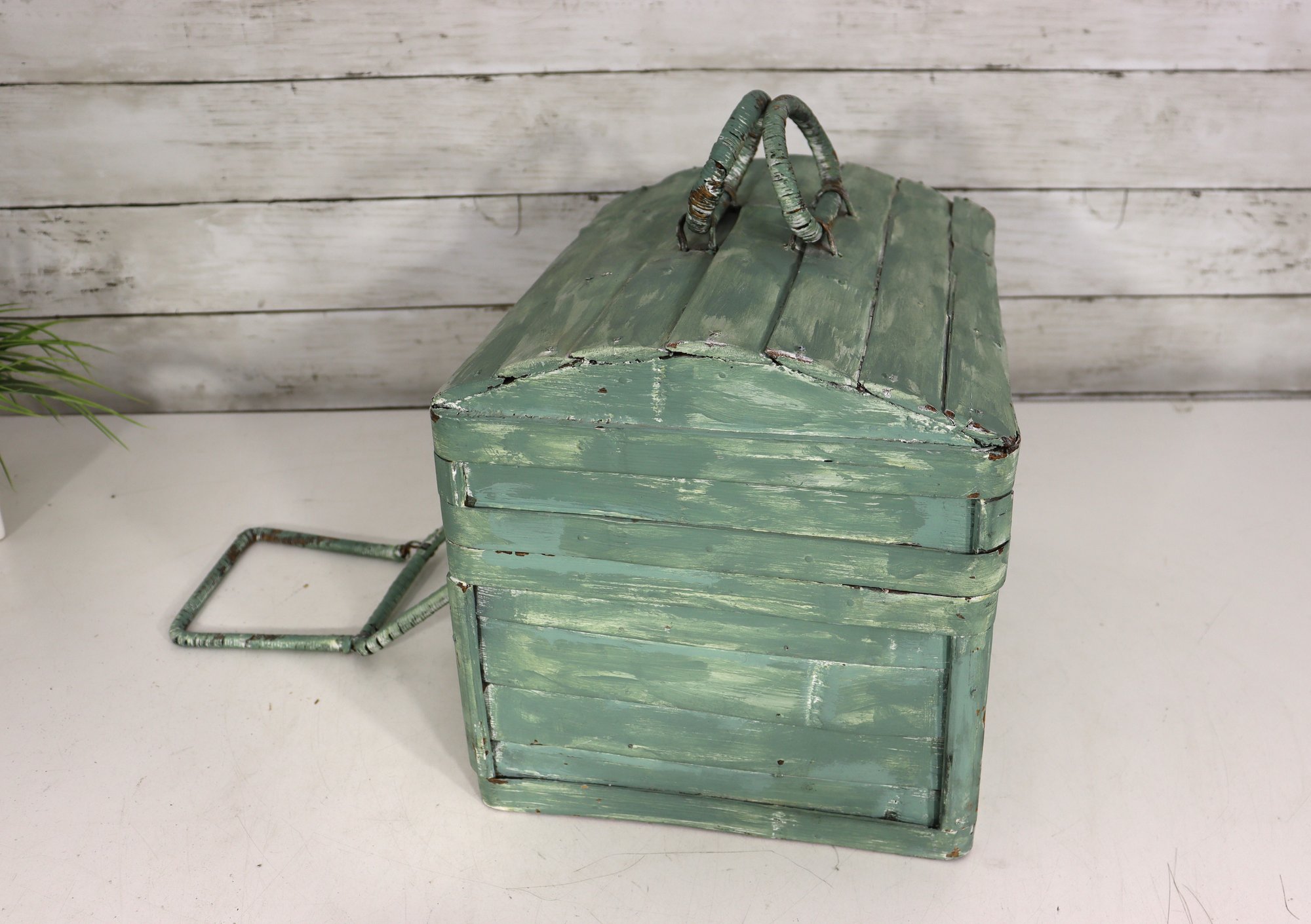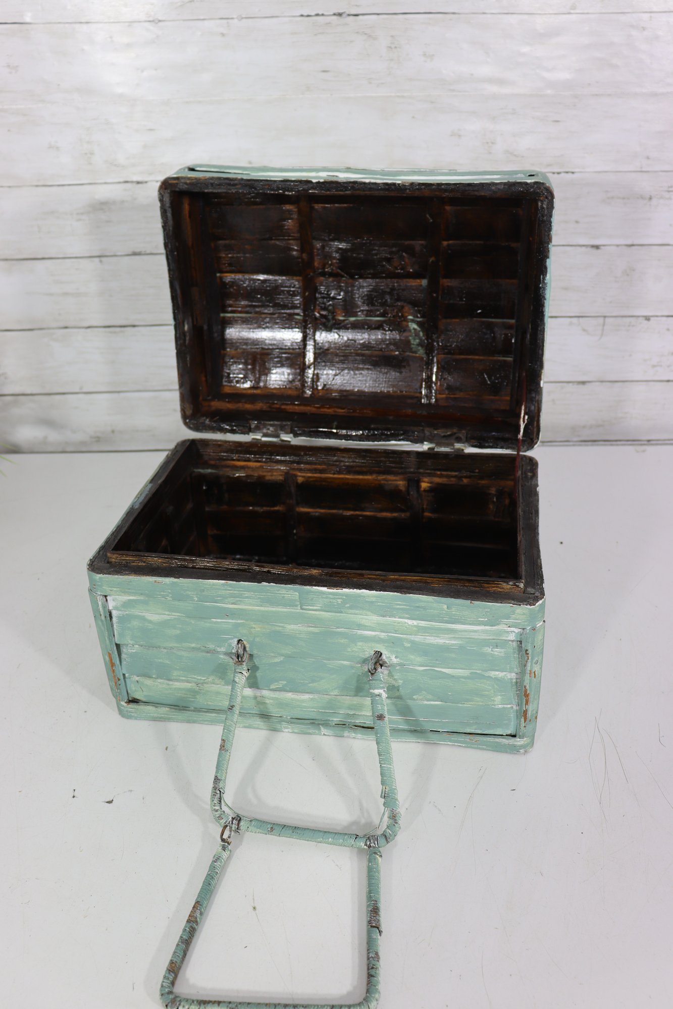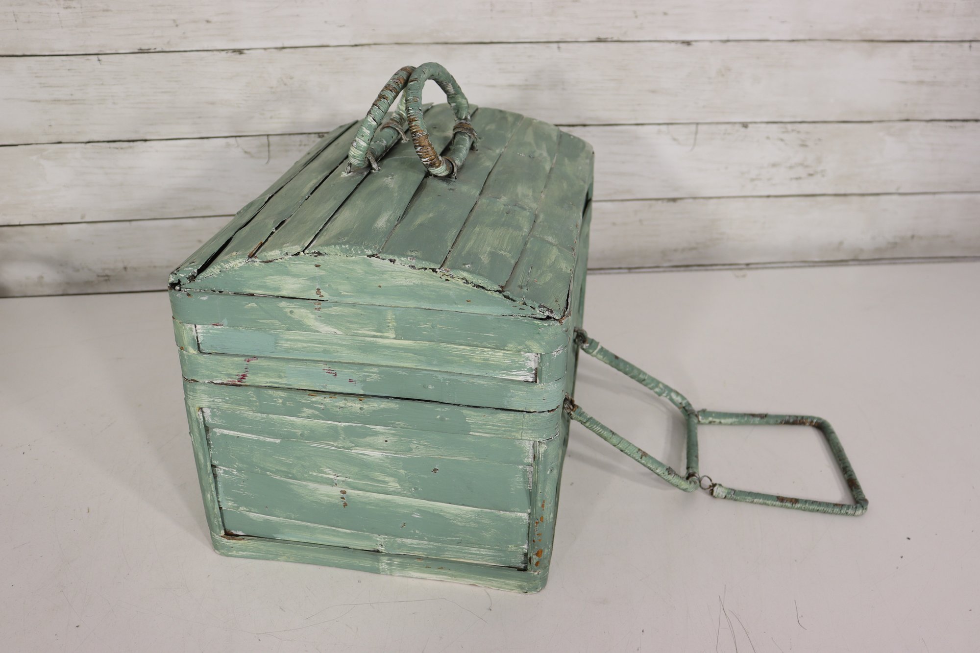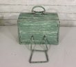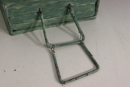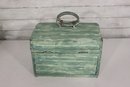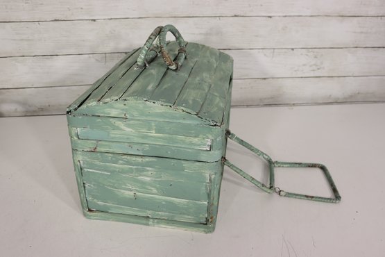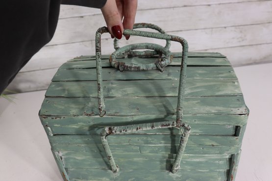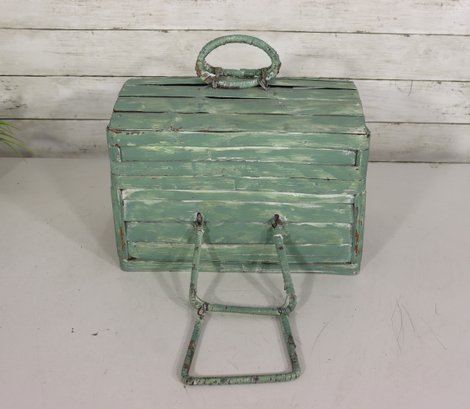 Wonderful rustic vintage wooden storage box with hinged lid and distressed green painted exterior. Features a top carry handle and metal wire front hardware detail giving it a unique primitive / country farmhouse look. Interior is dark stained wood. Charming aged character throughout!