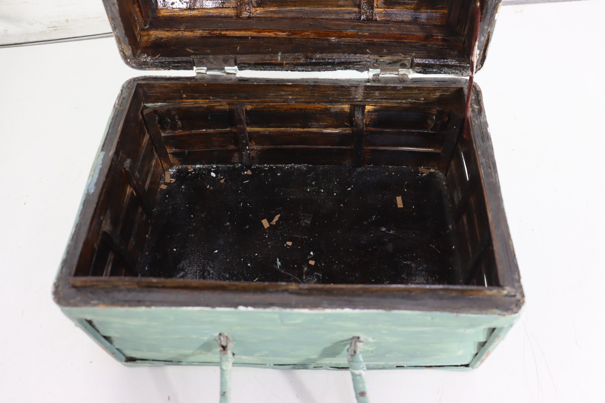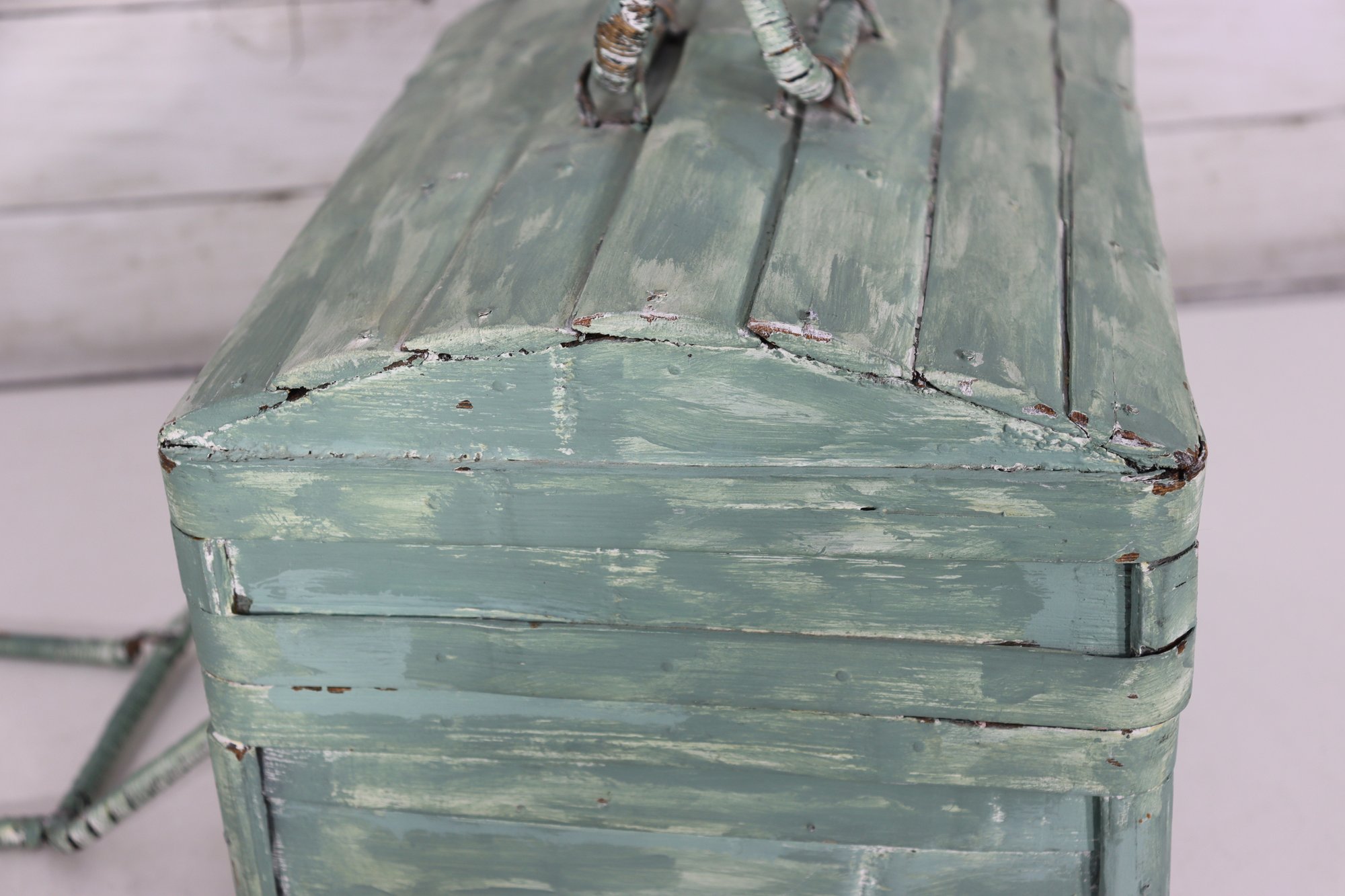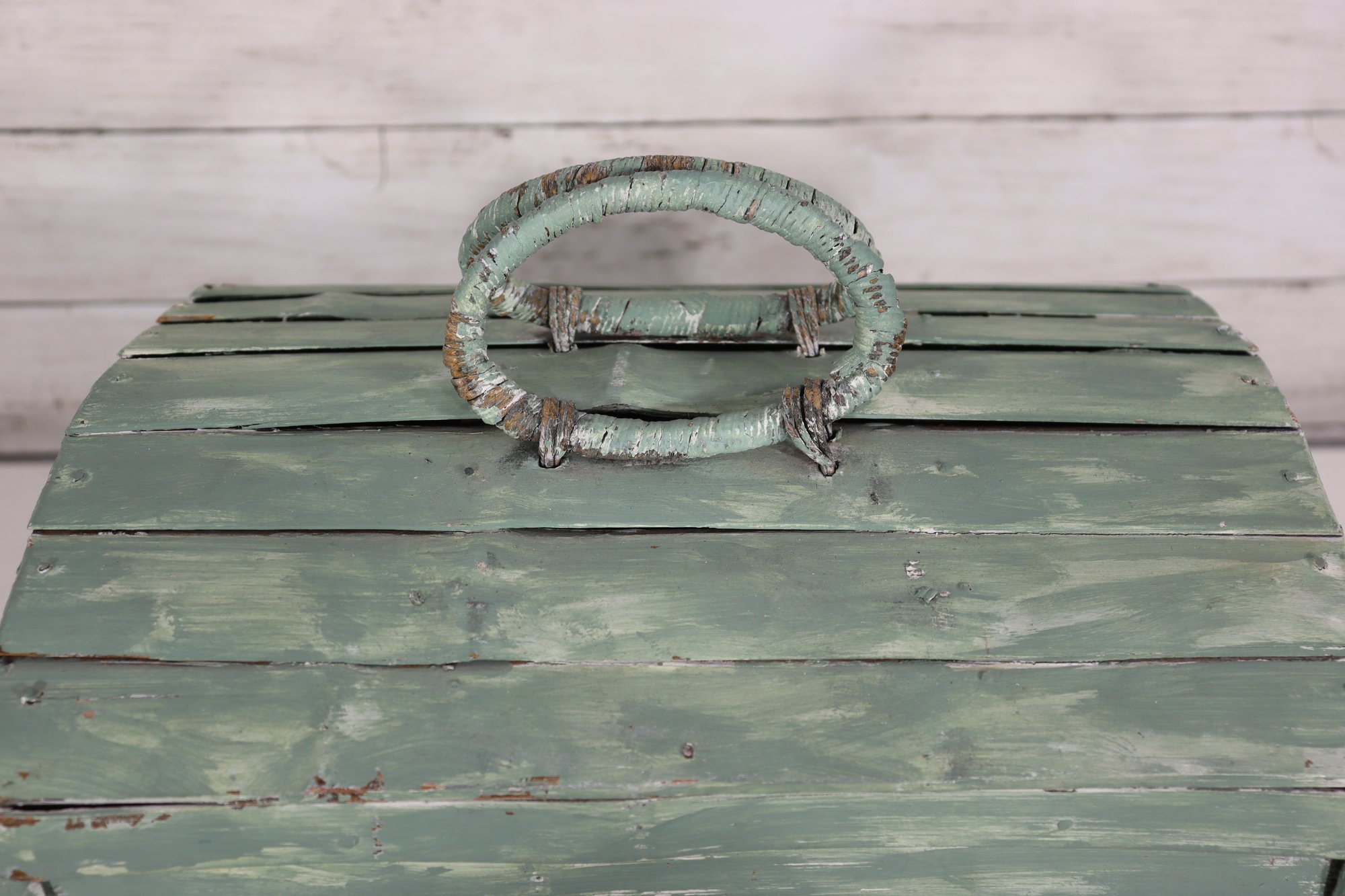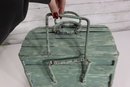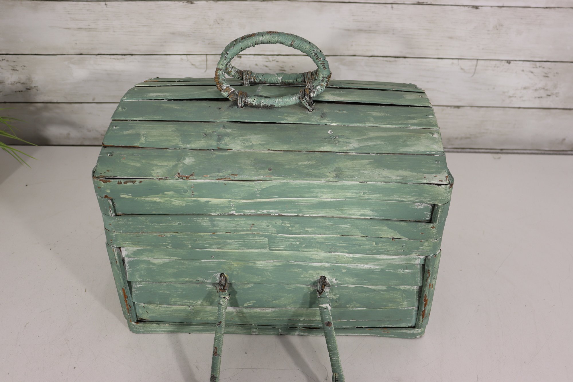 Wonderful rustic vintage wooden storage box with hinged lid and distressed green painted exterior. Features a top carry handle and metal wire front hardware detail giving it a unique primitive / country farmhouse look. Interior is dark stained wood. Charming aged character throughout!