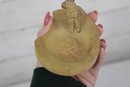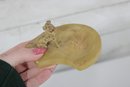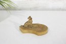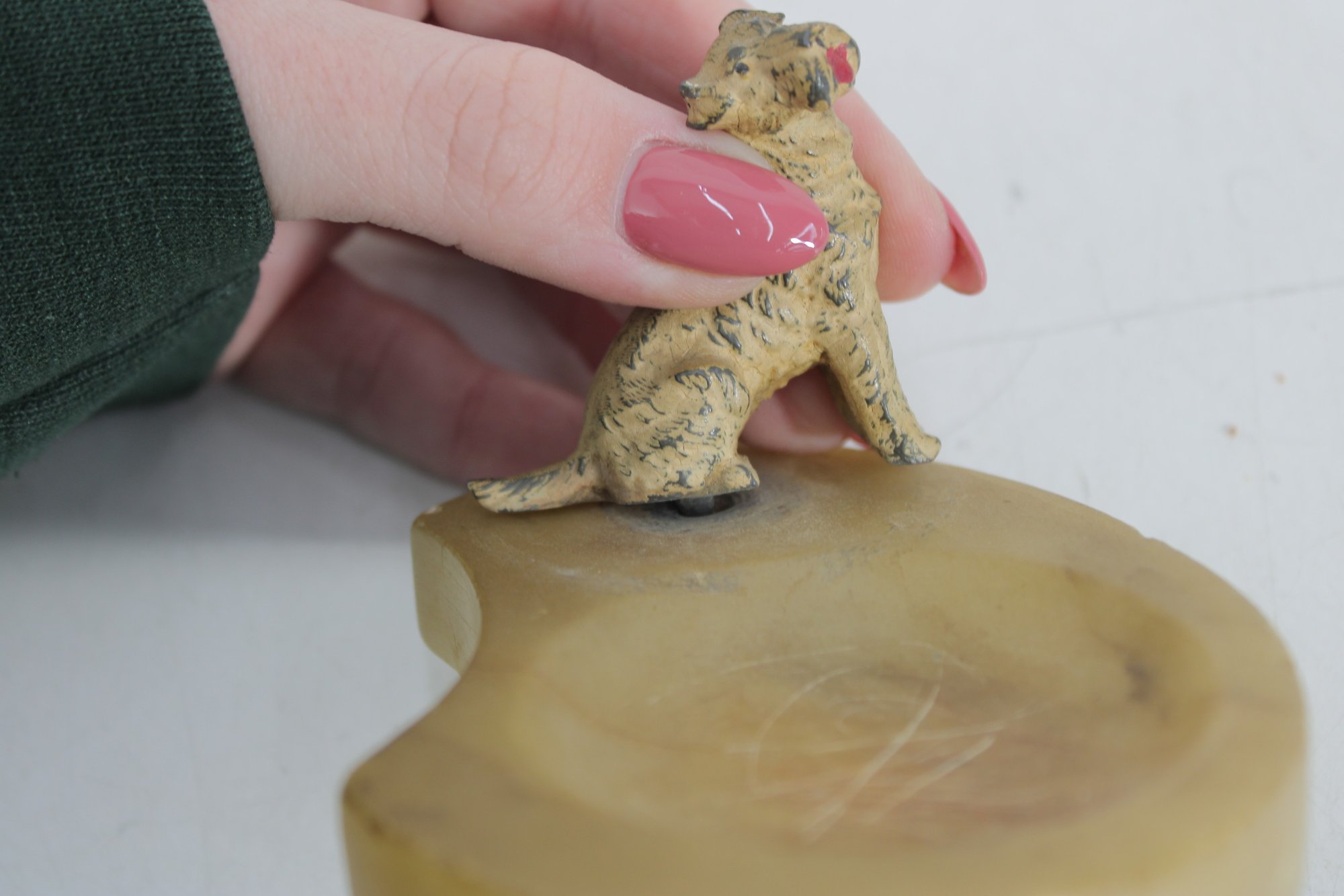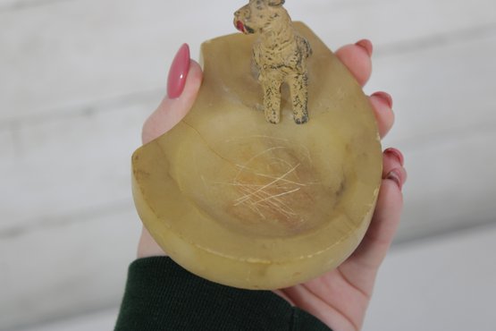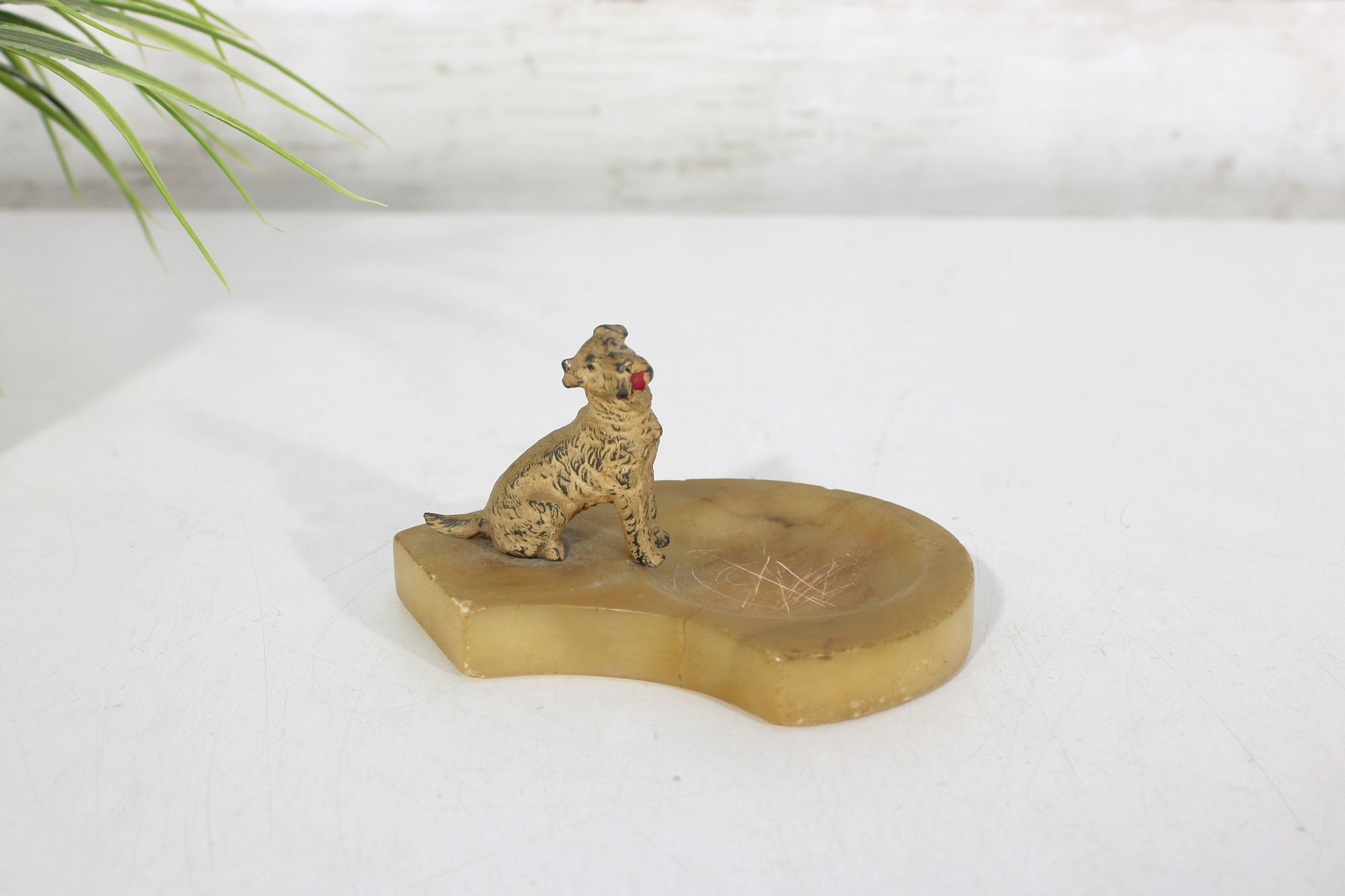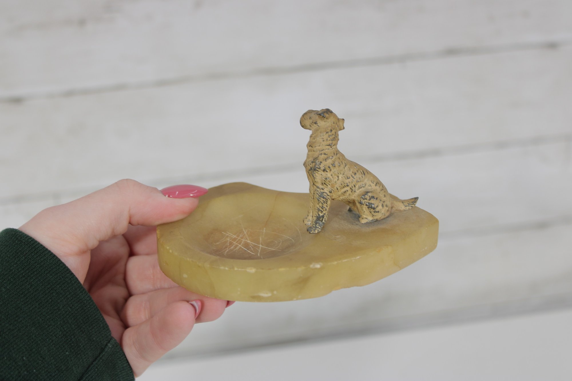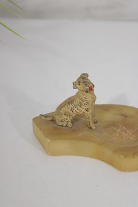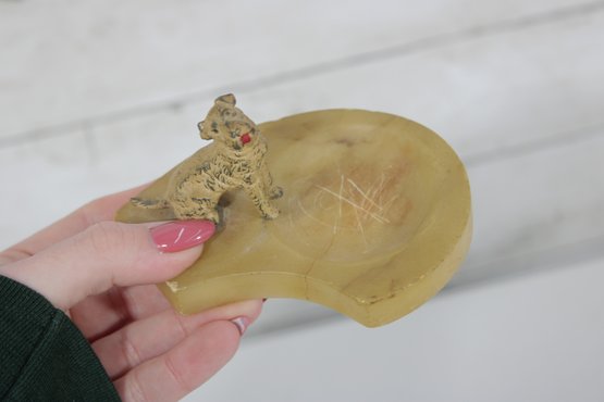 vintage figural dog ashtray measuring approximately 2.5 inches high. The piece features a small seated dog figure mounted on the edge of a curved ashtray base.