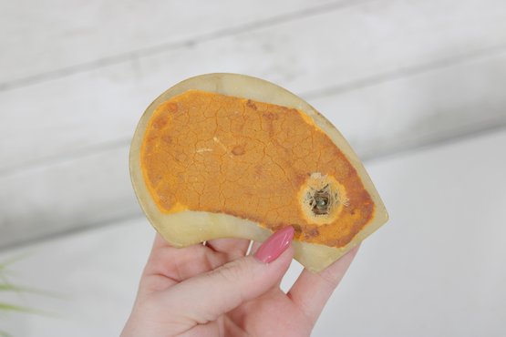 The ashtray is finished in a warm amber/tan tone with a smooth molded surface, while the dog figure is detailed with textured fur and hand-painted accents including the collar and facial features. The design gives the piece a charming mid-century novelty look.