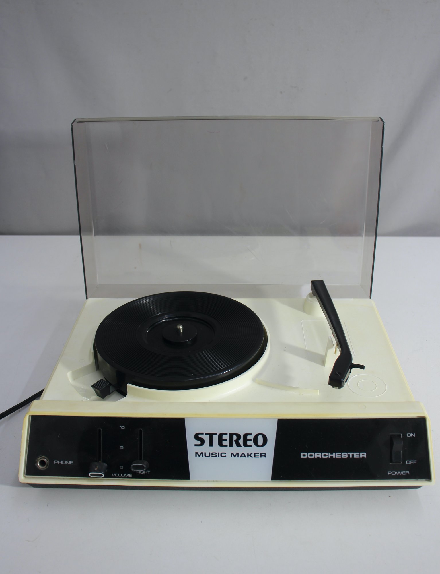 This vintage Dorchester Stereo Music Maker is a nostalgic piece of audio equipment, perfect for vinyl enthusiasts or collectors. The turntable features a sleek design with a transparent dust cover and simple control interface, making it both functional and visually appealing.