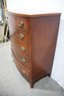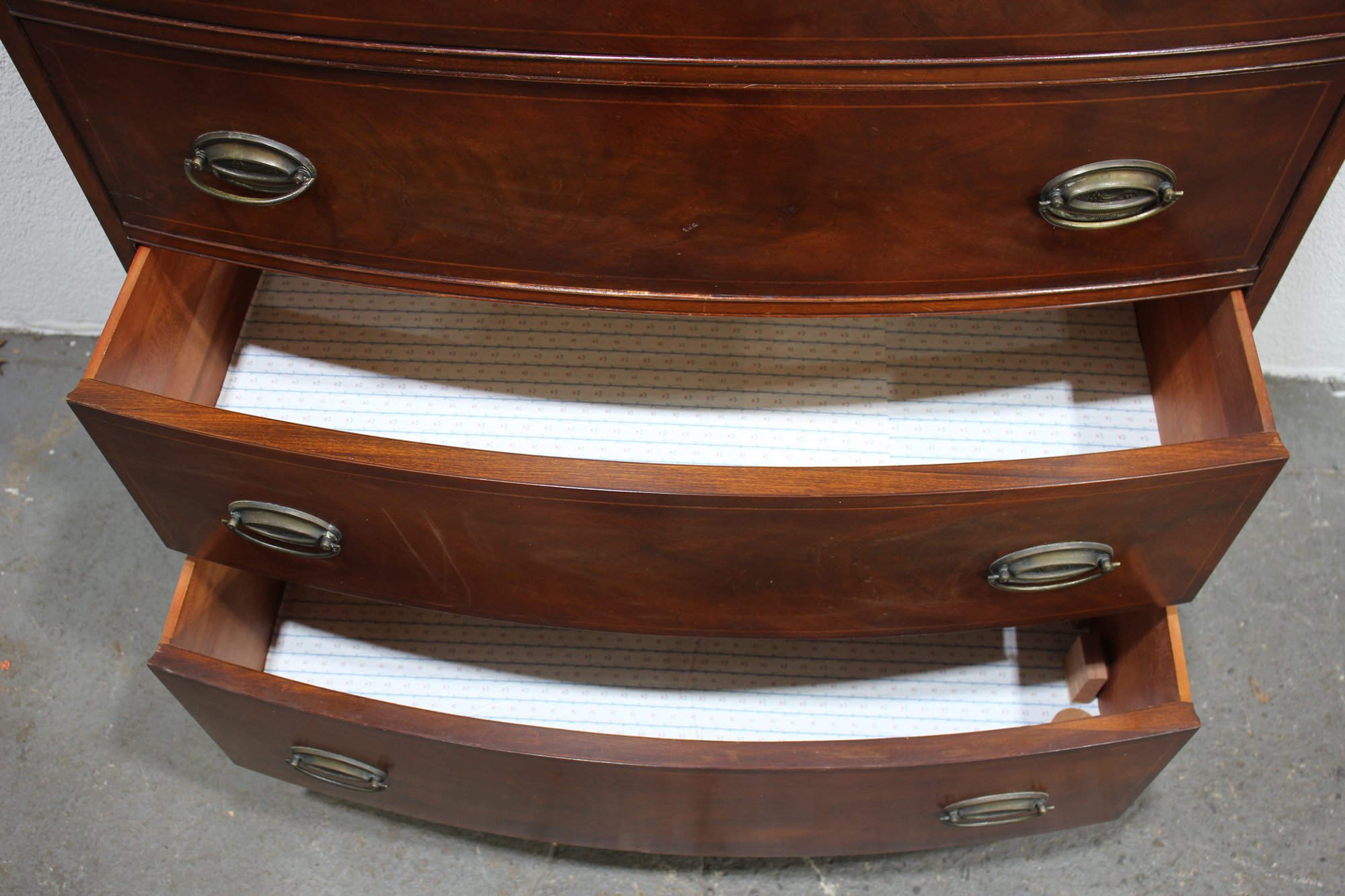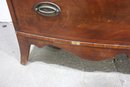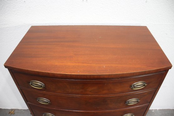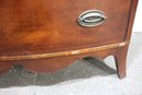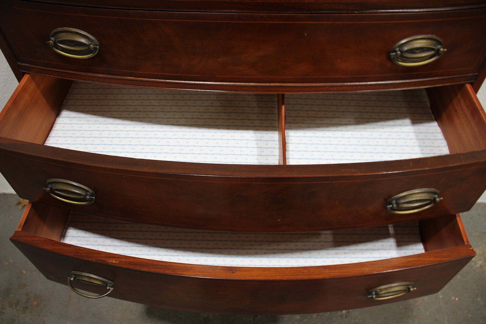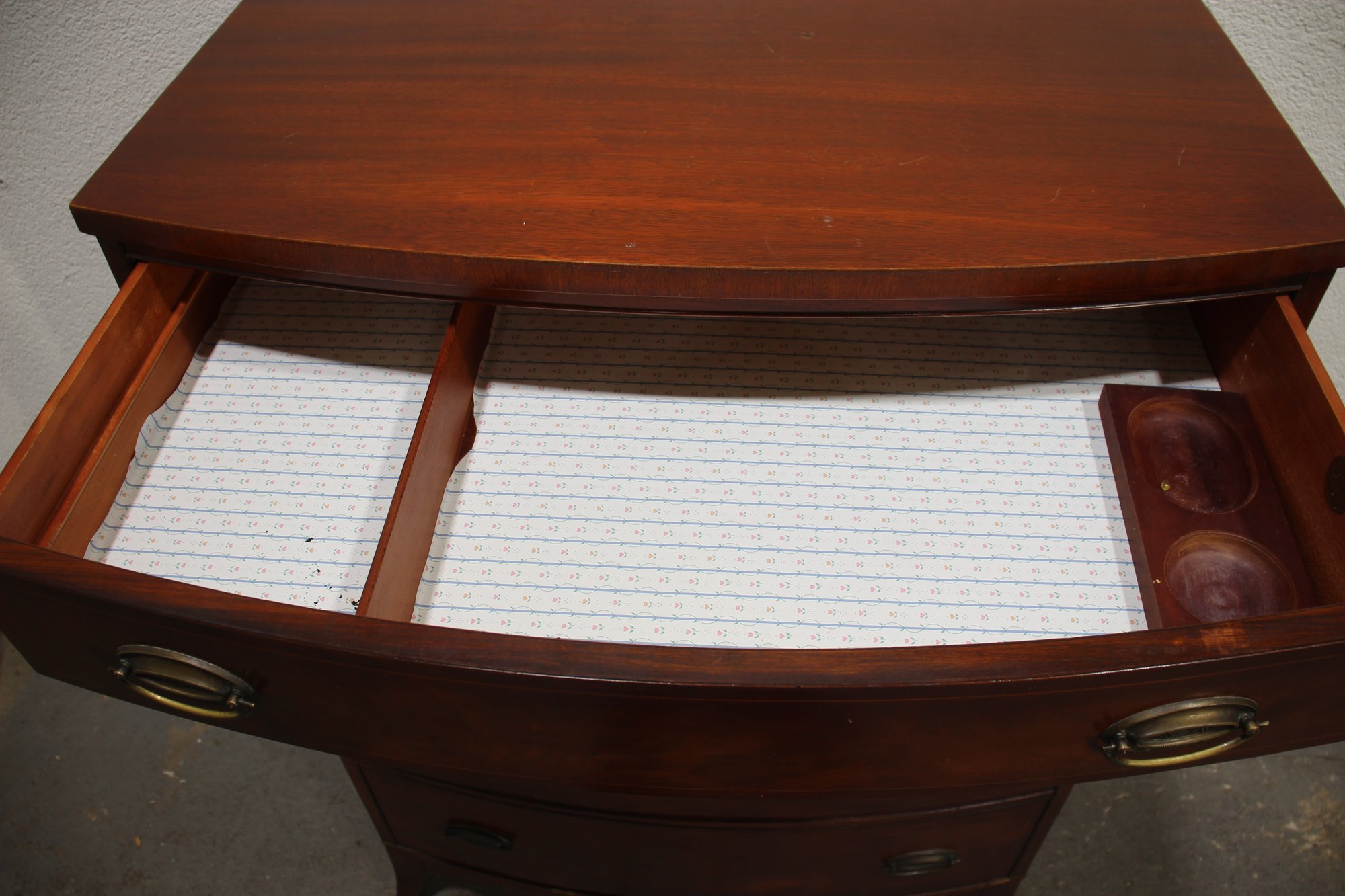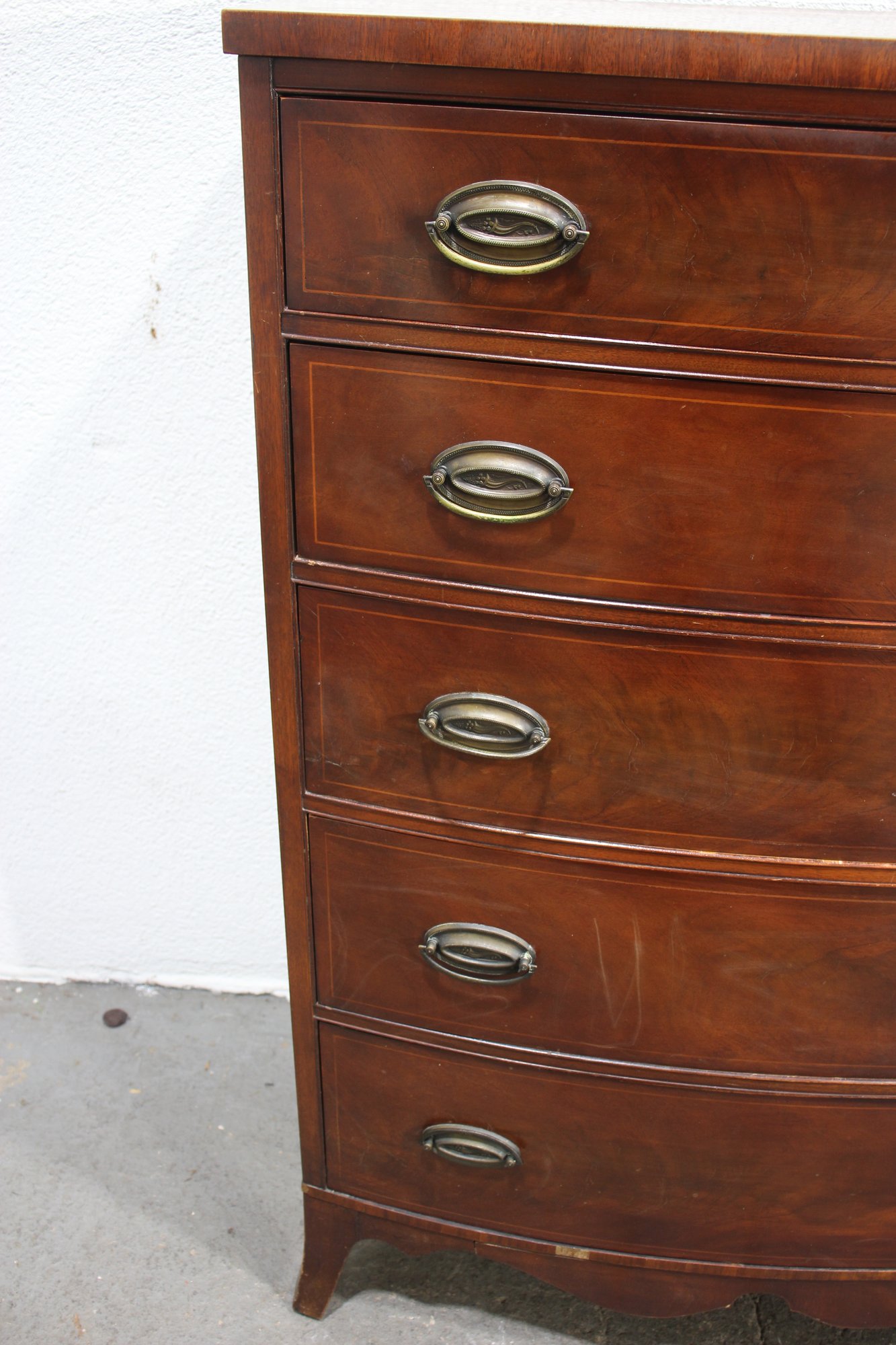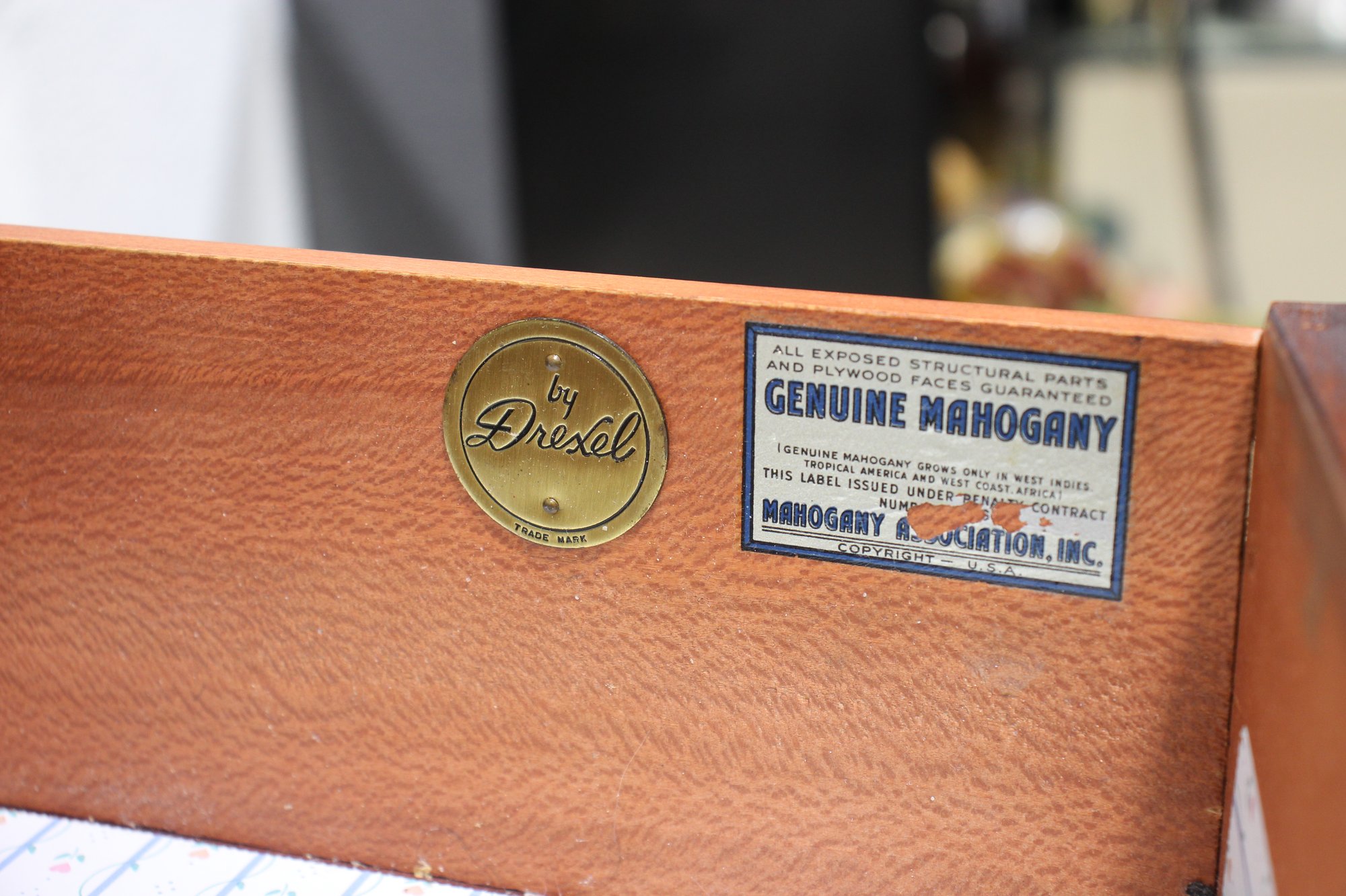 The chest is marked with the original Drexel badge and "Genuine Mahogany" label, certifying the use of premium materials. The bow front design and scalloped apron with subtle inlay accents add to its timeless charm, making it a perfect addition to both traditional and modern interiors.