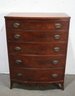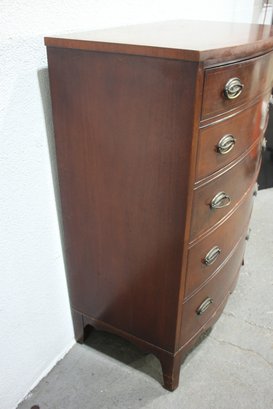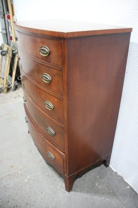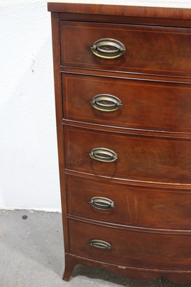 a classic vintage Drexel bow front chest of drawers, expertly crafted from genuine mahogany. This elegant piece features five spacious drawers, each adorned with original brass oval pulls and dovetail construction, emphasizing its quality craftsmanship.