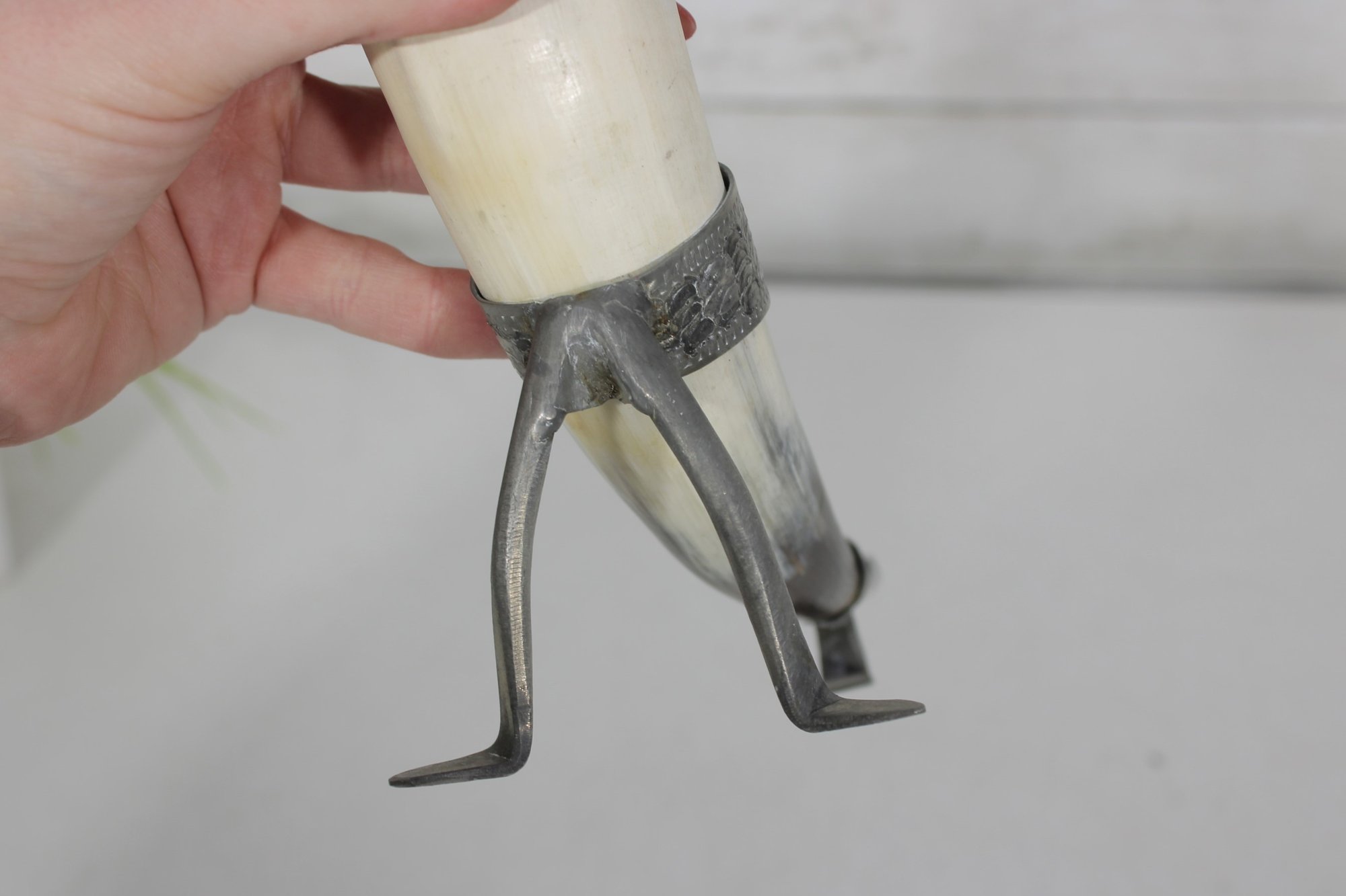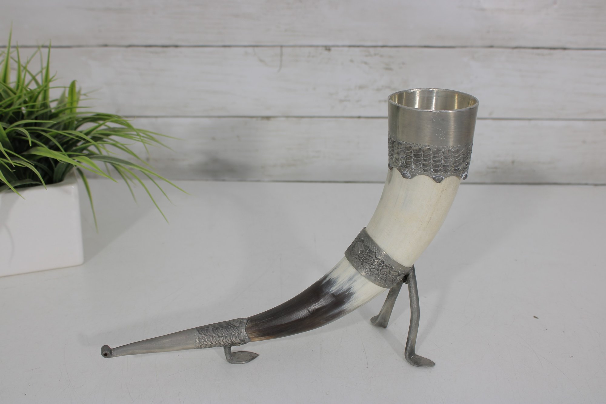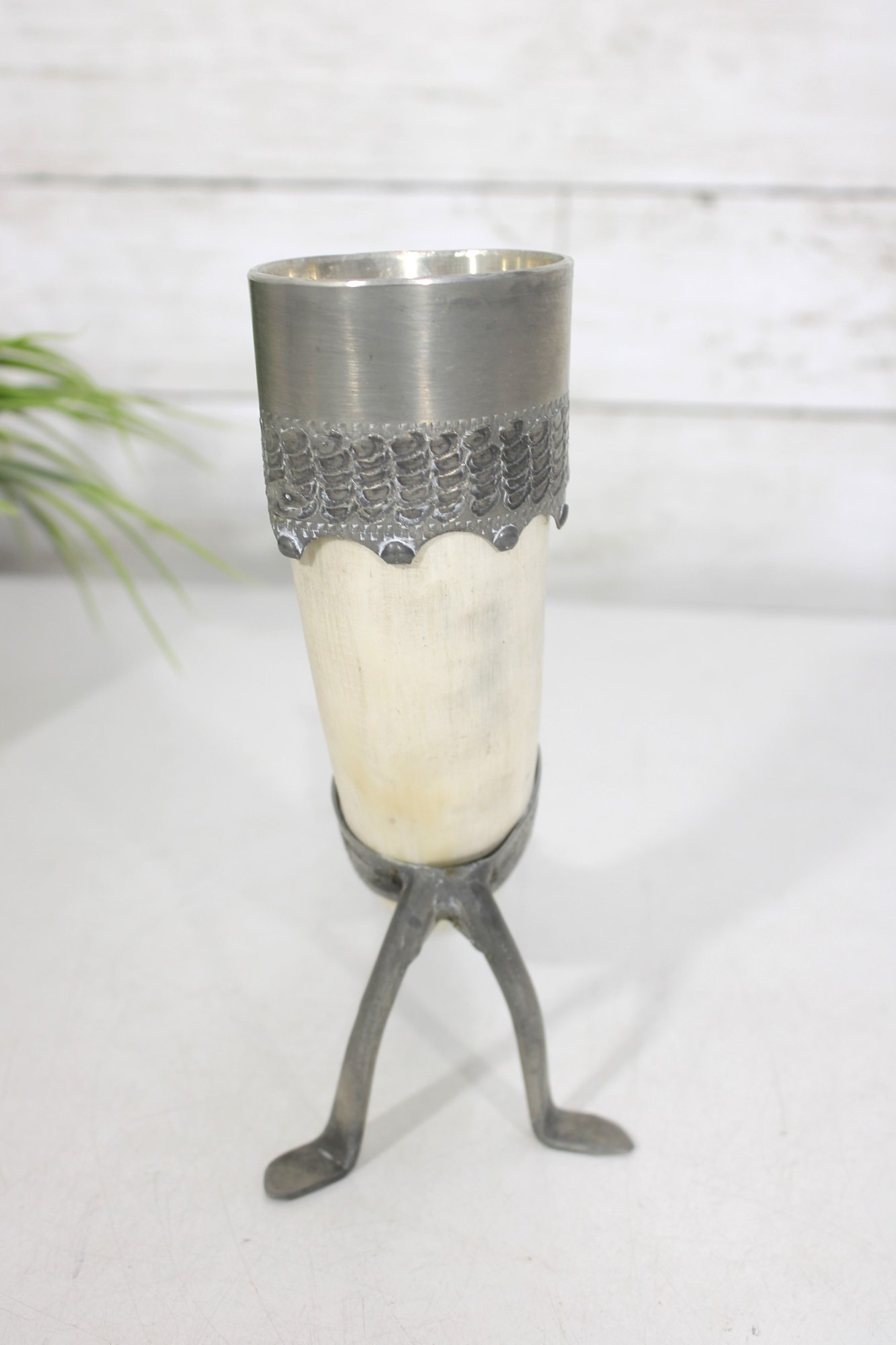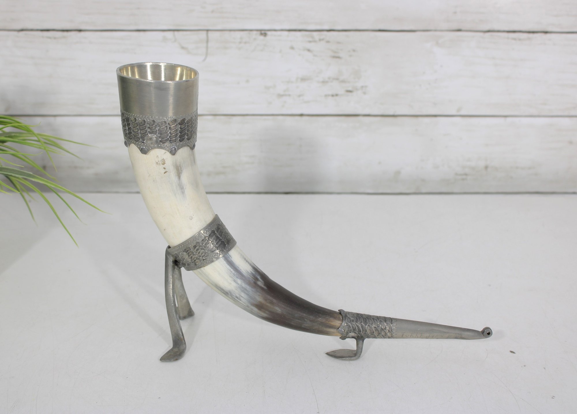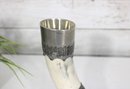 Decorative vintage drinking horn featuring natural horn body with ornate pewter mounts and attached metal stand. The top rim is finished with a pewter cup-style collar, and the lower section includes engraved pewter detailing and small support legs allowing it to stand upright.
