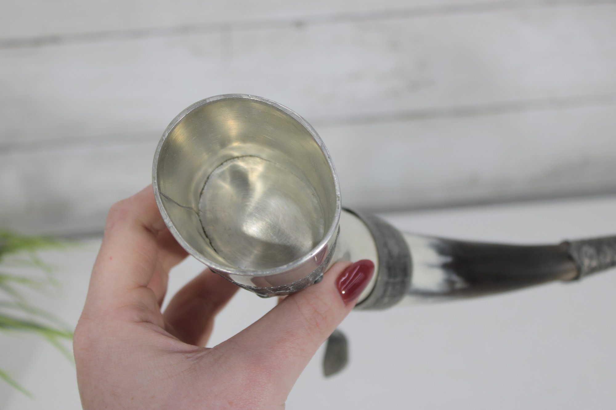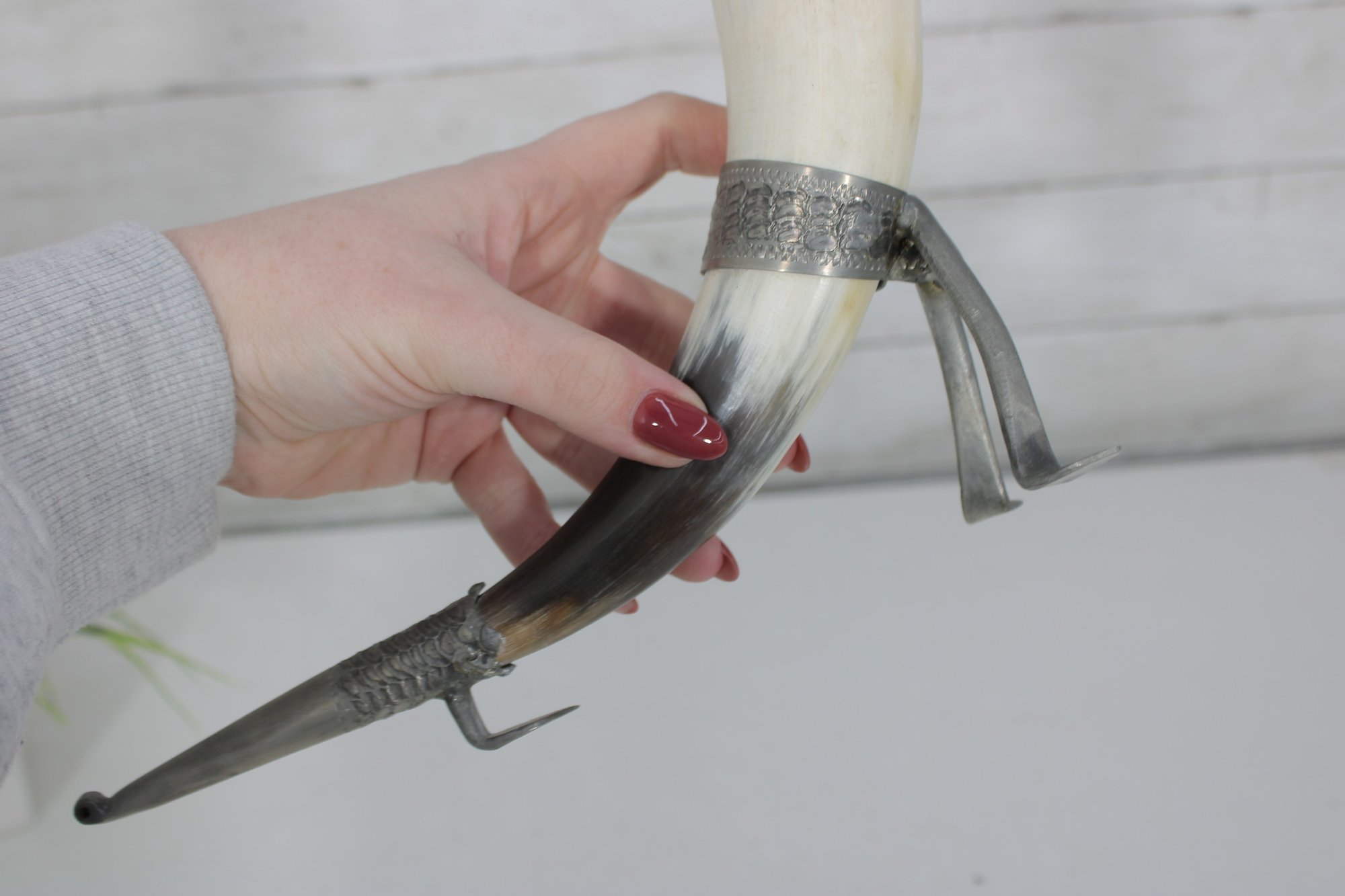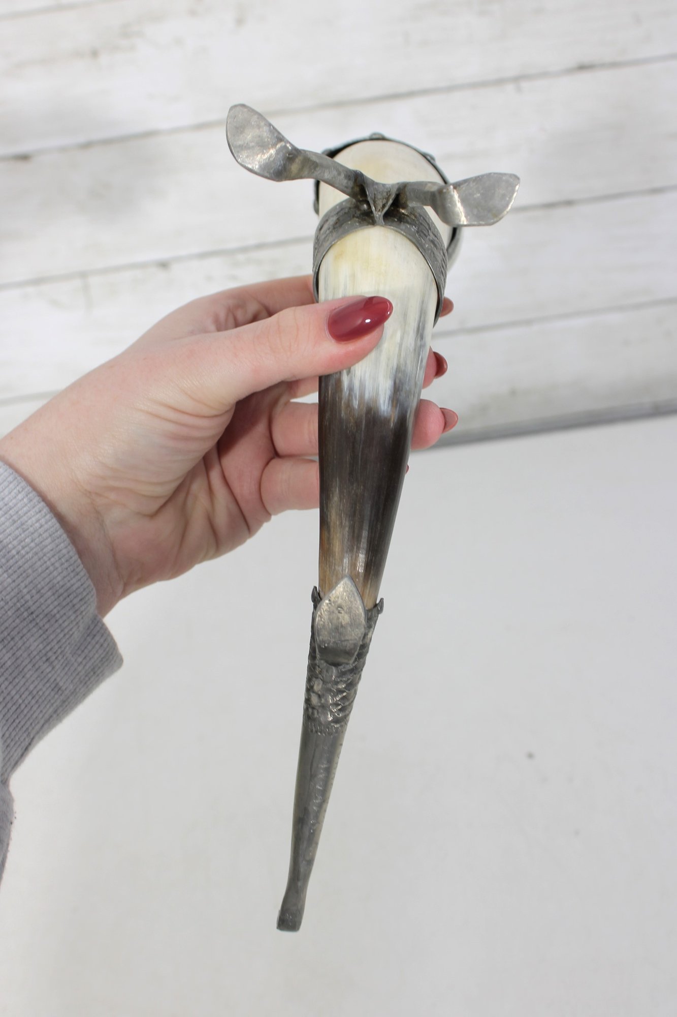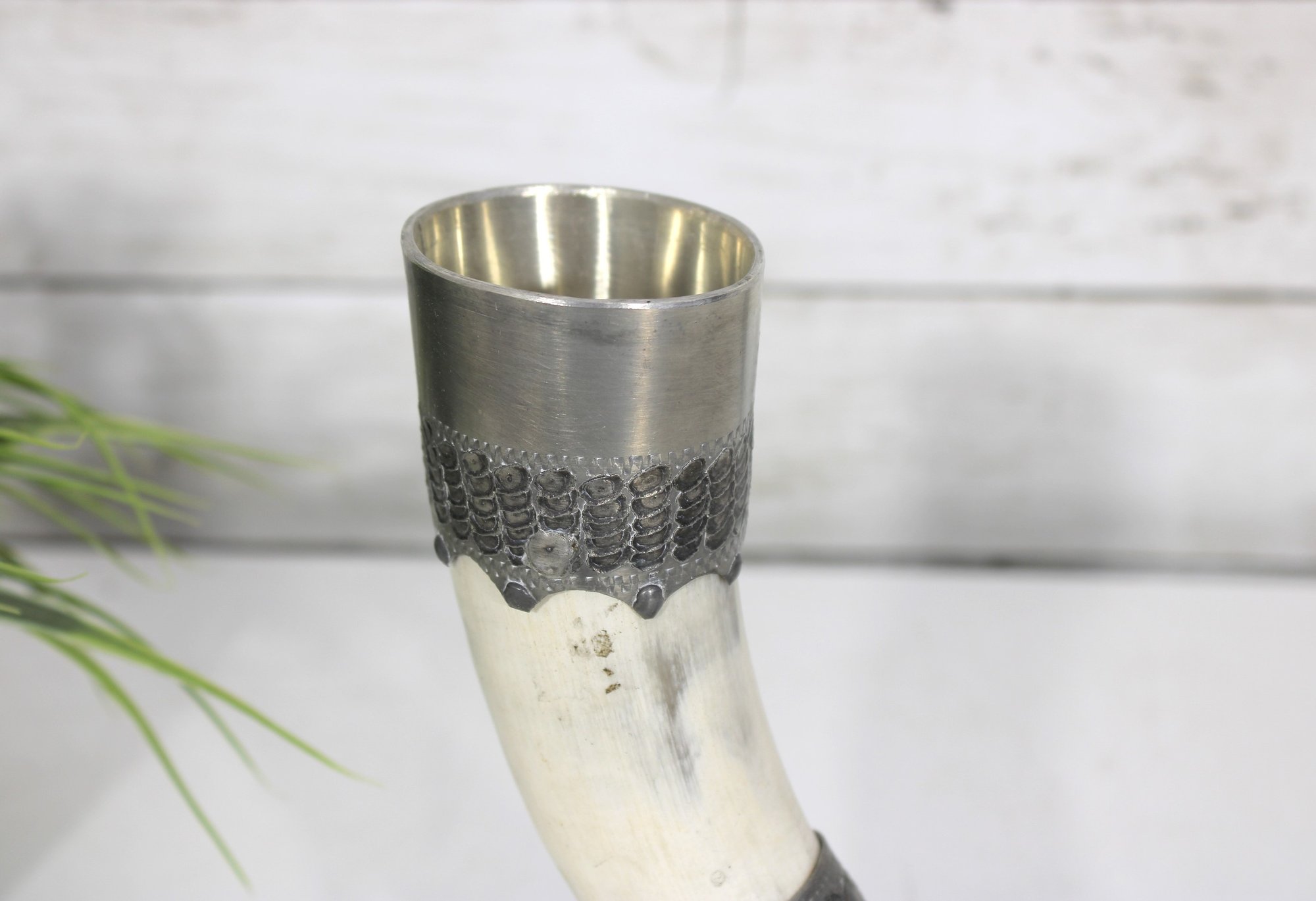Decorative vintage drinking horn featuring natural horn body with ornate pewter mounts and attached metal stand. The top rim is finished with a pewter cup-style collar, and the lower section includes engraved pewter detailing and small support legs allowing it to stand upright.