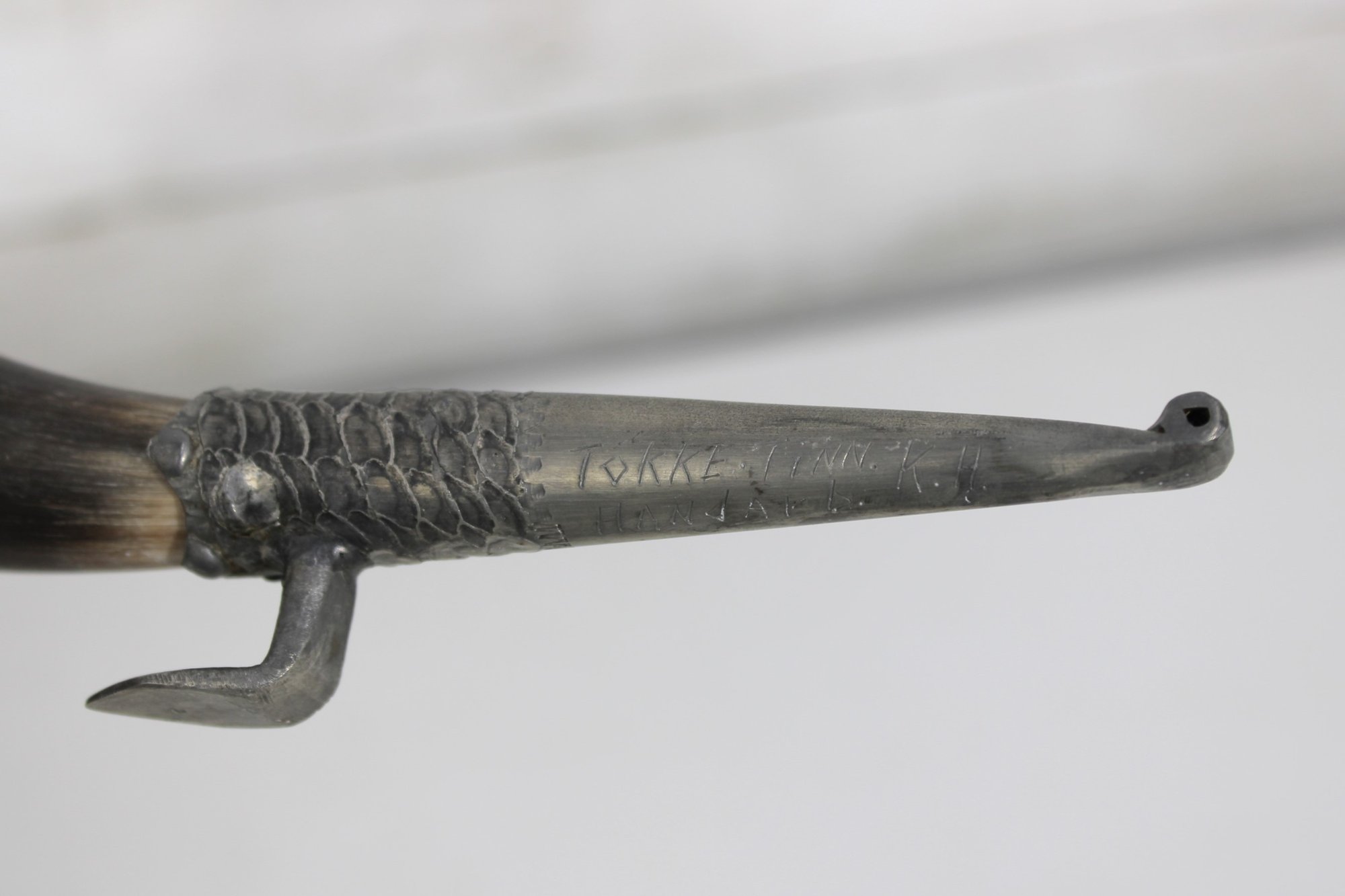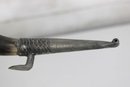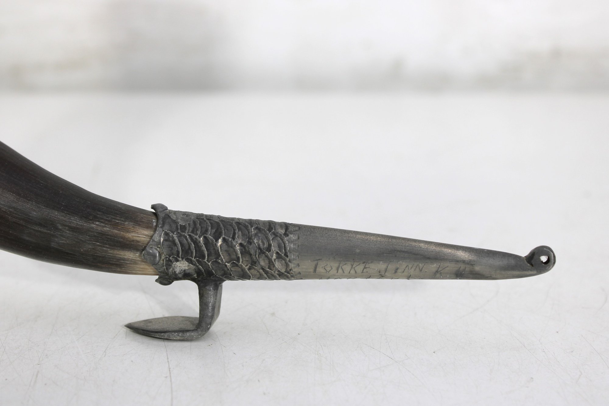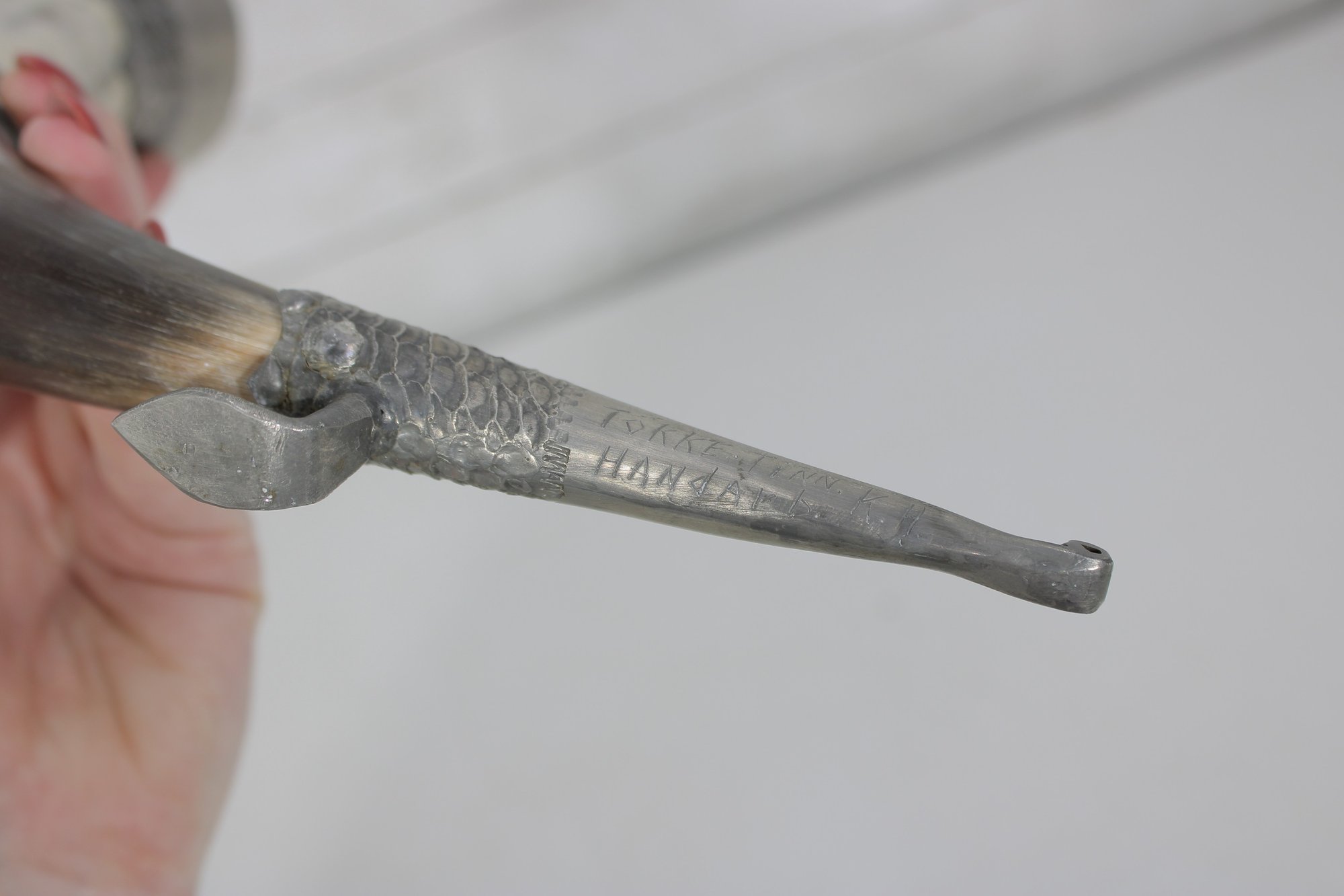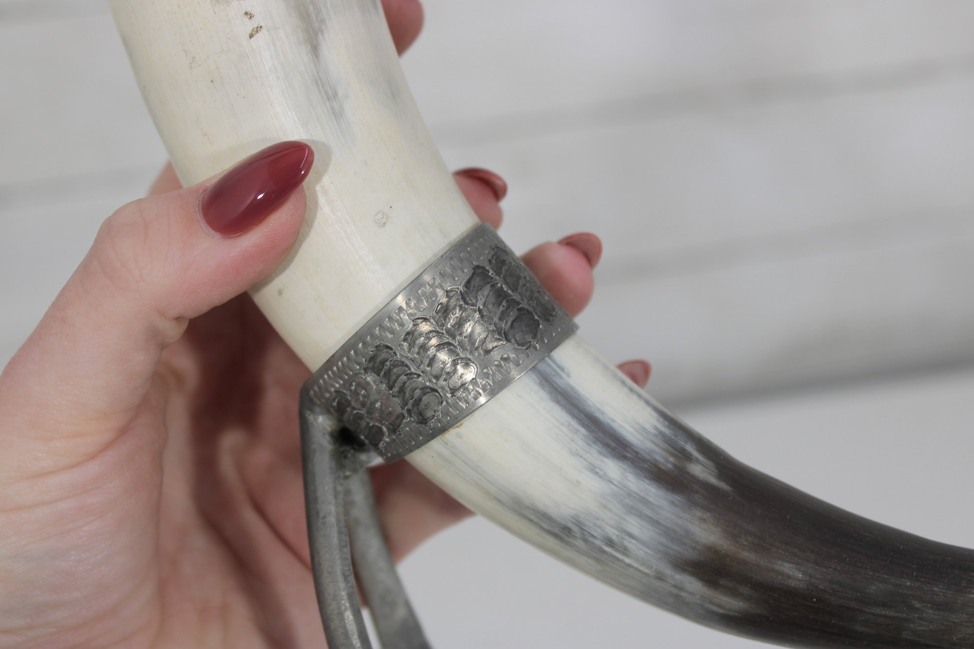 Decorative vintage drinking horn featuring natural horn body with ornate pewter mounts and attached metal stand. The top rim is finished with a pewter cup-style collar, and the lower section includes engraved pewter detailing and small support legs allowing it to stand upright.