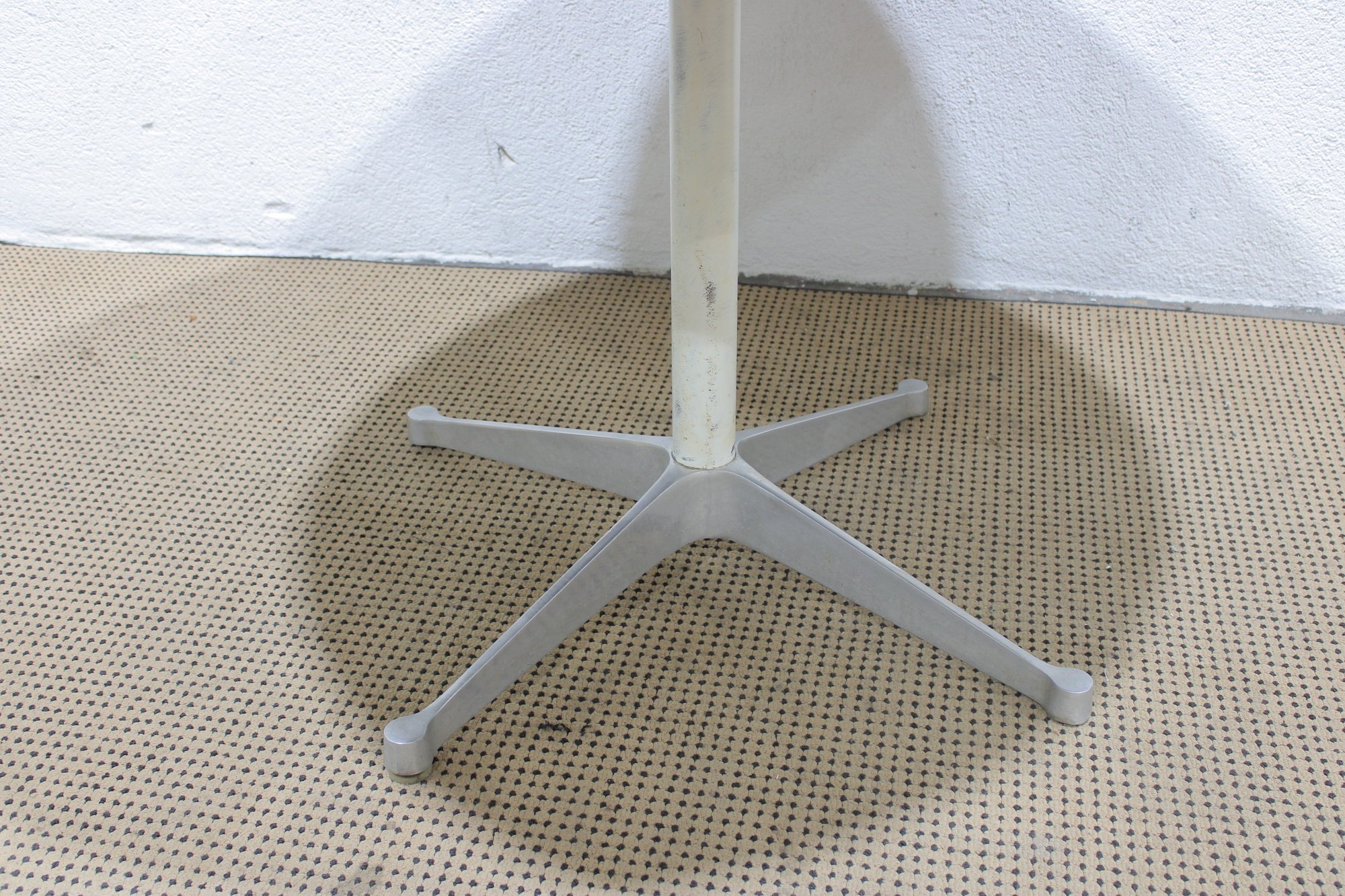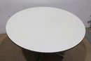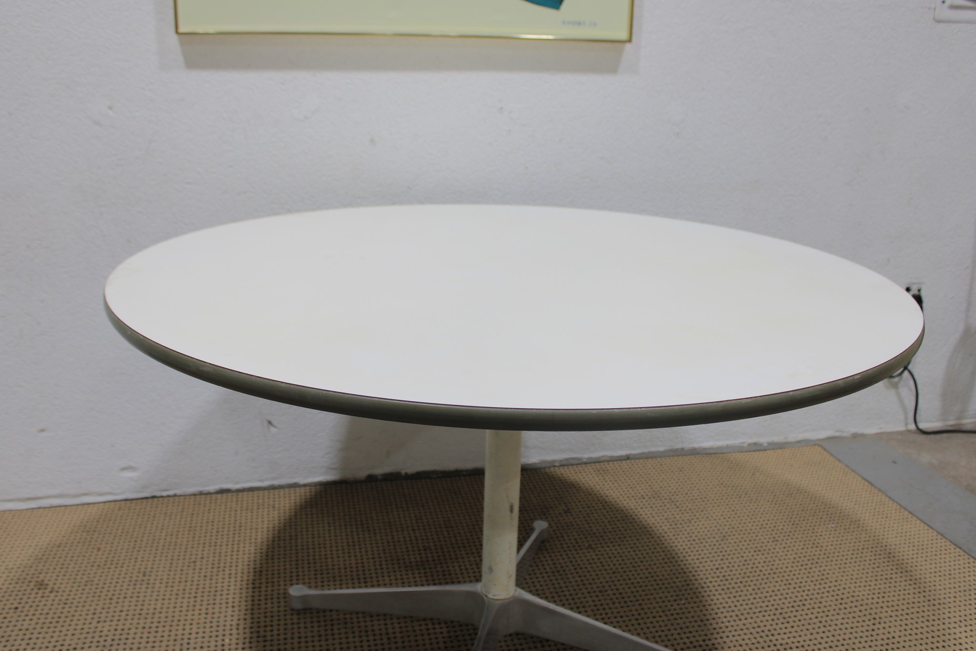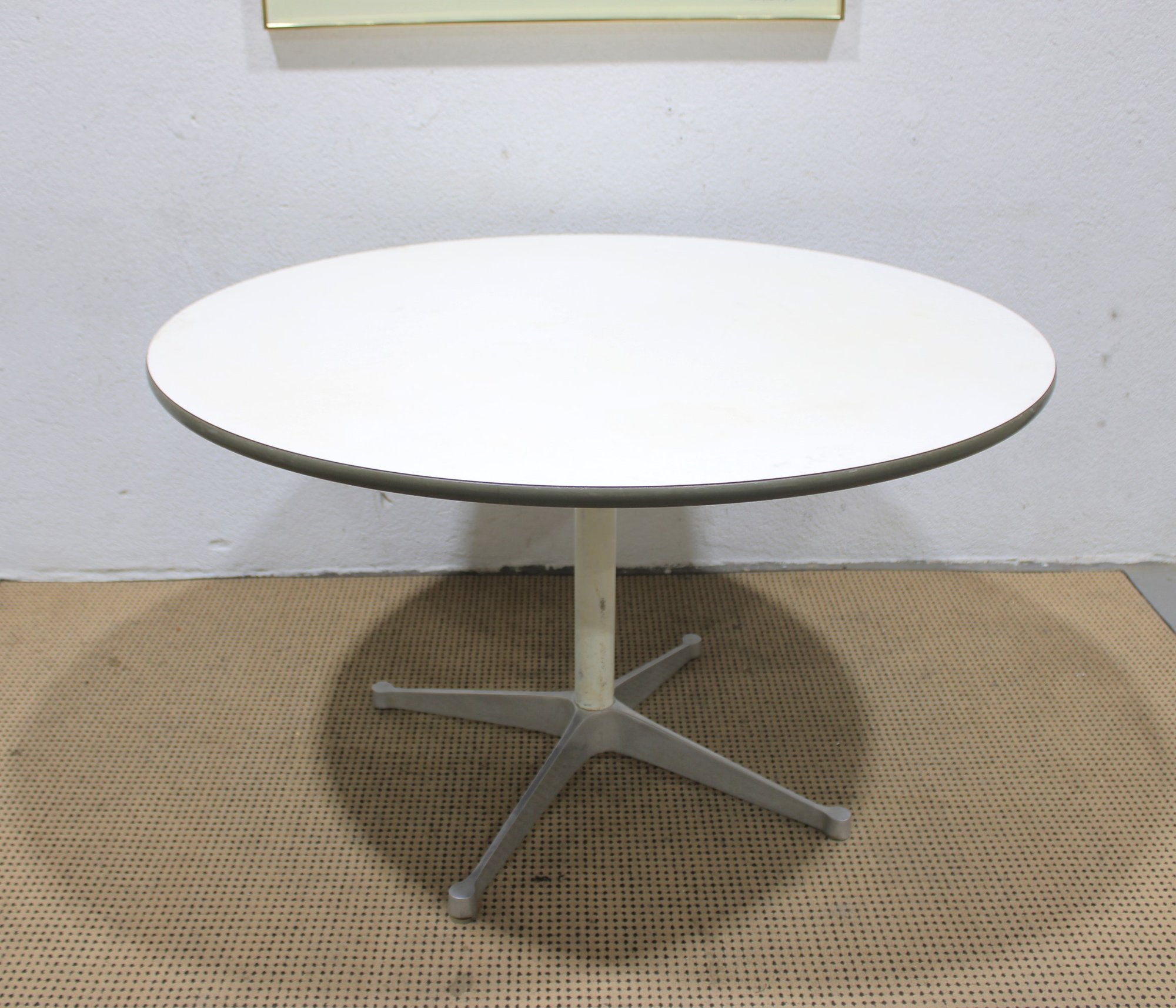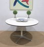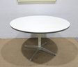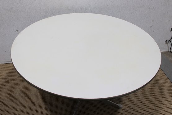 Authentic Eames for Herman Miller round dining table featuring the iconic pedestal base design. This timeless modern classic showcases a clean white laminate top paired with a sleek central column and aluminum four-star base.