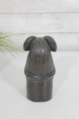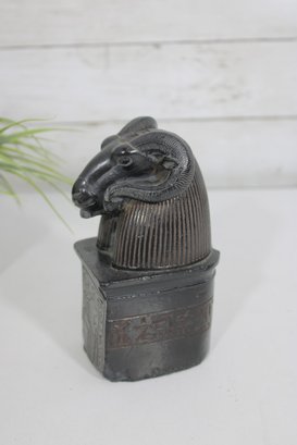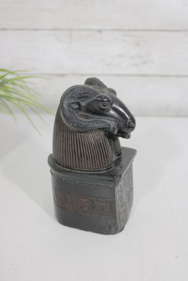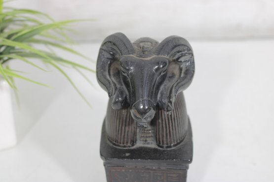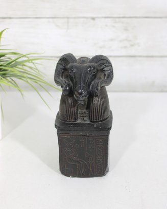 Striking vintage Egyptian-style carved stone bookend or figurine, depicting the ram-headed god Amun. The sculpture features a detailed ram head with curled horns, set above a rectangular base adorned with carved hieroglyphic-style motifs.