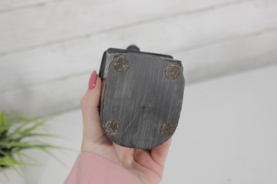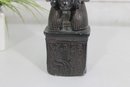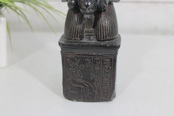 Crafted in black stone, the piece has a substantial feel and a matte, slightly textured surface that enhances its ancient-inspired aesthetic. The combination of sculptural detail and symbolic design makes it a unique decorative accent or functional bookend.