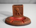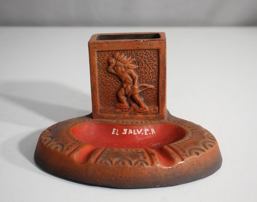 This vintage terracotta ashtray from El Salvador features an indigenous warrior relief on the front and a scenic landscape with a smoking volcano on the reverse. The handcrafted piece, marked "Hecho en Ilobasco El Salvador," showcases intricate designs and earthy tones, embodying the cultural artistry of the region. Measuring approximately 4 inches in height, it serves as both a collectible and a decorative item with authentic charm. The ashtray shows minor wear, consistent with age, adding to its rustic appeal. Perfect for collectors of unique folk art or as an eye-catching decor piece.