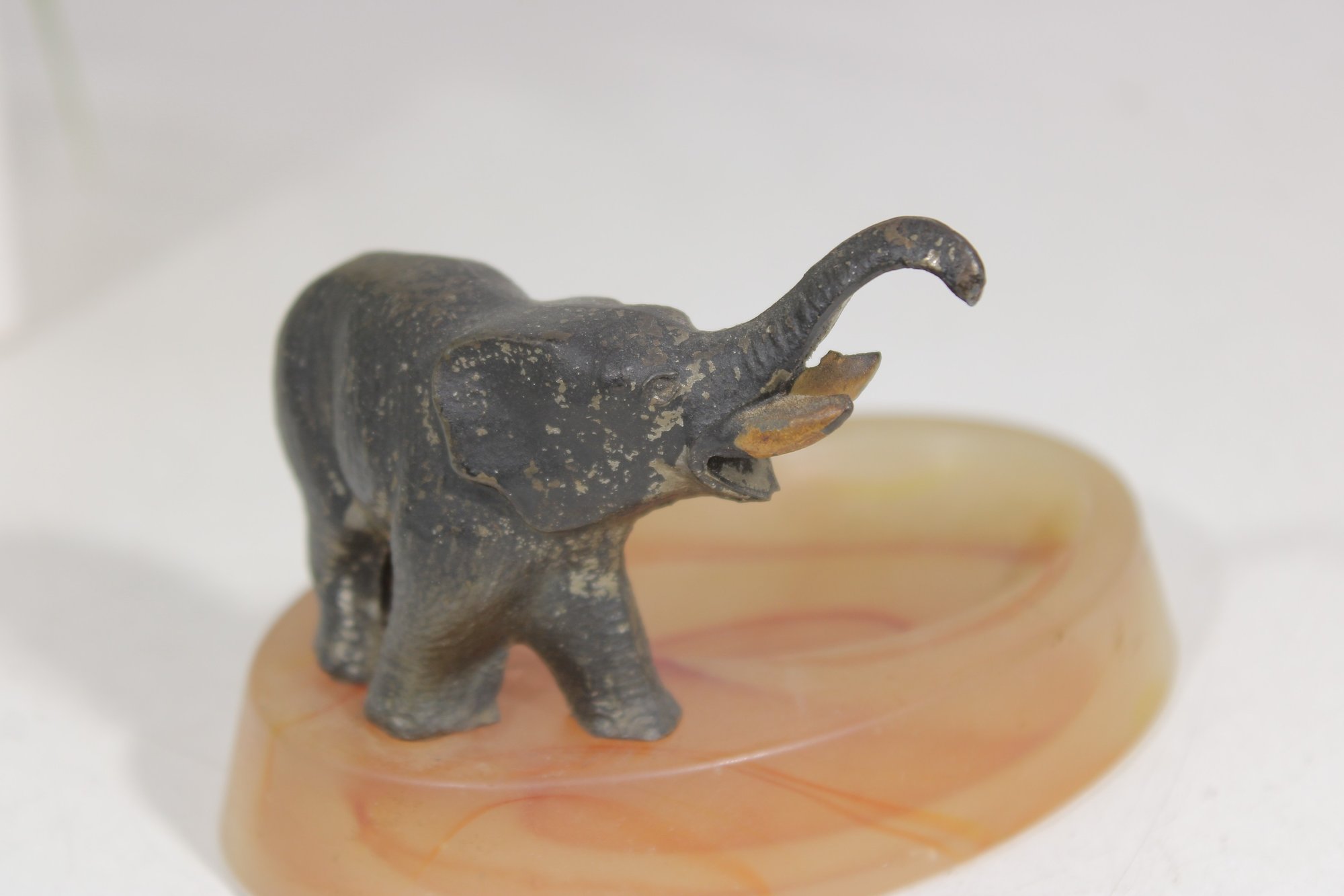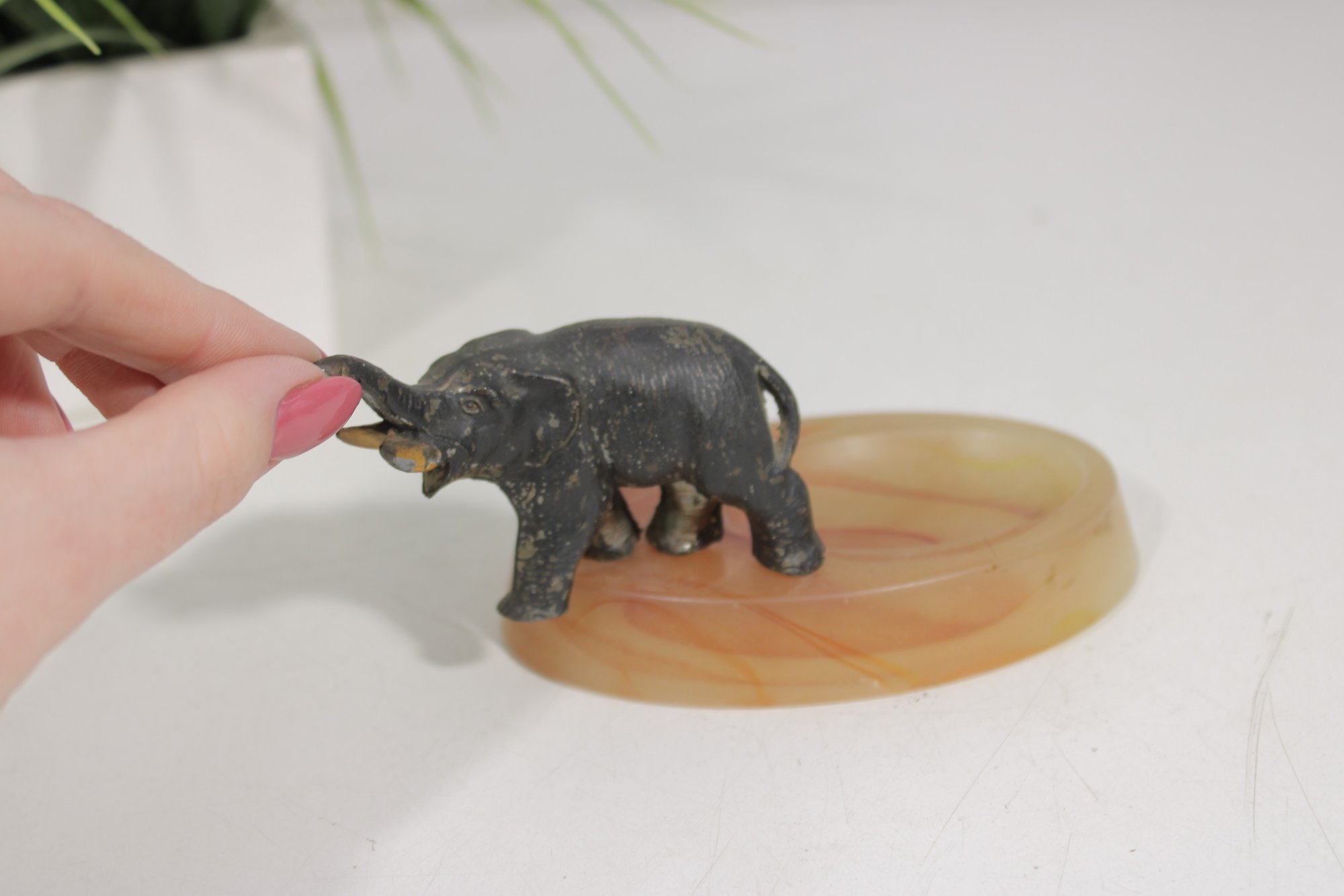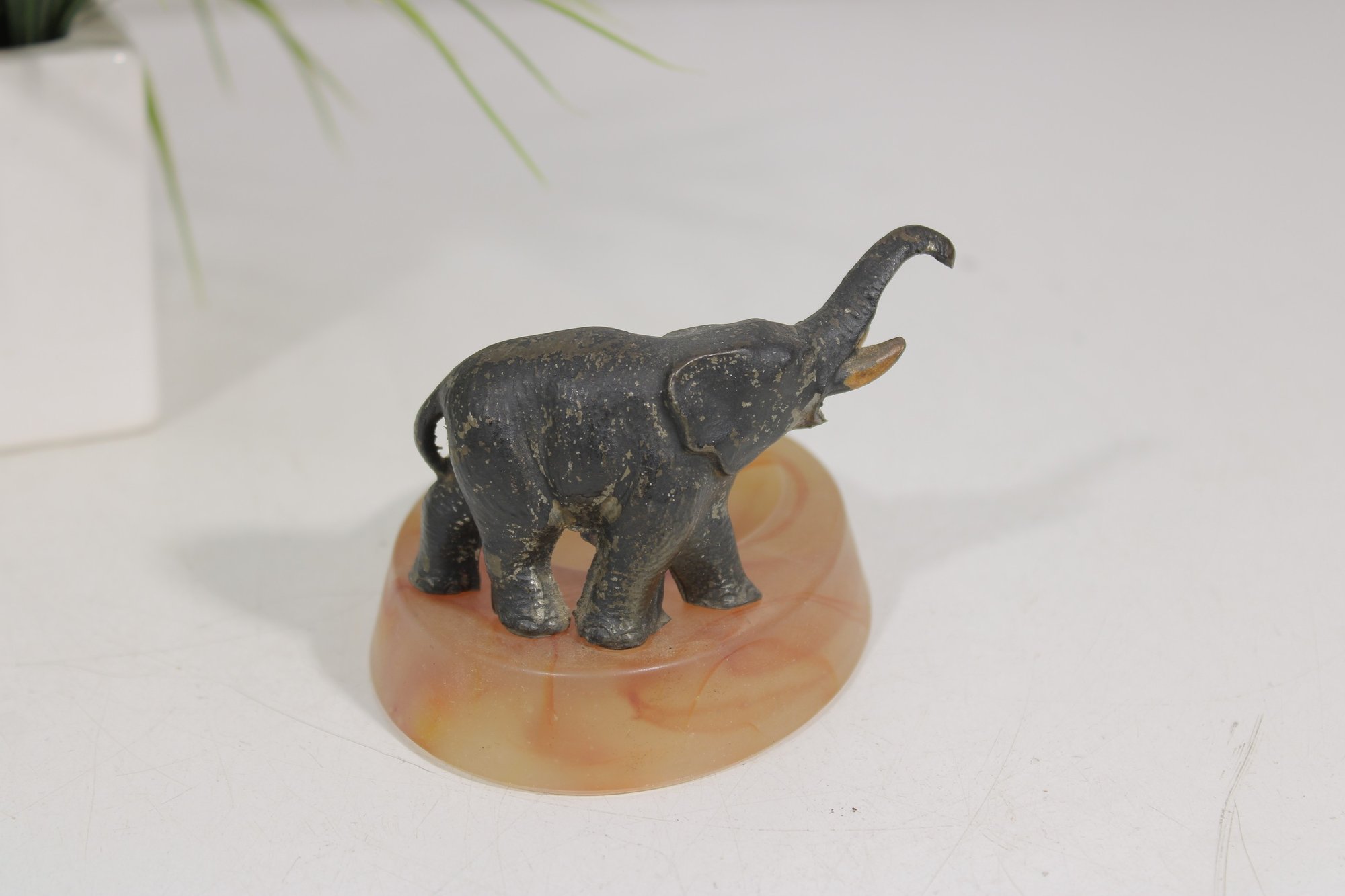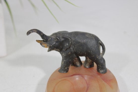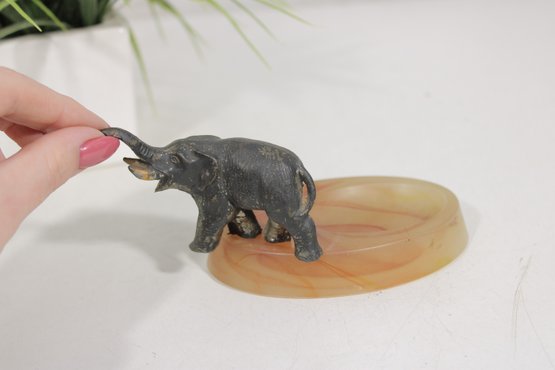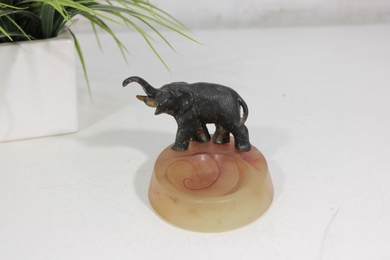 Charming vintage elephant figurine mounted on a polished stone base, featuring a detailed elephant with raised trunk standing atop a decorative stone platform. The base displays a beautiful swirling pattern in warm cream and reddish tones, resembling polished agate or onyx.