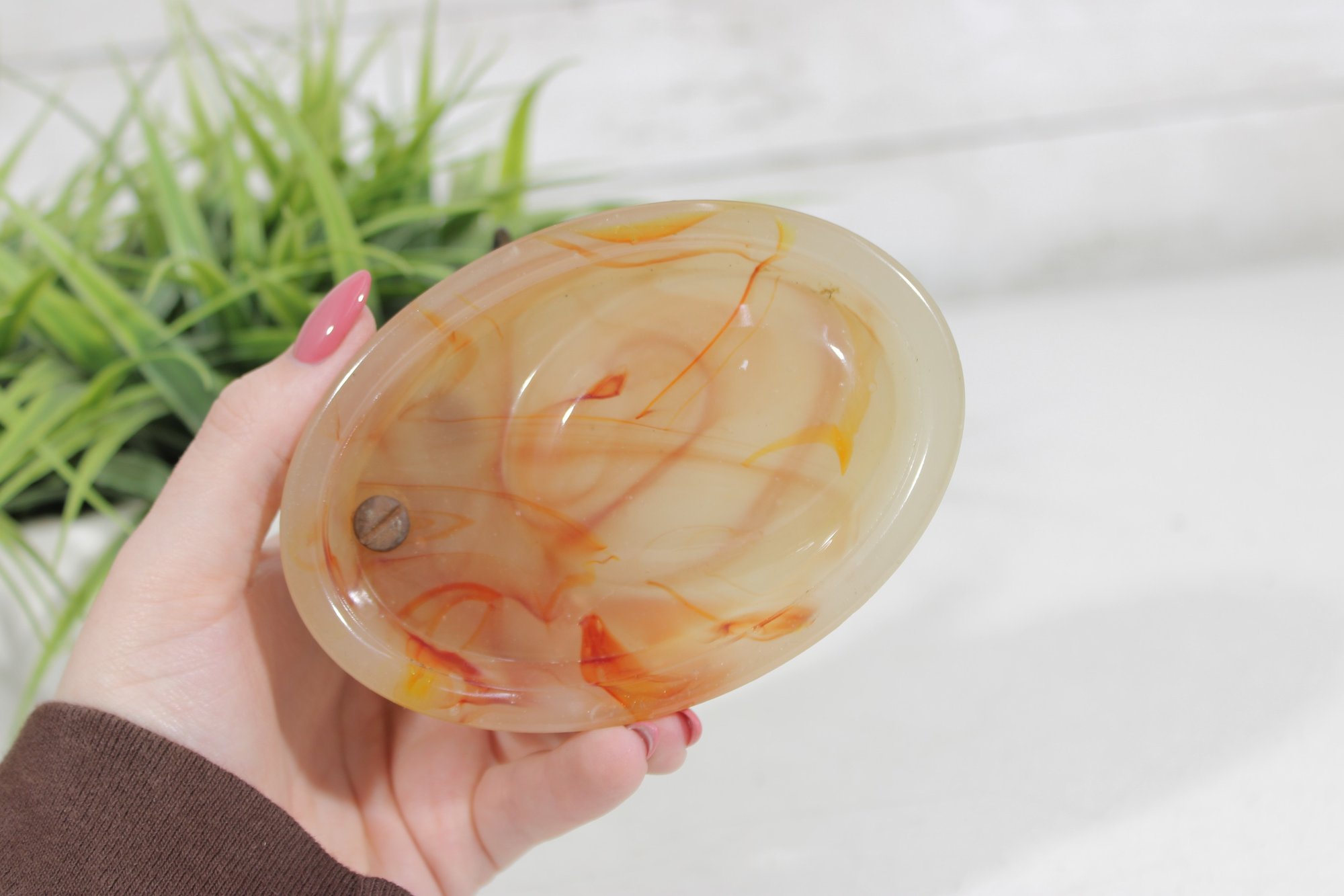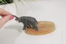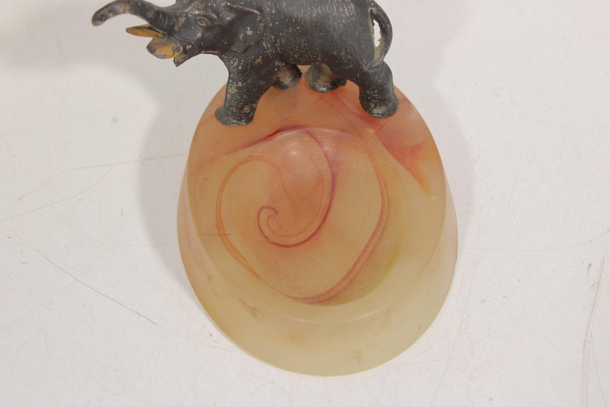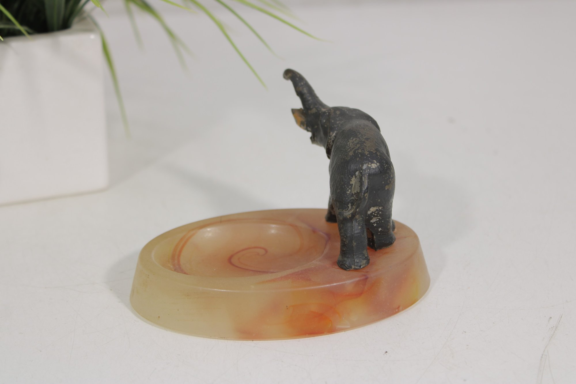 Charming vintage elephant figurine mounted on a polished stone base, featuring a detailed elephant with raised trunk standing atop a decorative stone platform. The base displays a beautiful swirling pattern in warm cream and reddish tones, resembling polished agate or onyx.