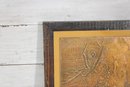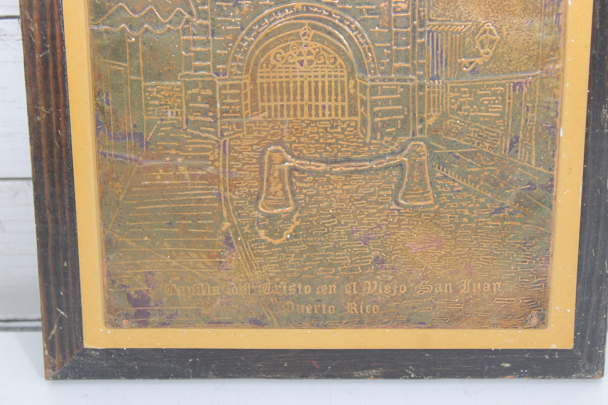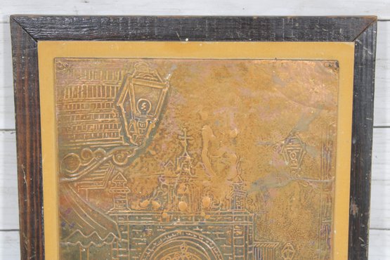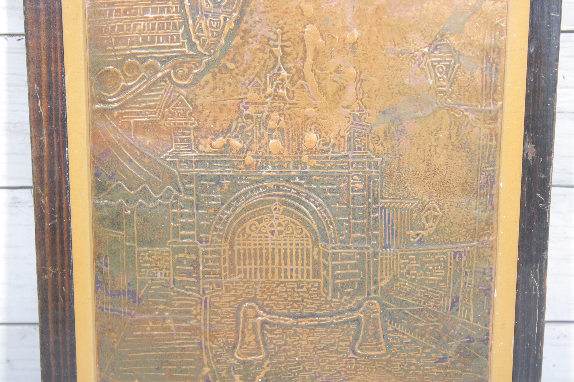a unique vintage embossed metal art plaque, featuring a detailed architectural relief scene rendered in warm bronze and gold tones.