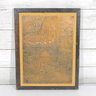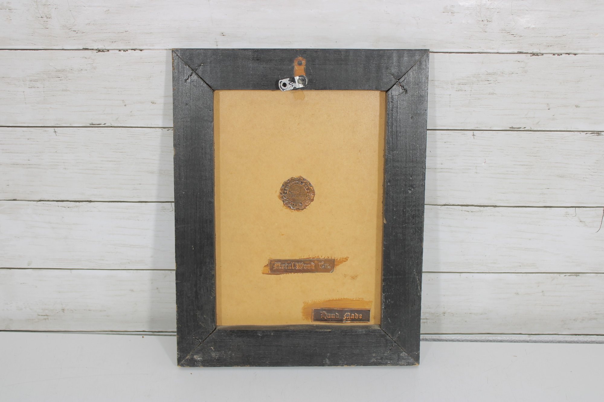 The plaque is mounted within a contrasting wood frame, enhancing its rustic and decorative appeal. The reverse retains labels and markings, adding to its vintage character.