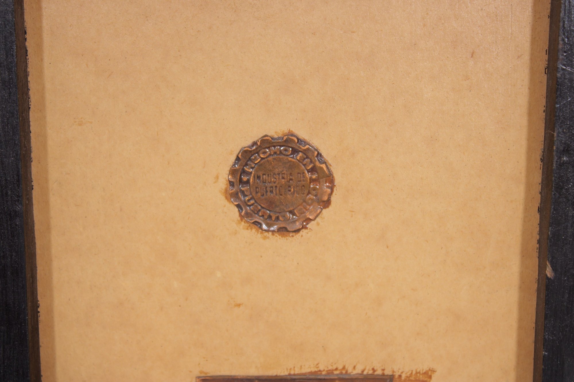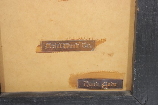 Good vintage condition; some surface wear and patina to the metal consistent with age. Frame shows light wear. Backing has age-related marks and labels.
