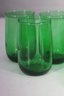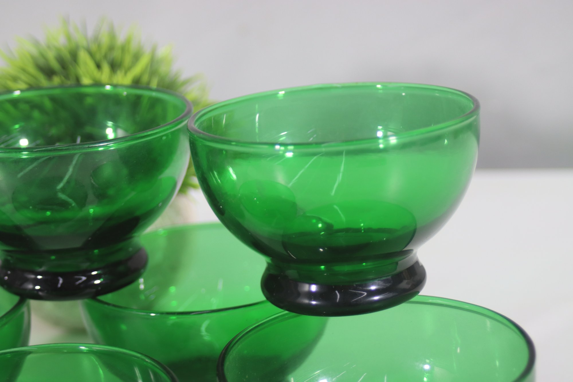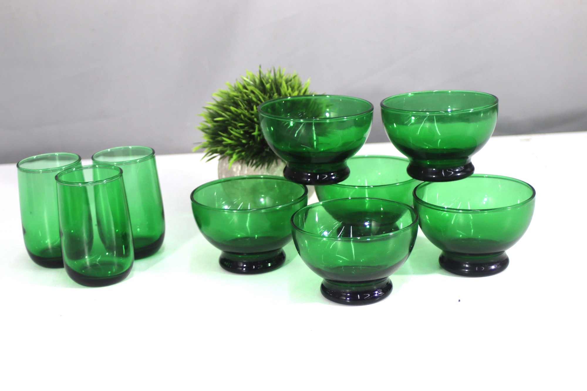 vintage emerald green glassware set includes a beautiful collection of footed bowls and tumblers, each featuring a deep green hue with contrasting black bases. Perfect for mid-century modern or retro-inspired decor, this set adds elegance to any dining or barware collection.