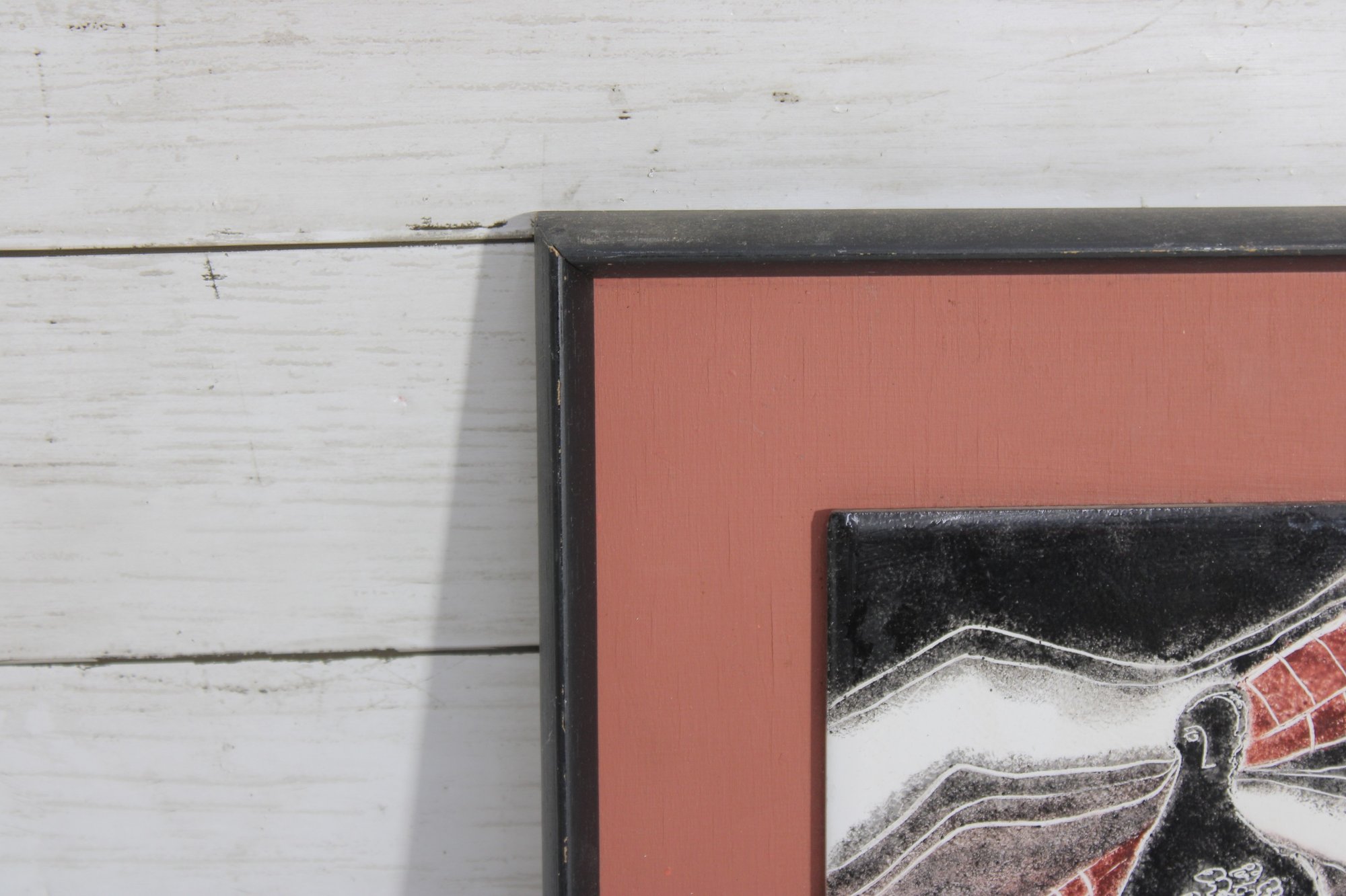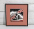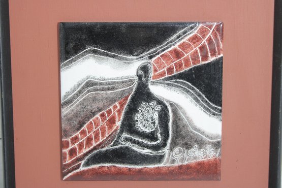 The glossy enamel surface enhances the texture and depth of the piece, while the strong lines and color blocking reflect a mid-century modern aesthetic. The artwork is mounted within a complementary frame and mat, making it ready for display.