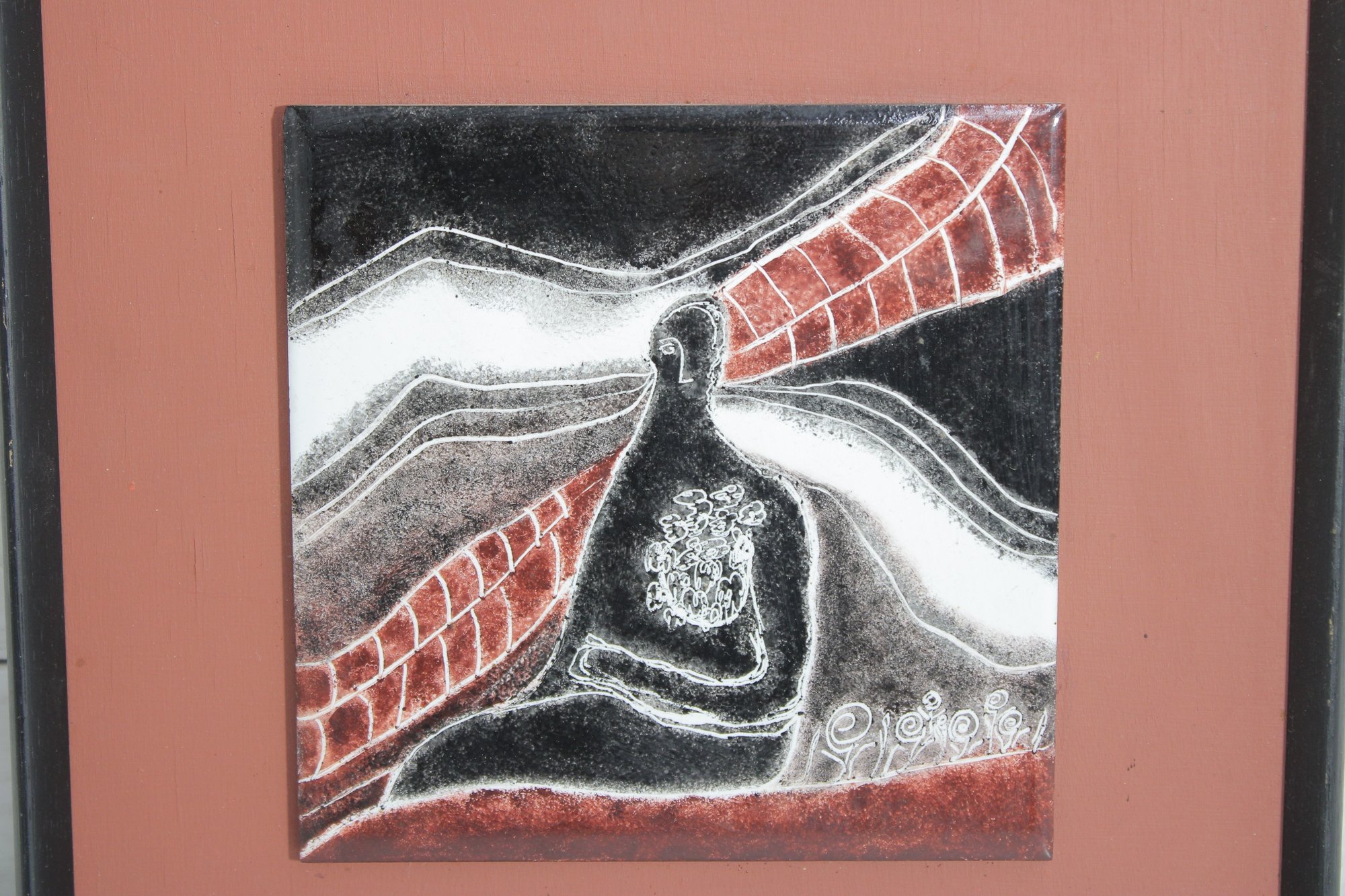 vintage enamel art plaque featuring an abstract figural composition in bold contrasting tones of black, white, and deep red. The design depicts a stylized seated figure integrated into flowing, geometric forms, creating a dynamic sense of movement and balance.