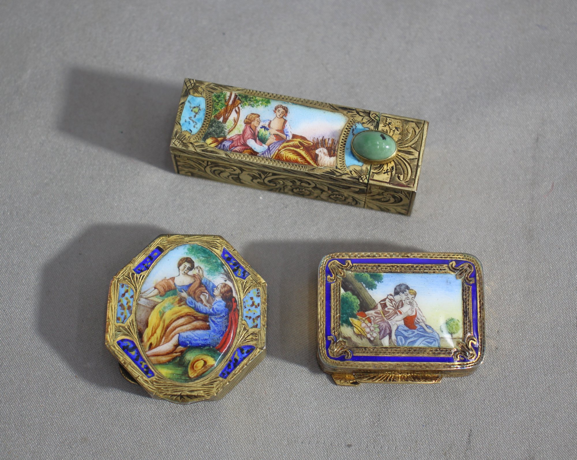 Octagonal Snuff Box: This enchanting piece, with its geometric precision, is adorned with a central enamel tableau set within a bold, blue and gold border, creating a striking contrast that highlights the pastoral scene within.