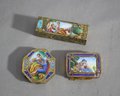 Each piece is a miniature canvas showcasing pastoral scenes reminiscent of 18th-century romantic art, framed by intricate gold-tone filigree work.