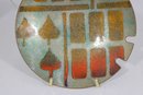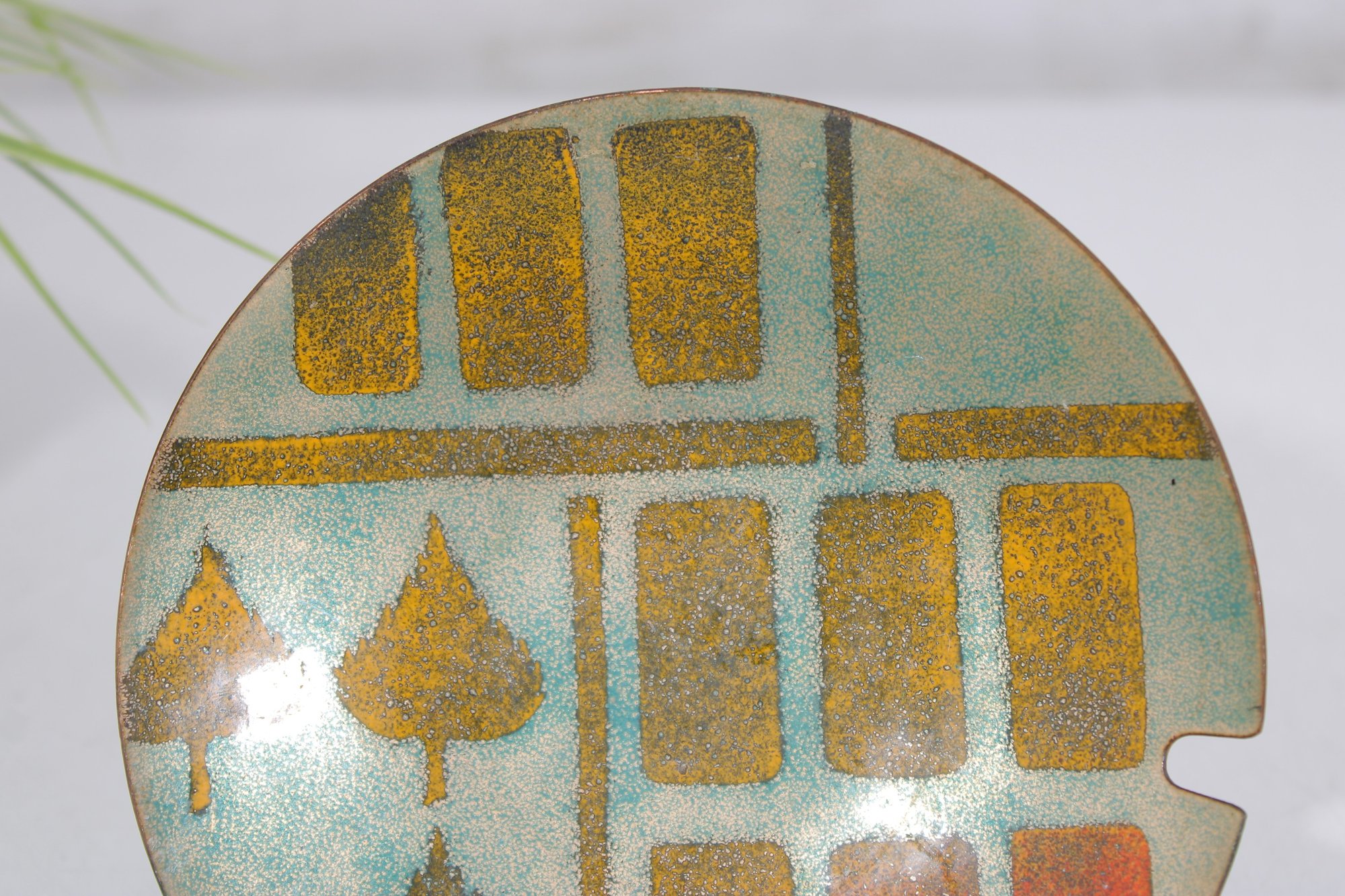 Unique vintage enamel on copper plate featuring a striking abstract design with stylized tree motifs and geometric blocks. The composition blends earthy tones of green, gold, orange, and red, creating a warm and modern mid-century aesthetic.