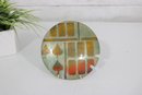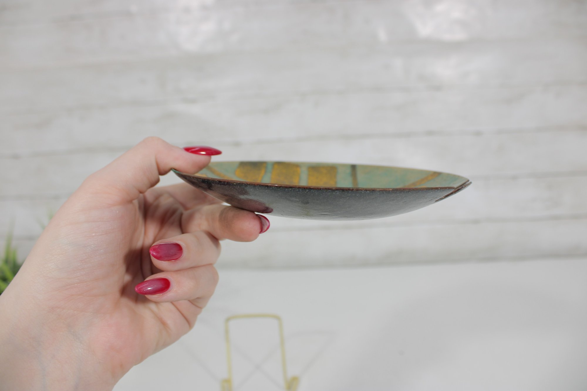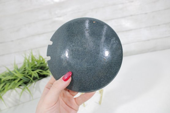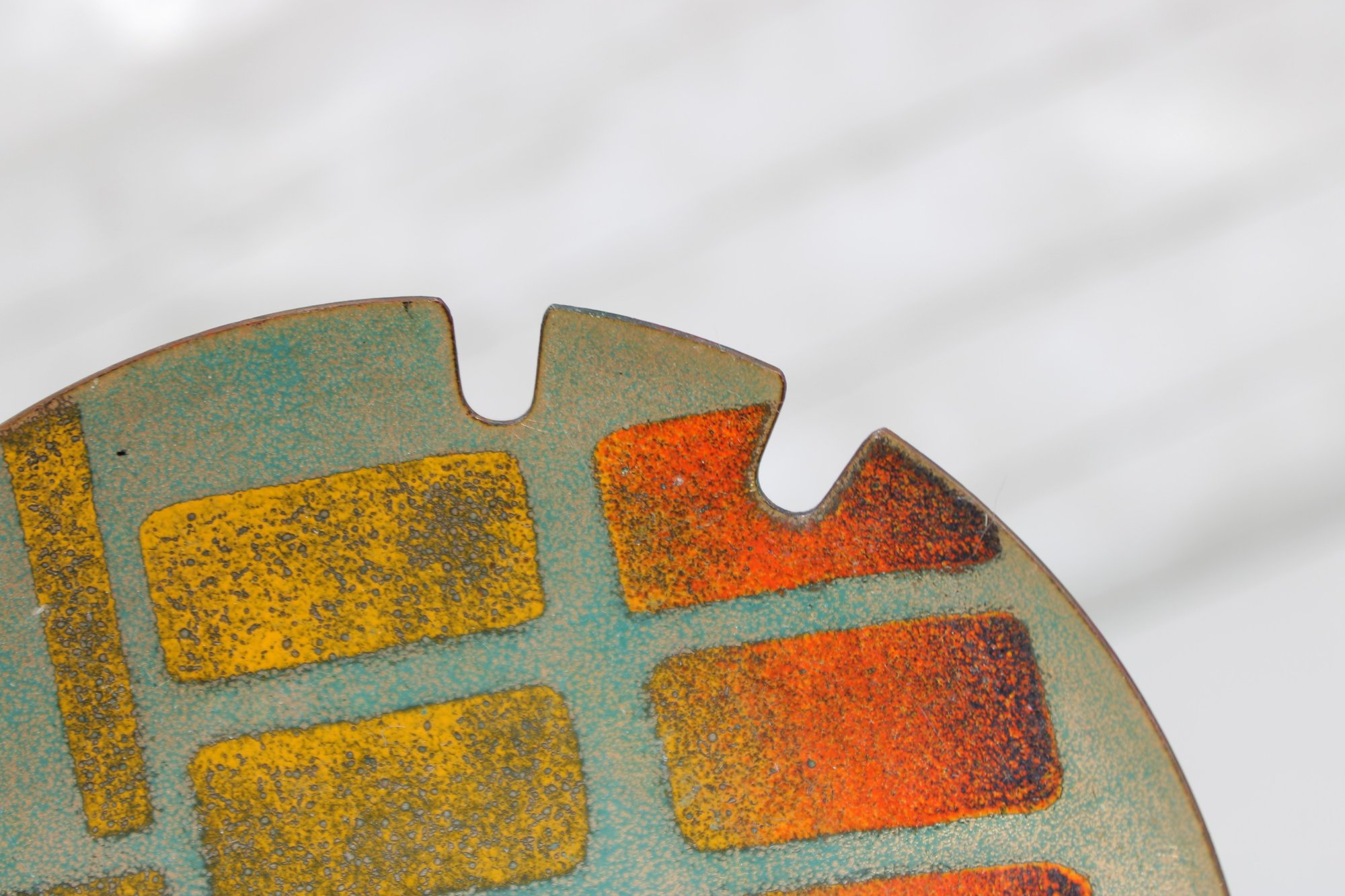The plate measures approximately 5.5” in diameter and has a gently curved form with a glossy enamel finish that enhances the layered colors and textures. The notched edge detail adds an interesting design element and visual appeal.