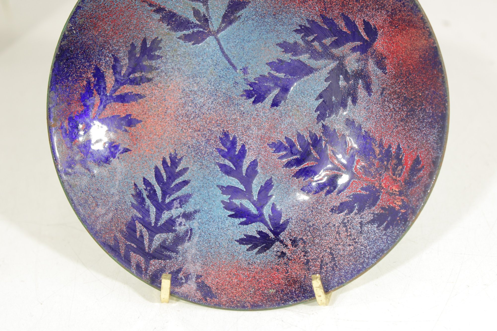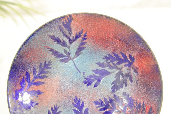 Beautiful vintage enamel on copper plate featuring an elegant leaf motif in deep purple tones set against a shimmering iridescent background of blue, pink, and copper hues. The delicate botanical design creates a soft, nature-inspired look with a striking mid-century artistic flair.