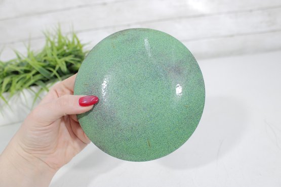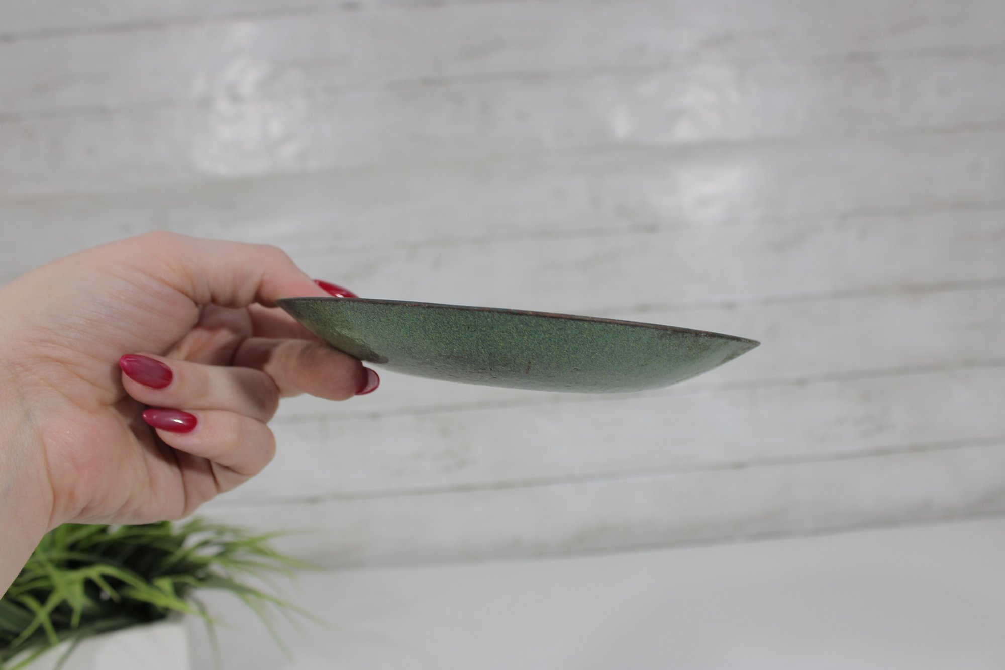 Measuring approximately 6” in diameter, this decorative plate has a gently curved form and a glossy enamel finish that reflects light beautifully, enhancing the layered colors and texture.