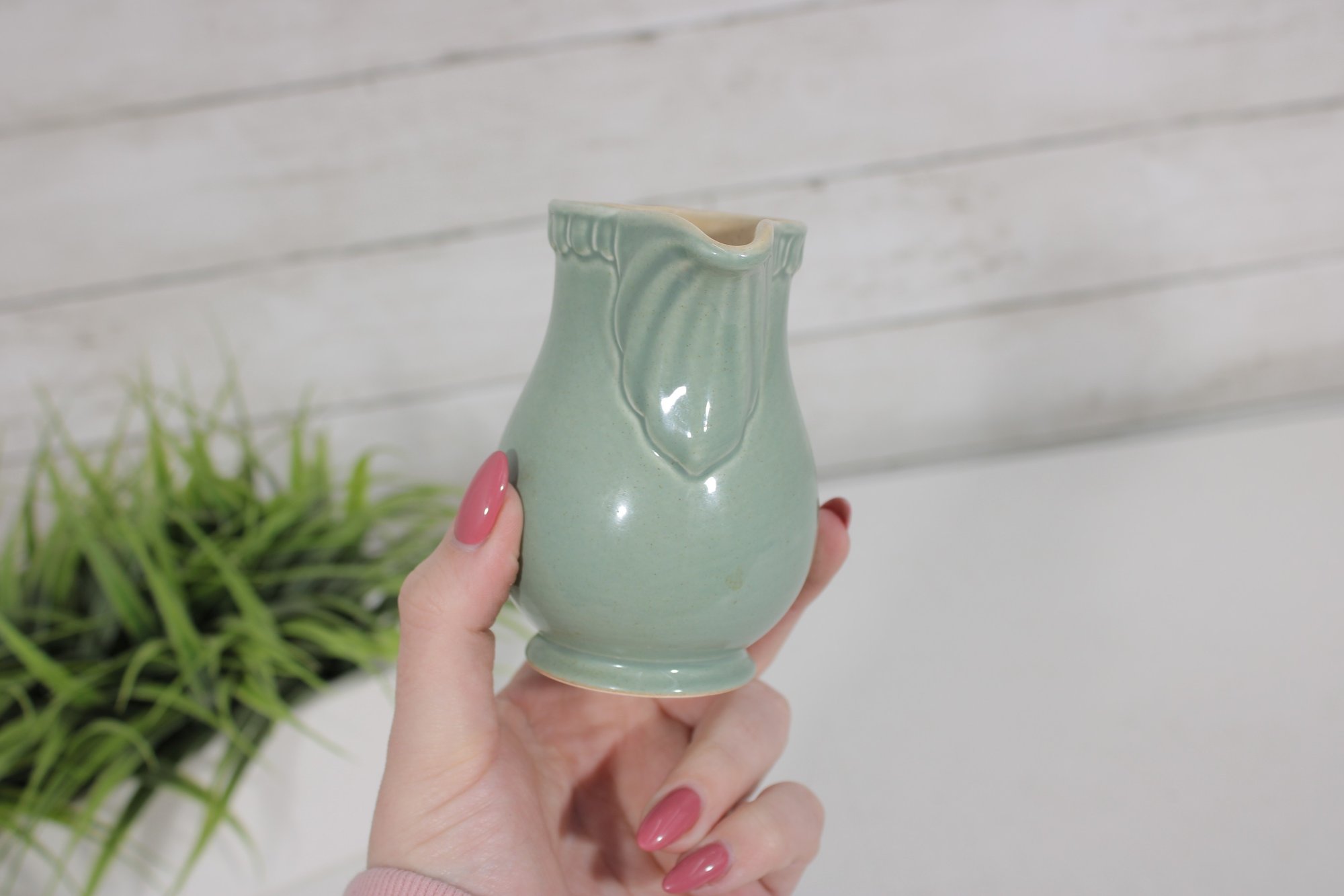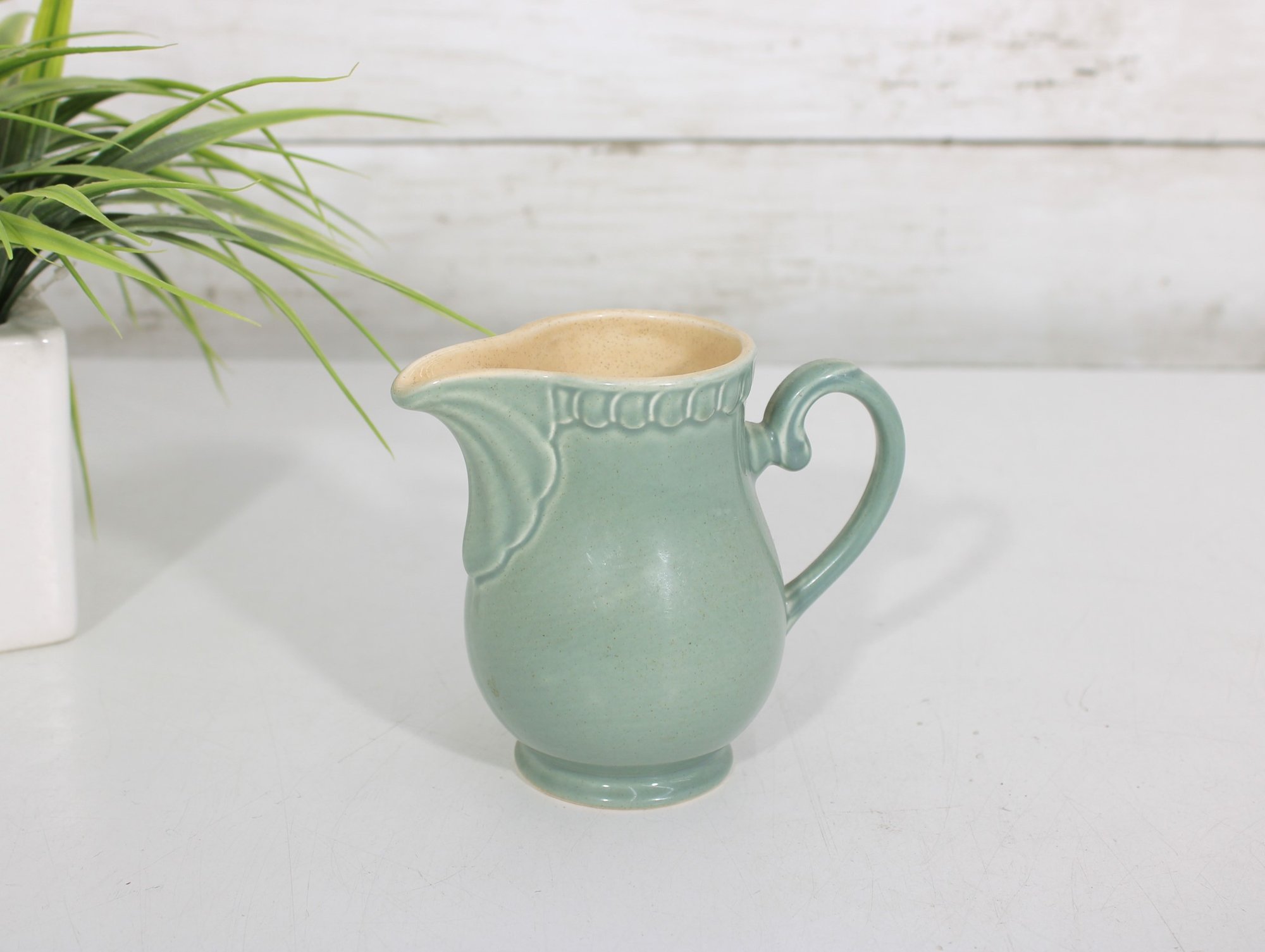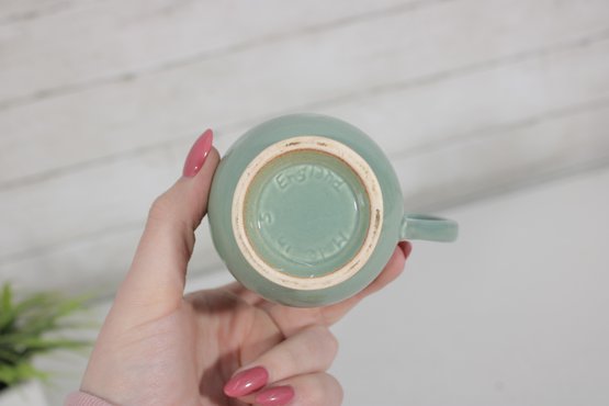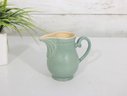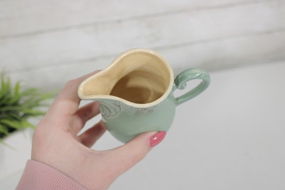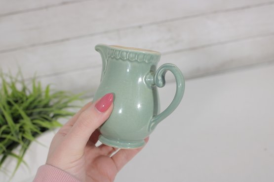 Charming vintage creamer pitcher crafted in England, featuring a soft green glaze and classic form. This petite ceramic piece showcases a gently curved body with subtle embossed detailing near the rim, a gracefully shaped spout, and a sturdy handle for easy pouring.
