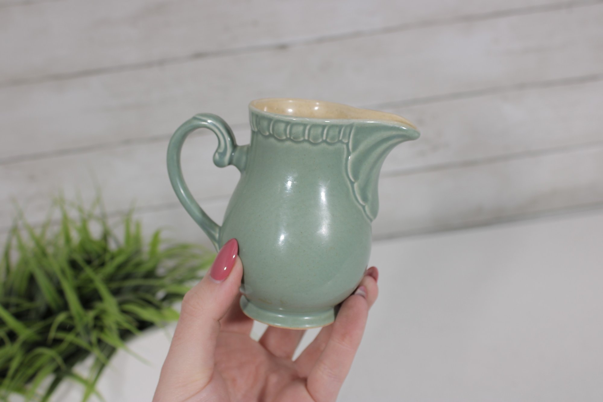 The interior is finished in a warm cream tone, nicely contrasting with the exterior glaze. Its timeless design makes it perfect for serving cream or milk, or as a decorative accent in a farmhouse or cottage-style kitchen.