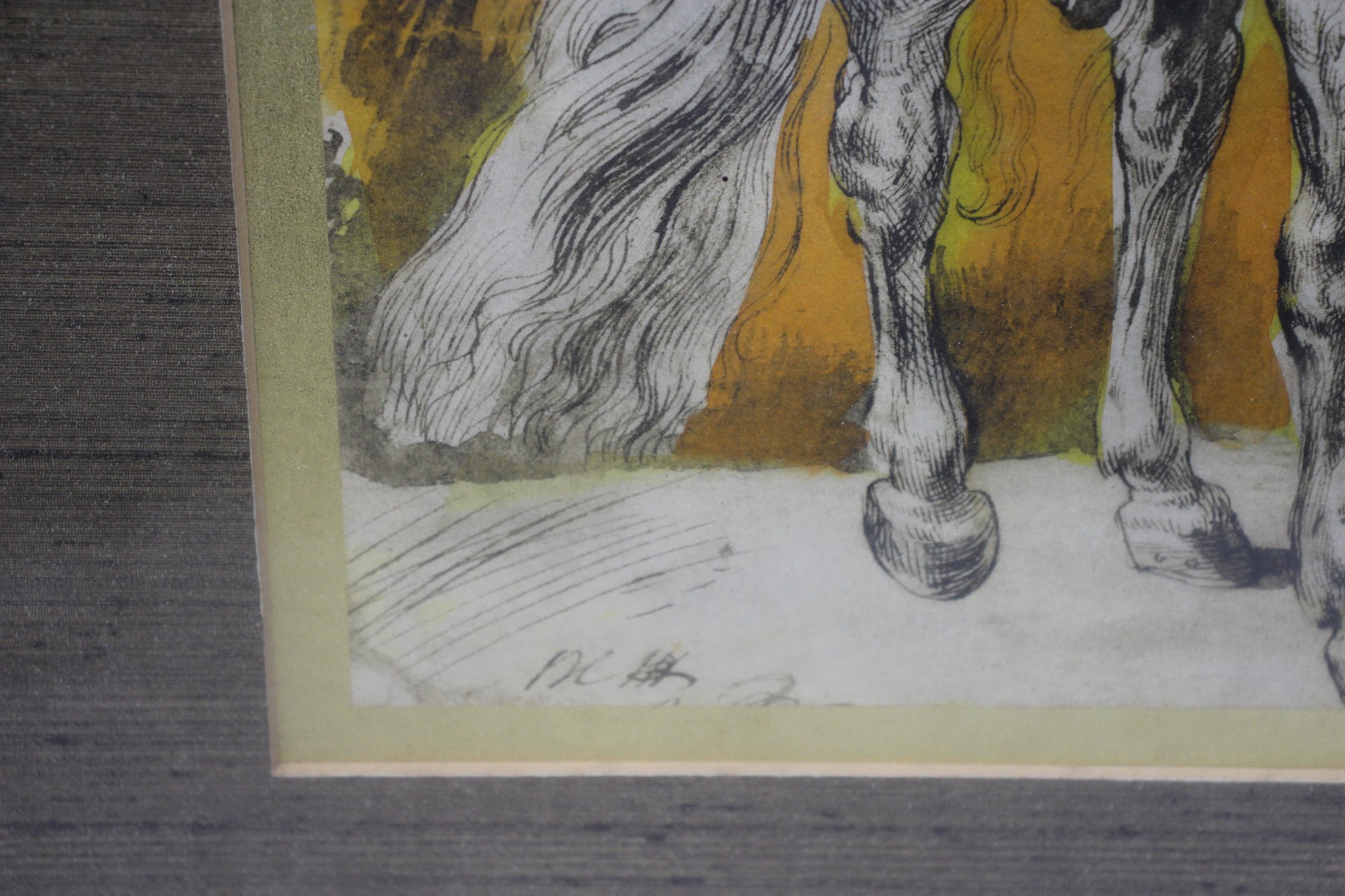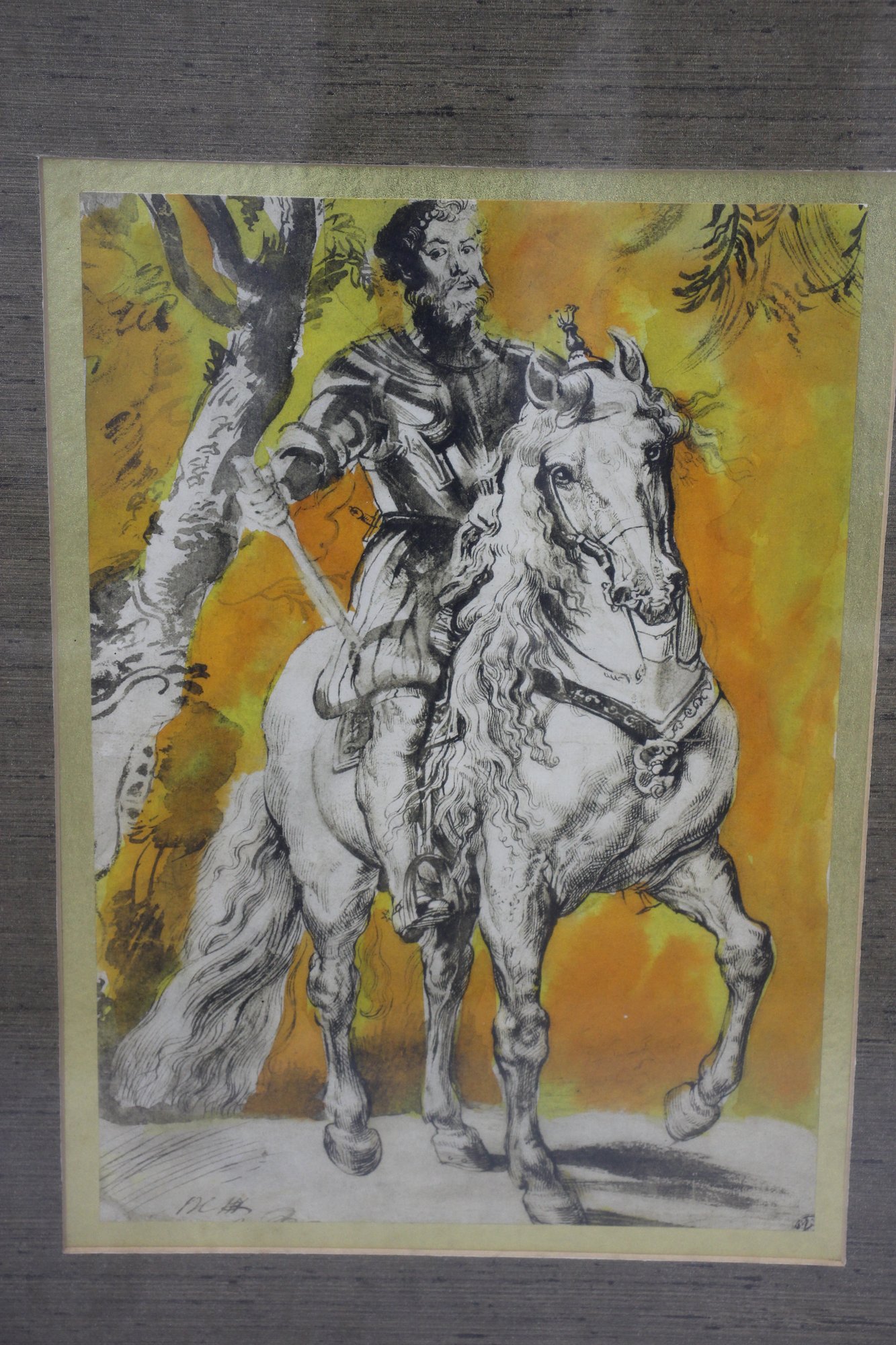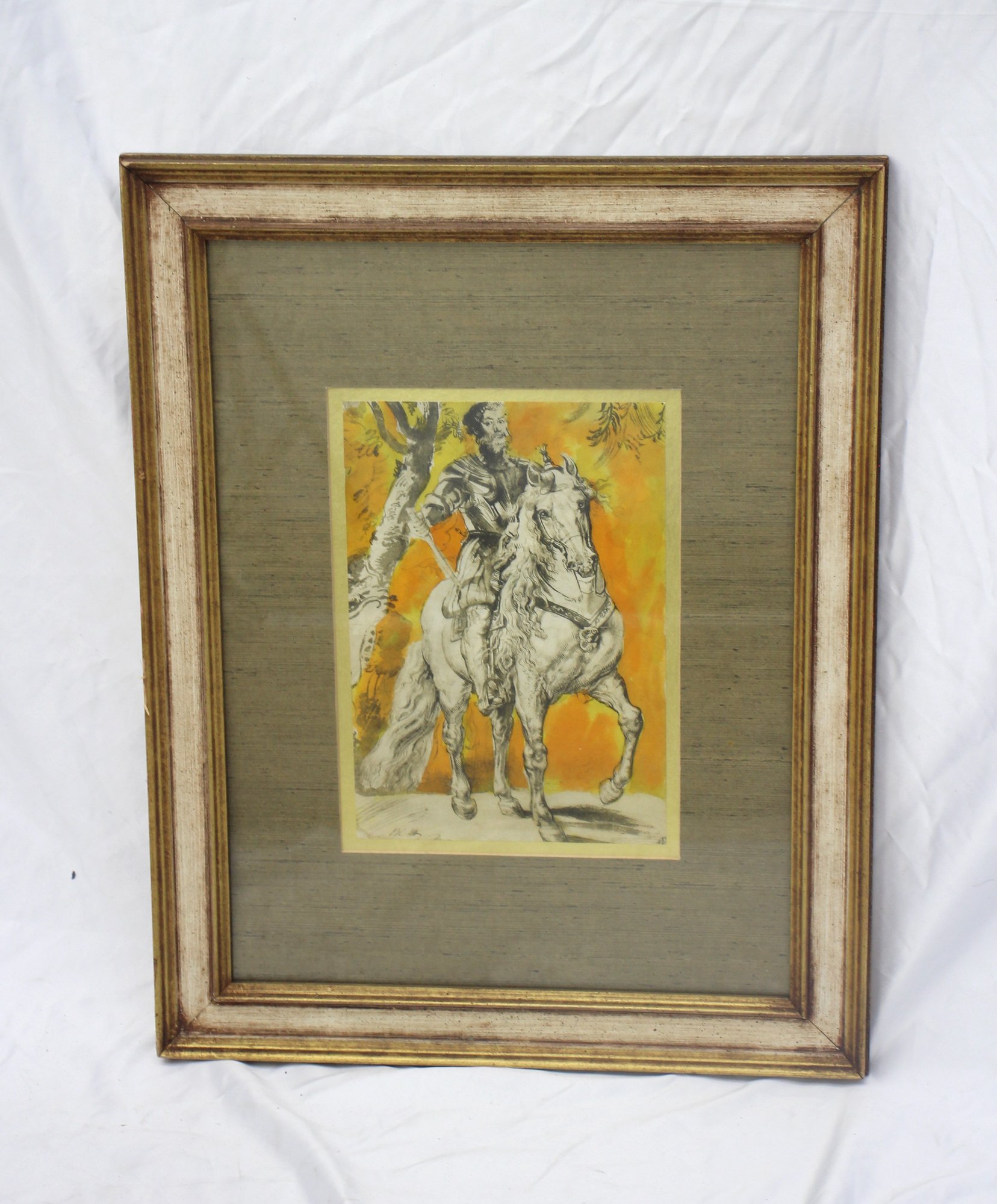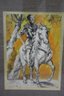 This striking vintage print features a bold depiction of a warrior on horseback, masterfully illustrated with intricate detail and set against a dynamic golden-orange background. The artwork combines fine line work with expressive color, creating a powerful and commanding composition.