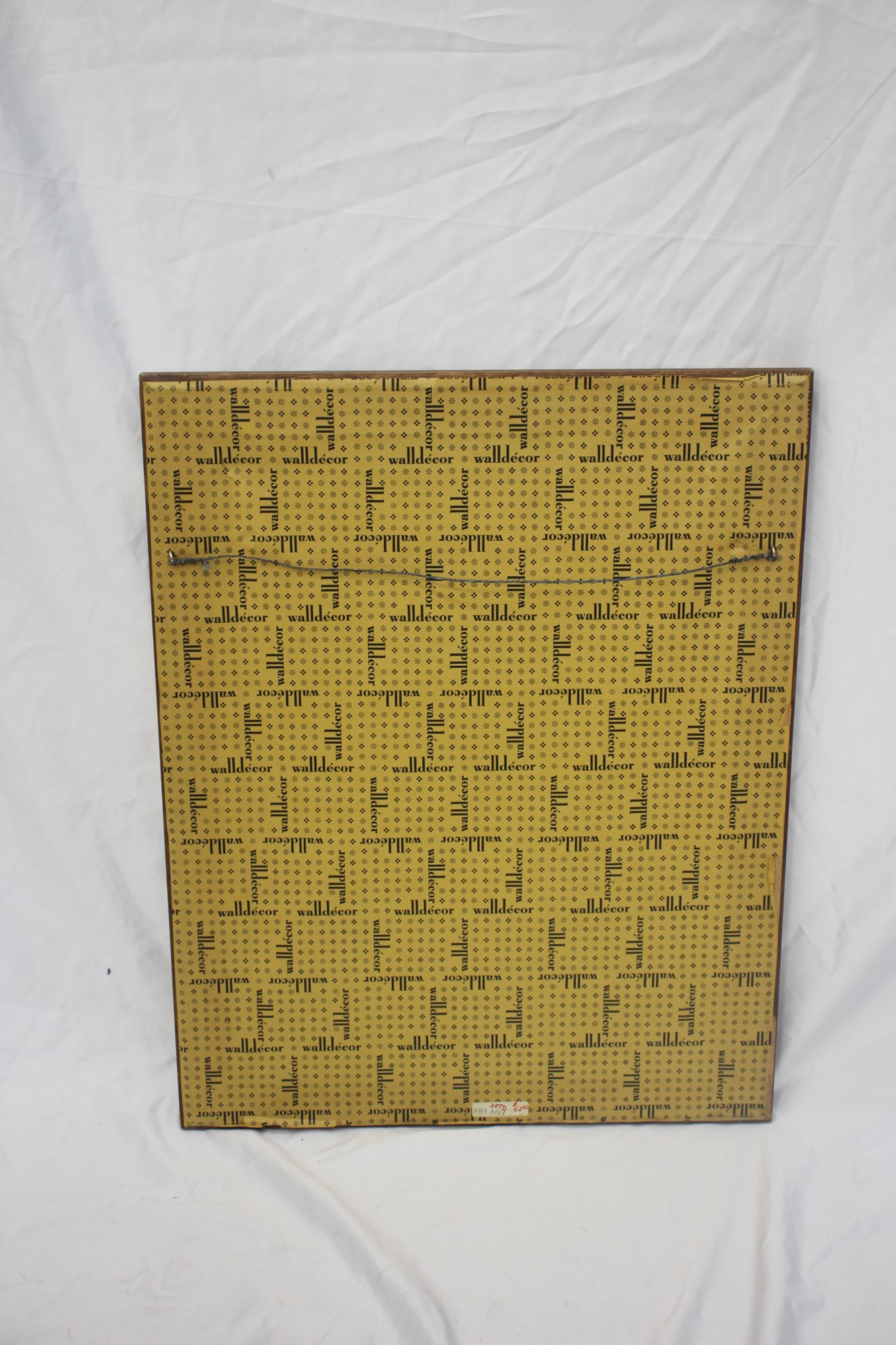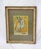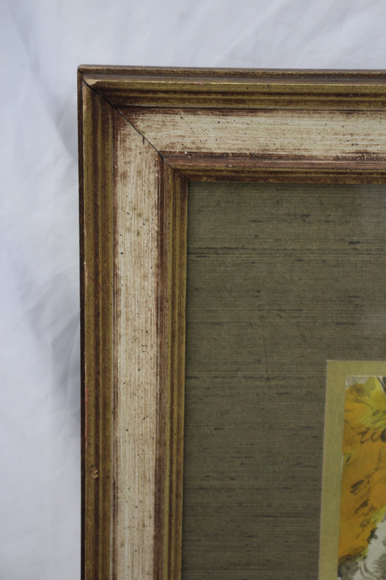Measuring 23.5 inches in height and 18 inches in width, this piece is elegantly framed with a textured linen mat and a distressed gold and cream-toned wooden frame, enhancing its vintage charm. The artist’s signature is visible in the lower corner, adding to its authenticity and collectible value.