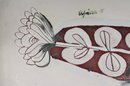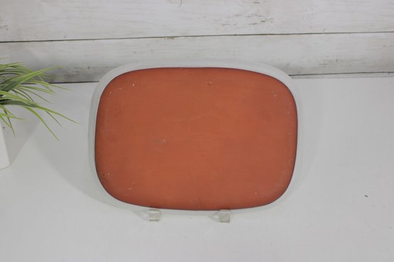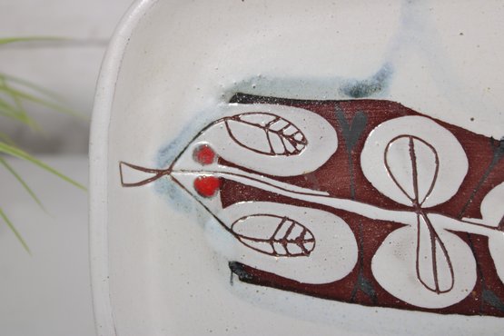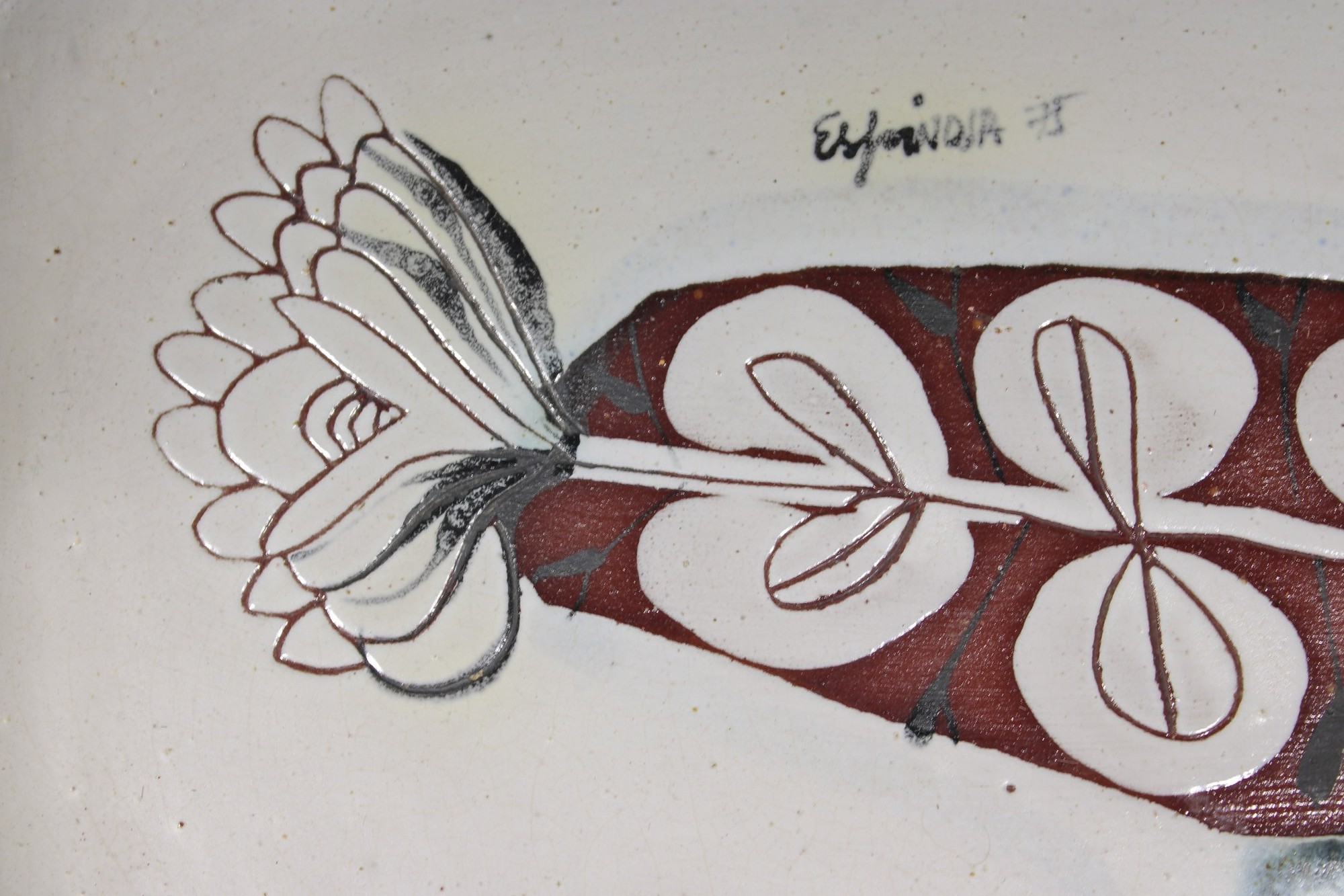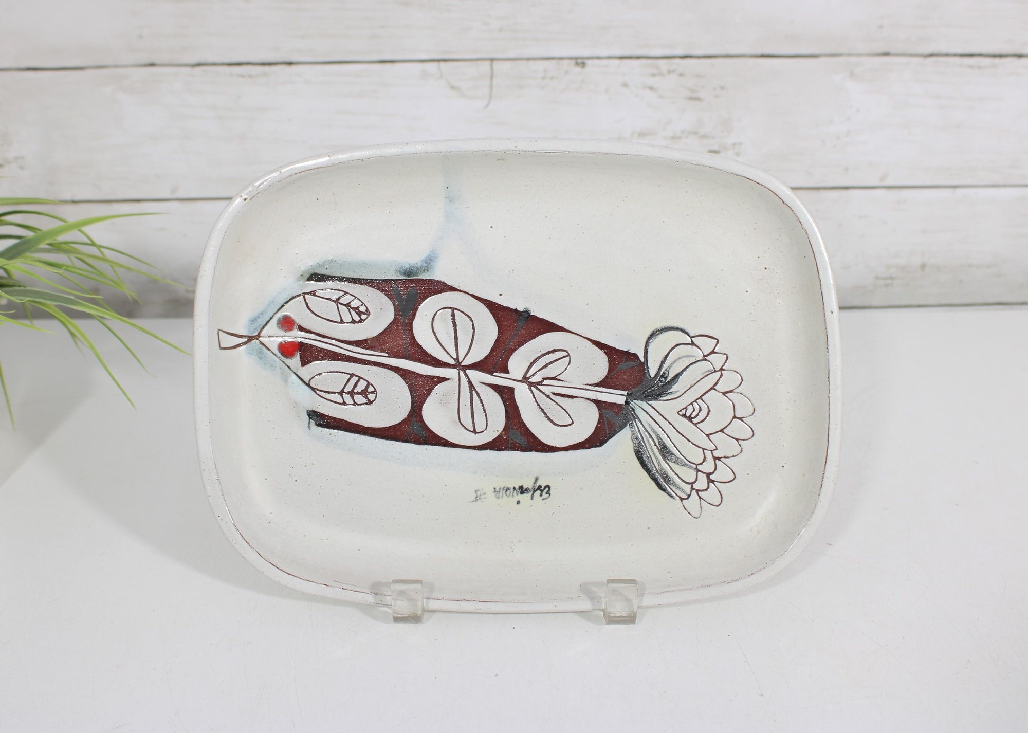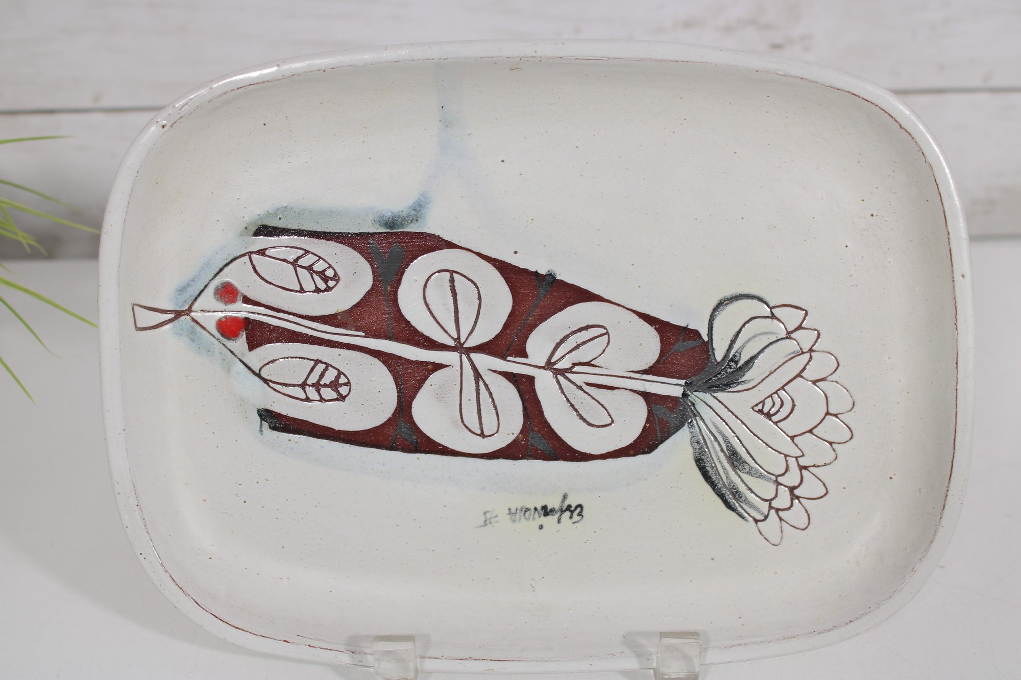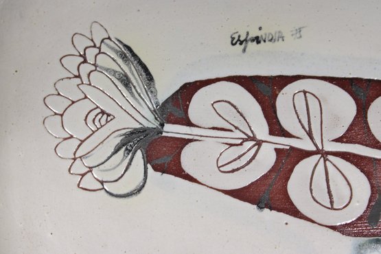 vintage studio pottery plate signed “Espinoza ’95,” featuring a bold, hand-painted mid-century modern design. The plate measures approximately 10.5" x 8" and showcases an abstract botanical motif in rich earthy tones of red, black, and white, accented with subtle blue highlights.