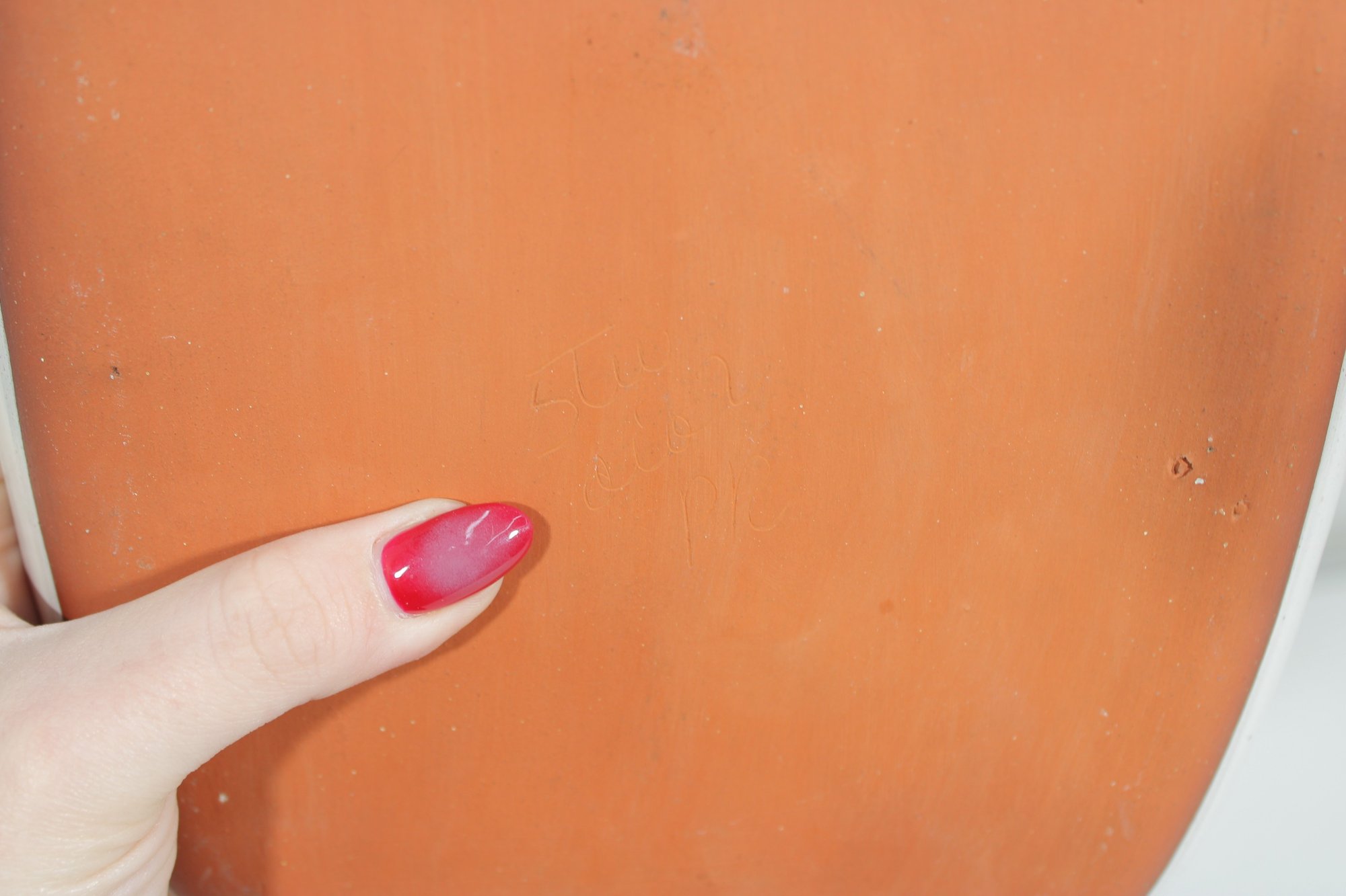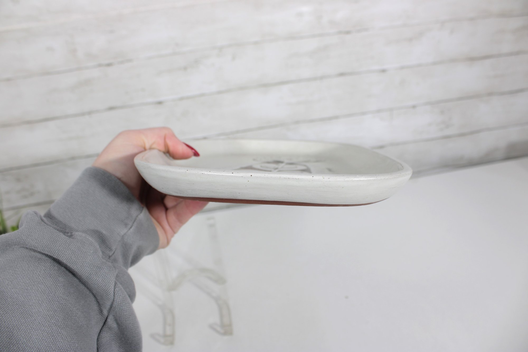 The design is beautifully executed with a combination of clean lines and organic shapes, giving the piece a unique artistic presence. The front has a smooth glazed finish, while the underside is unglazed in natural terracotta clay, typical of studio pottery craftsmanship.
