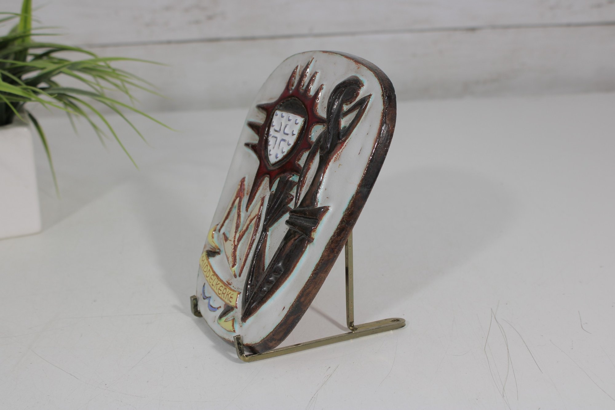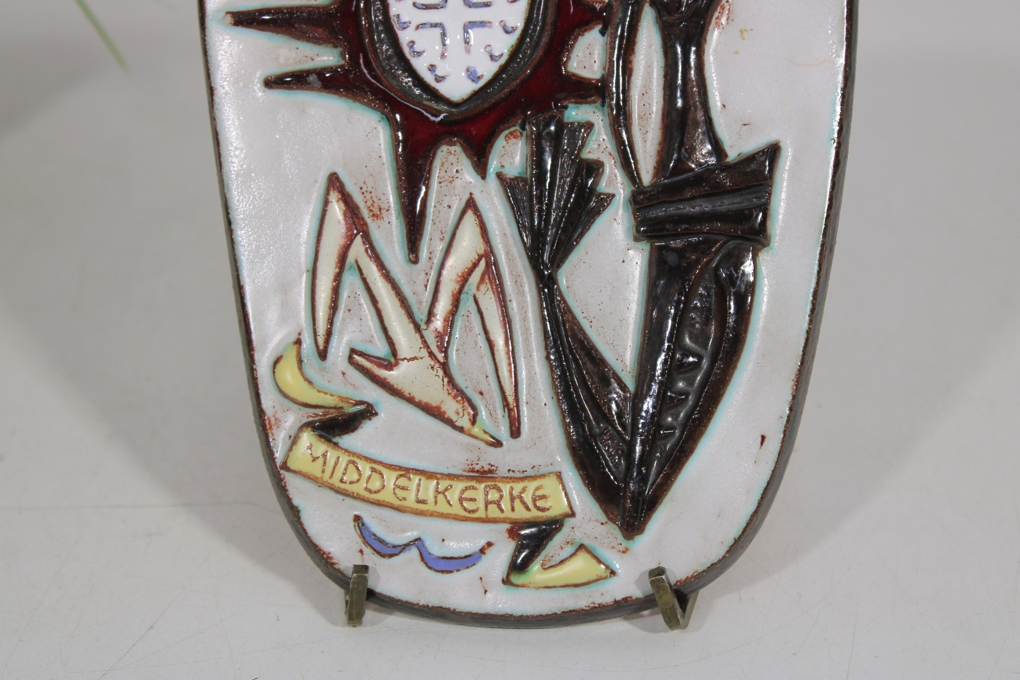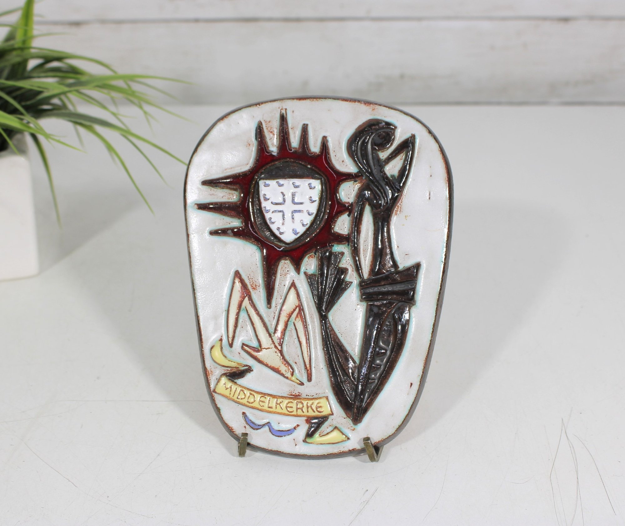 vintage European art pottery wall plaque, featuring a bold, hand-painted design with a crest, stylized figures, and the inscription “Middelkerke”—a coastal town in Belgium.