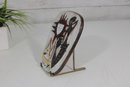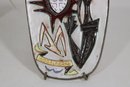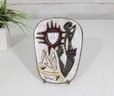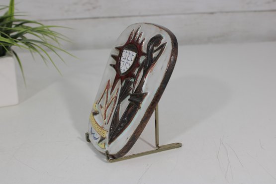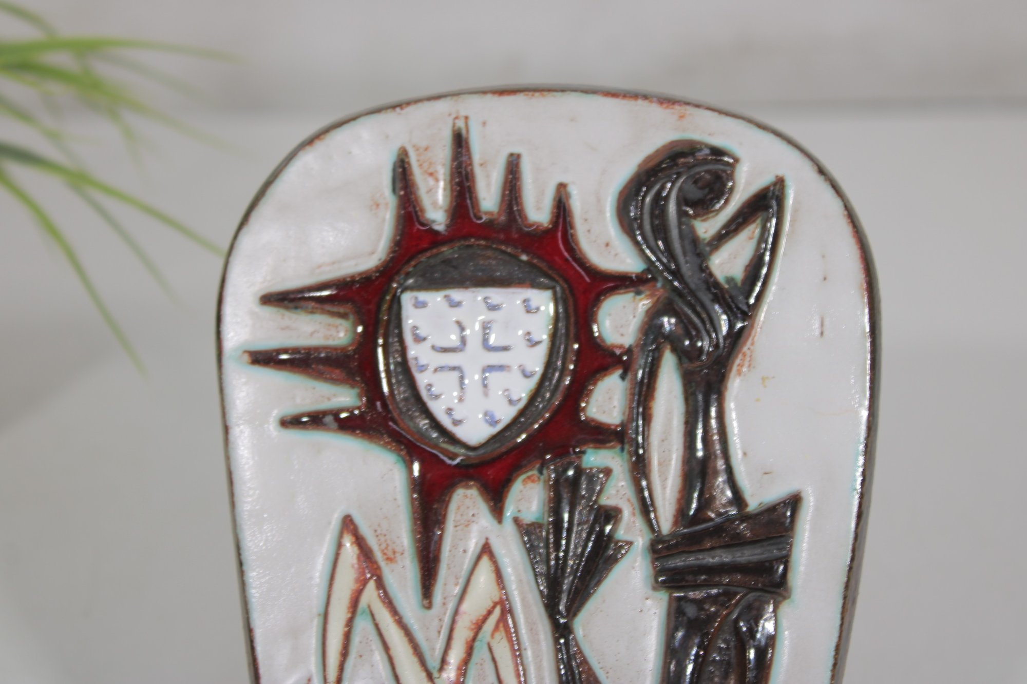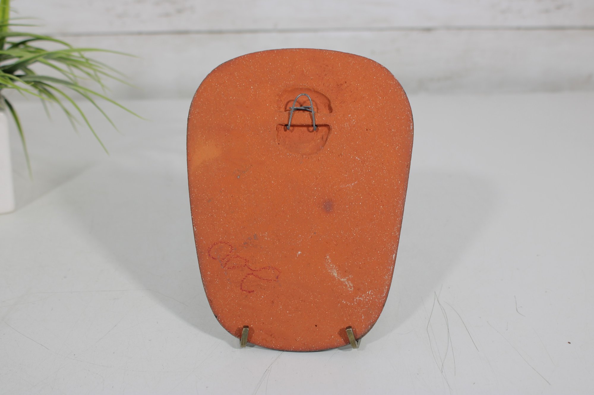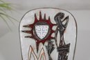 This decorative piece showcases raised relief detailing with rich earthy tones of red, brown, cream, and soft accent colors. The expressive design and textured glaze give it a distinctive mid-century European folk art appeal.