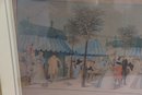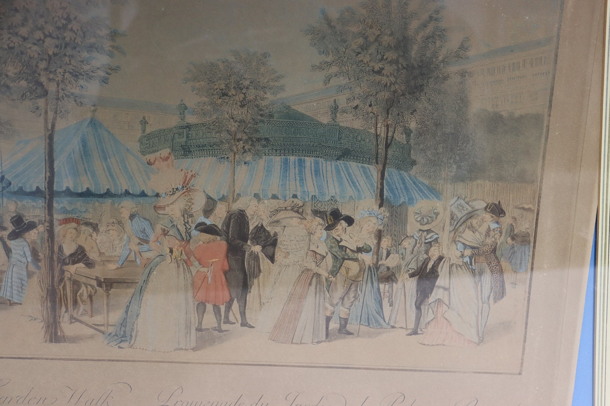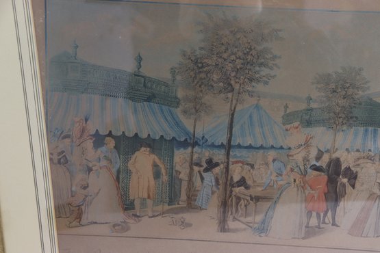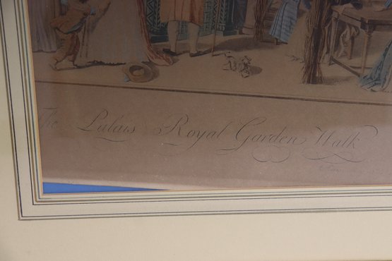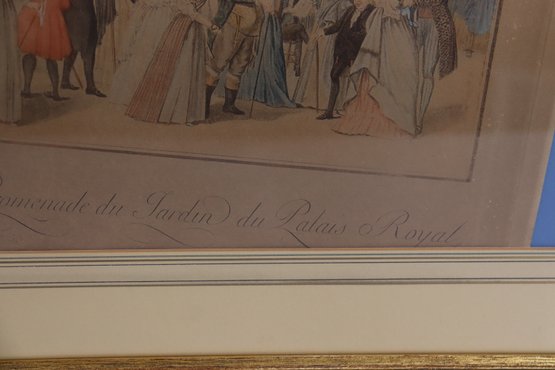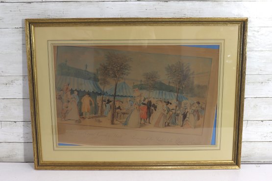 a decorative vintage-style print depicting an elegant French royal garden scene, showing well-dressed figures strolling, conversing, and socializing among trees and pavilion tents. The artwork captures the refined leisure of a historic European park setting, with soft colors, detailed costumes, and a balanced, panoramic composition.