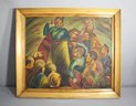 The artwork vividly depicts a dynamic crowd scene, rich with movement and emotion, and is framed in a sturdy wooden frame that complements the painting’s bold colors and dramatic composition.
