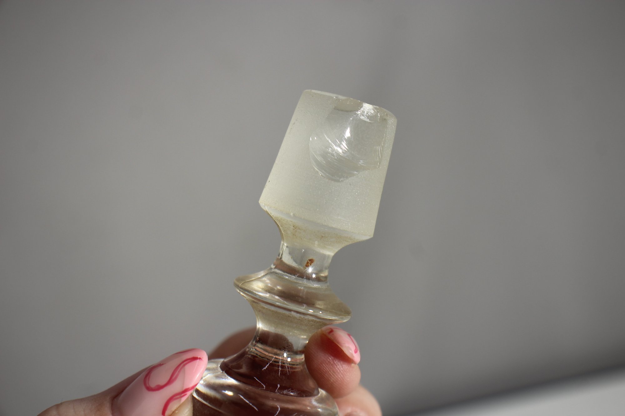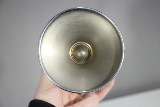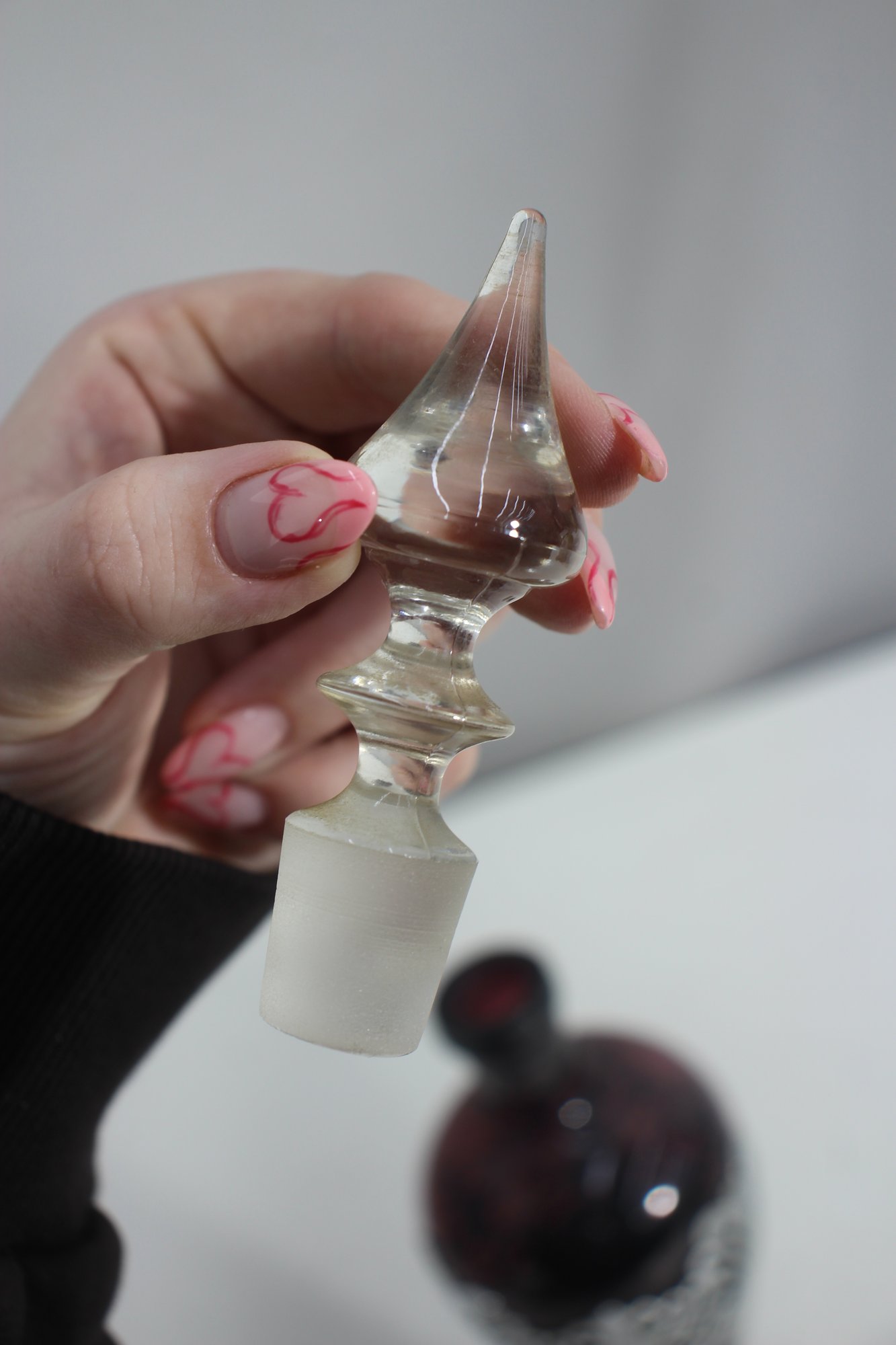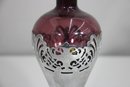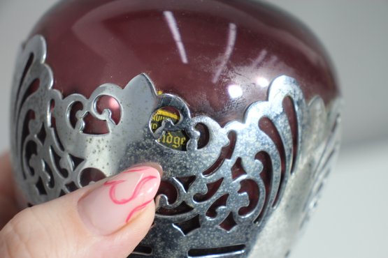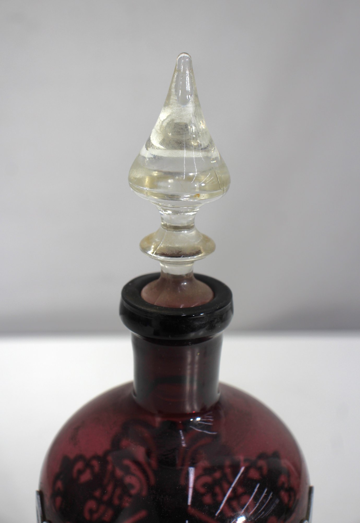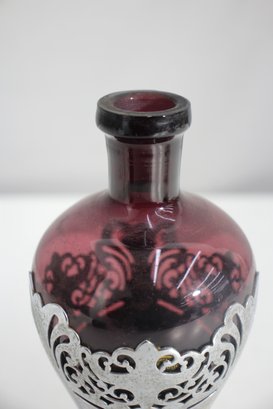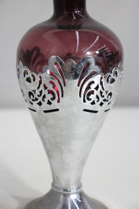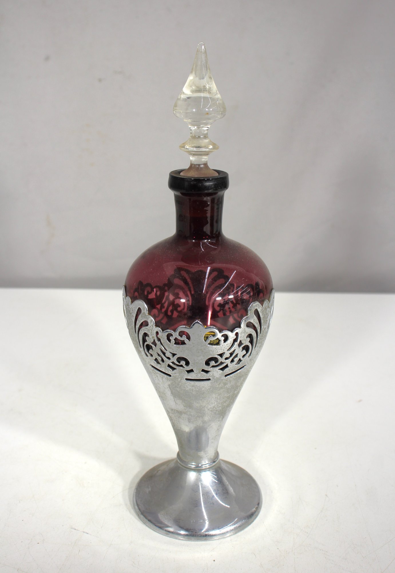 This stunning vintage Farber Bros decanter features a rich amethyst glass body encased in an intricate chrome overlay. Complete with its original faceted glass stopper, this elegant piece is a timeless example of Art Deco or Mid-Century barware design.
