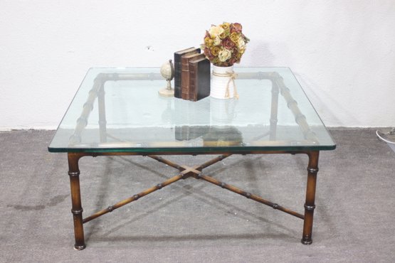 vintage-style faux bamboo coffee table featuring a sturdy metal frame and a thick glass top. This elegant piece blends classic design with modern functionality, making it perfect for any home or office.