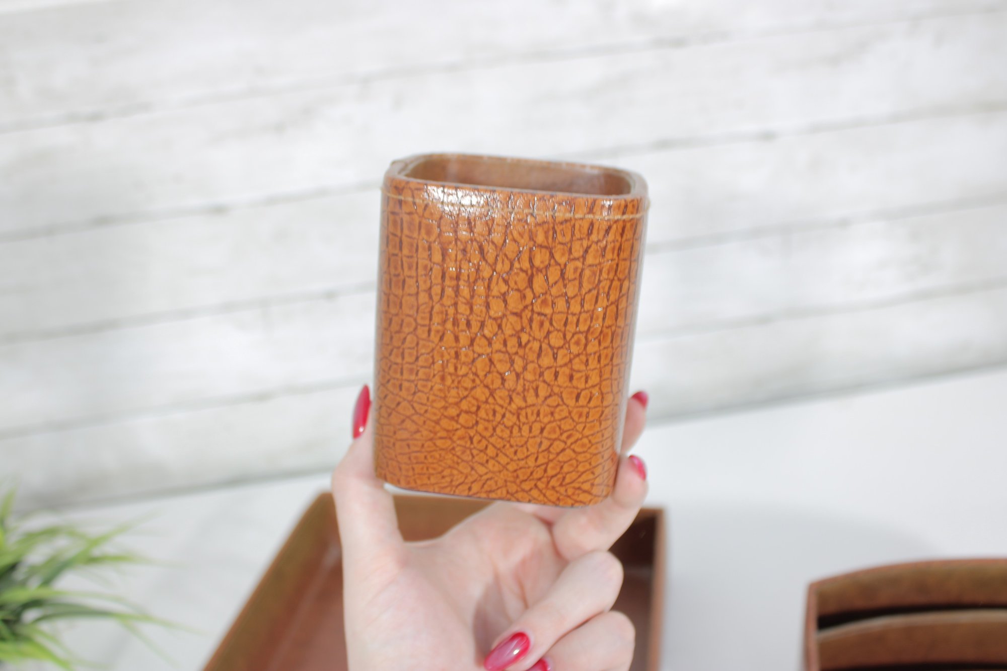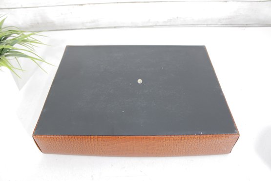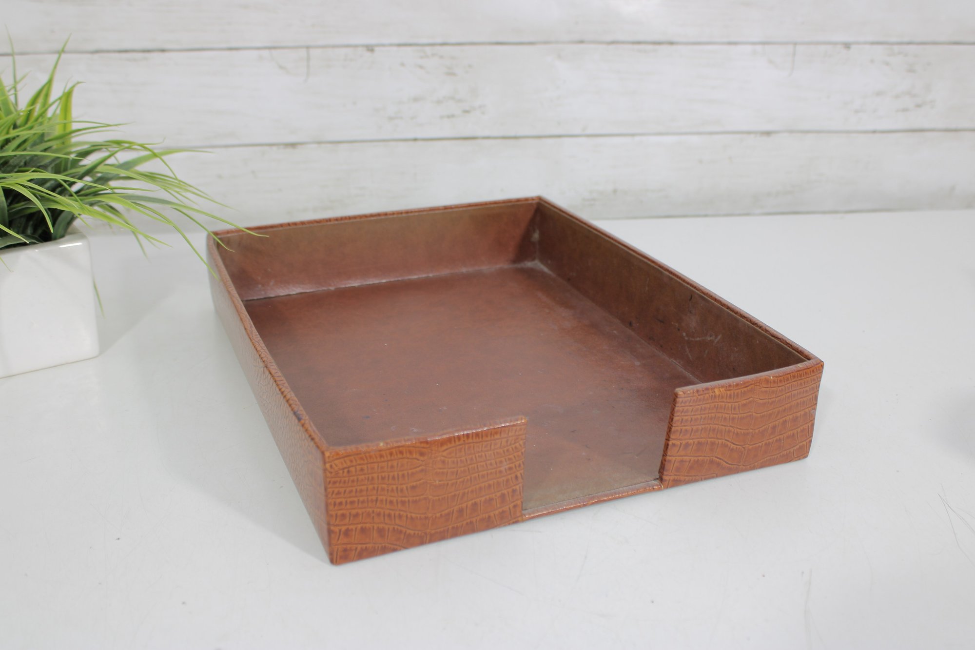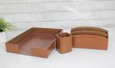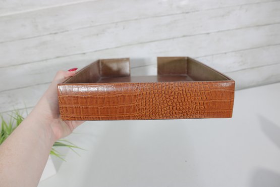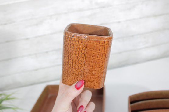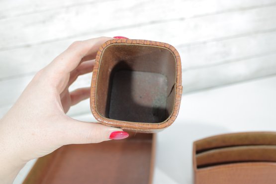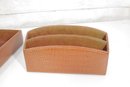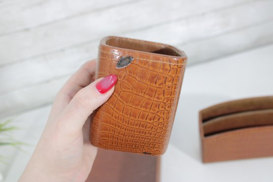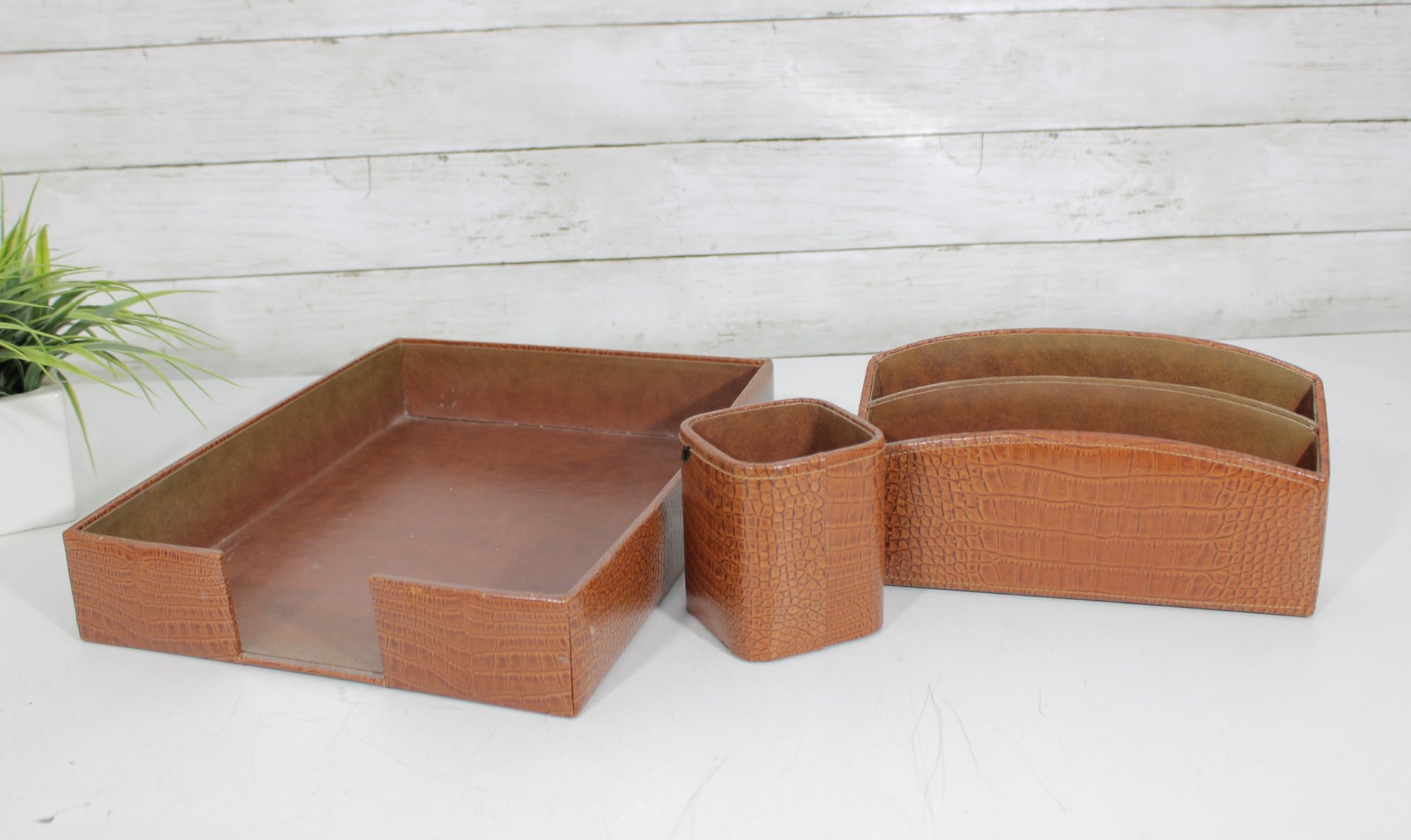 Classic vintage desk set featuring a coordinated faux crocodile leather finish in a warm tan tone. This three-piece set includes a letter tray, a divided organizer, and a pen/pencil holder, offering both style and functionality for any workspace.