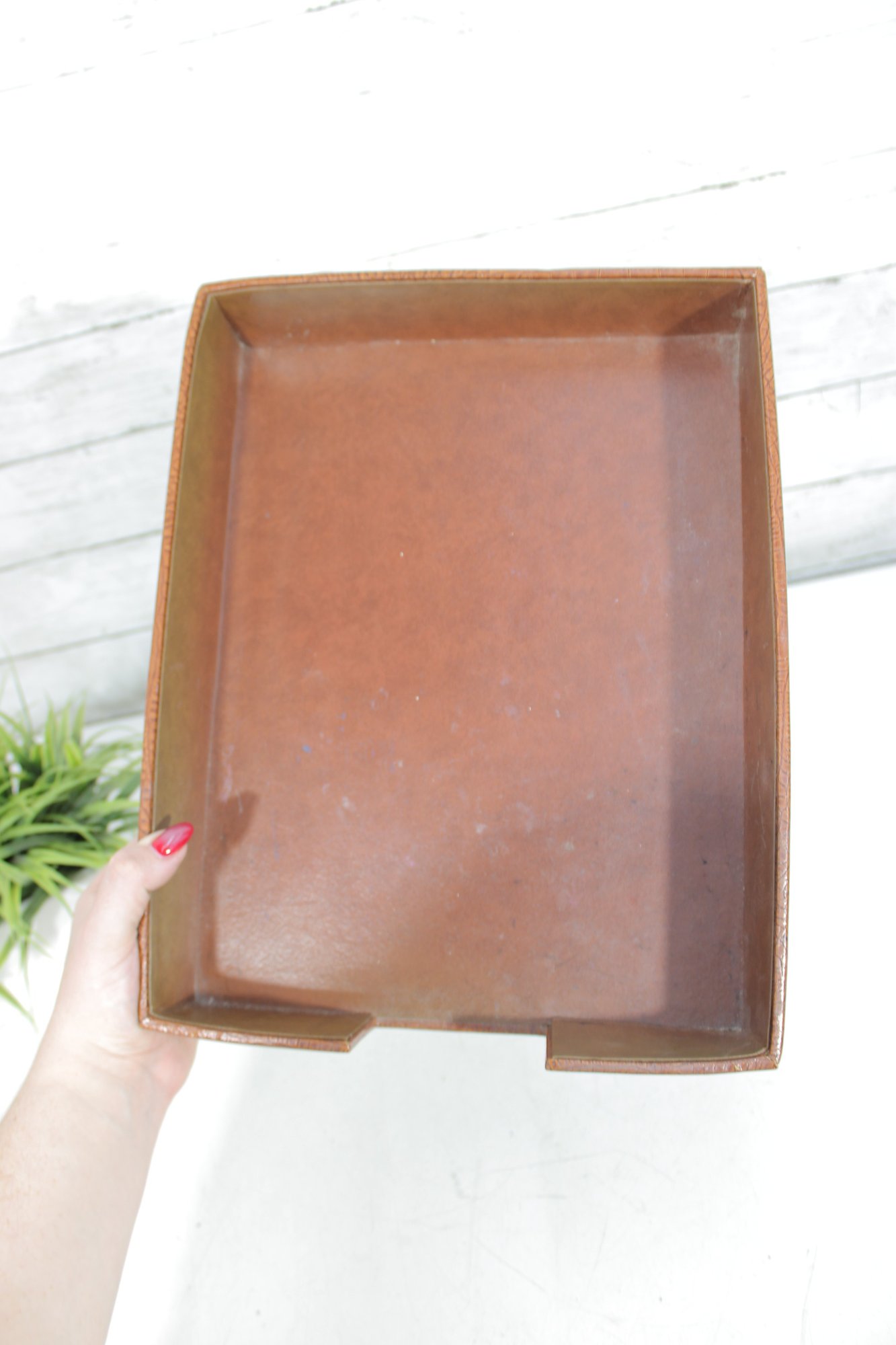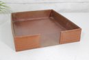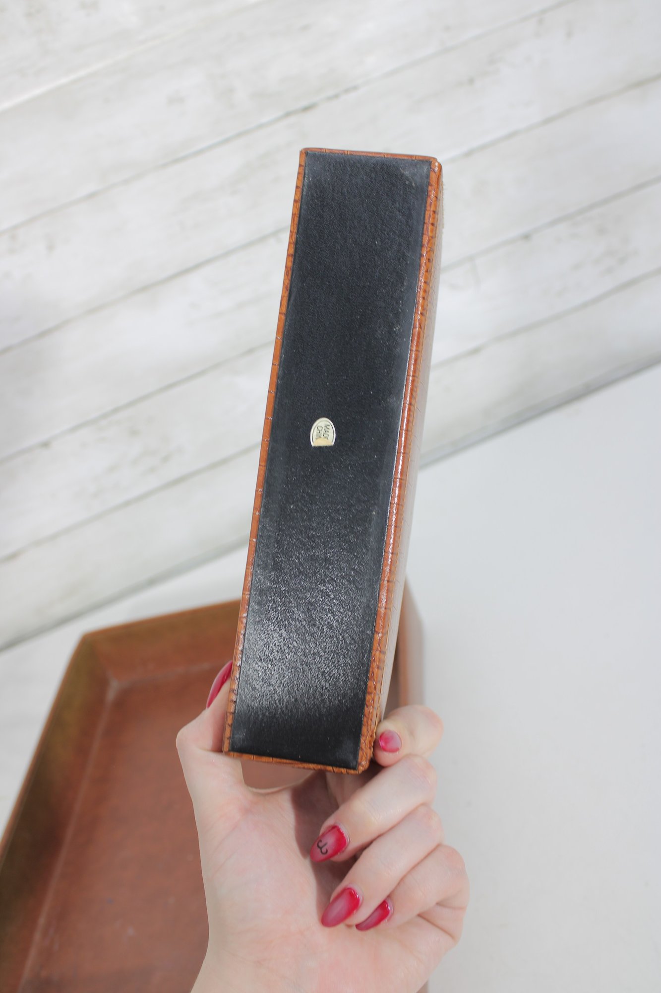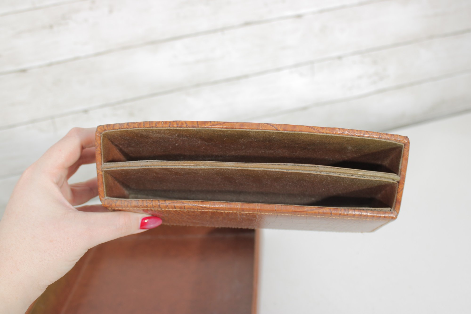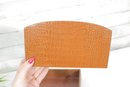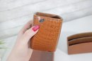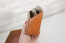 Classic vintage desk set featuring a coordinated faux crocodile leather finish in a warm tan tone. This three-piece set includes a letter tray, a divided organizer, and a pen/pencil holder, offering both style and functionality for any workspace.