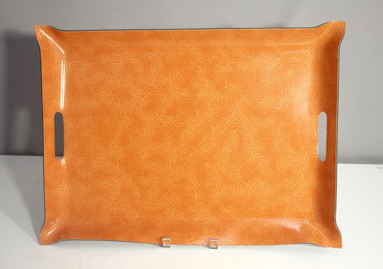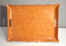 This stylish vintage serving tray features a rich brown faux leather texture with a sleek curved edge design. Measuring 15 inches by 21 inches, this mid-century modern tray is perfect for serving drinks, displaying decor, or organizing a coffee table setup.