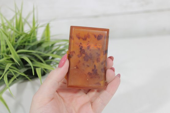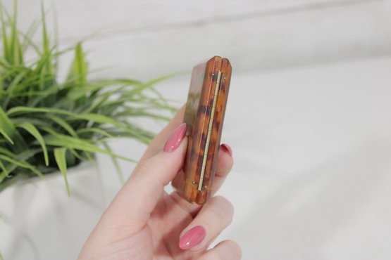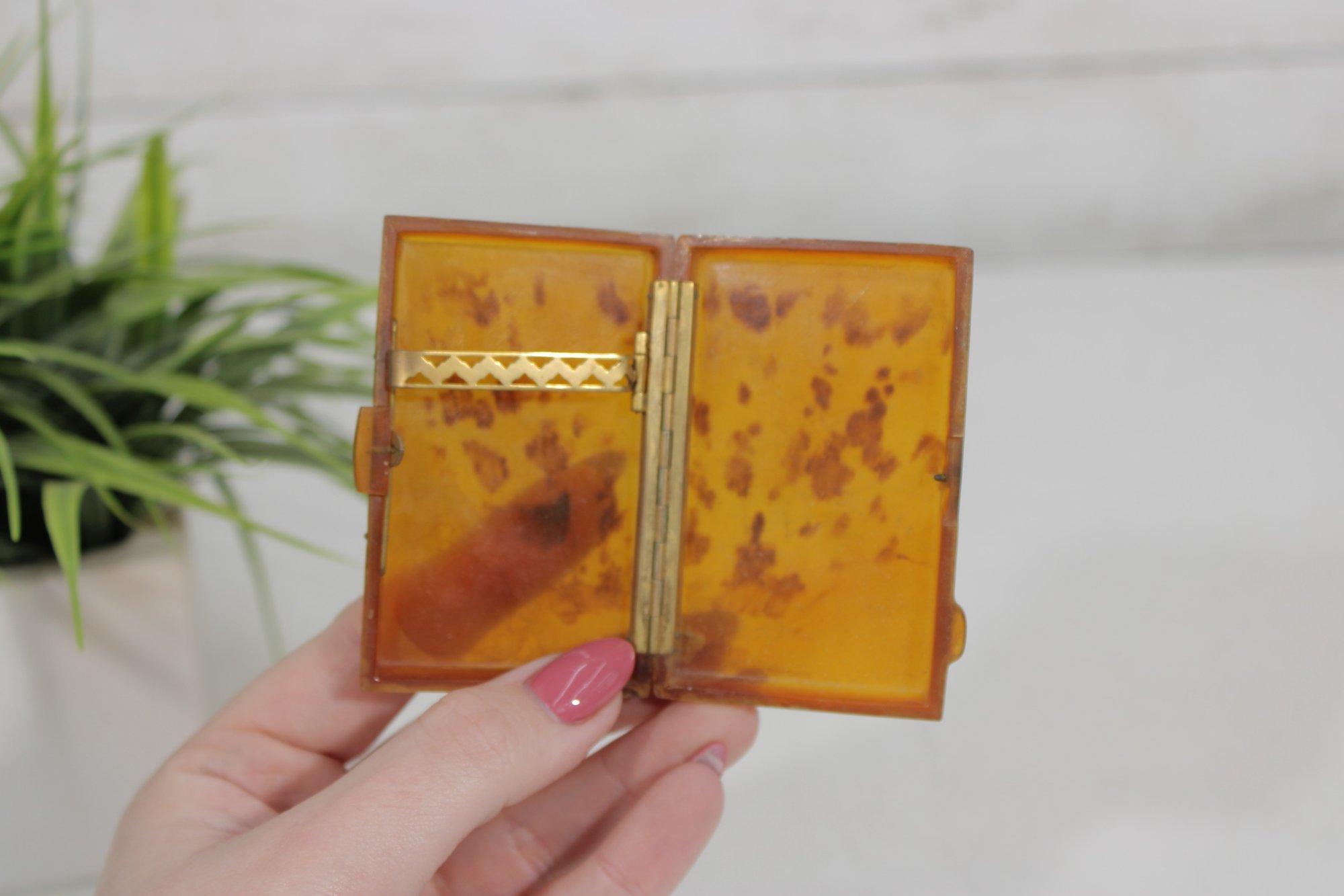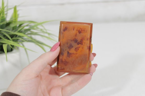 Attractive vintage card holder case featuring a classic faux tortoiseshell (amber mottled) design. The warm translucent tones and speckled pattern give the piece the look of traditional tortoiseshell while being made from early plastic such as Lucite or celluloid.